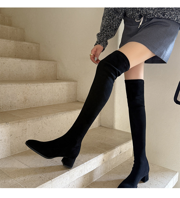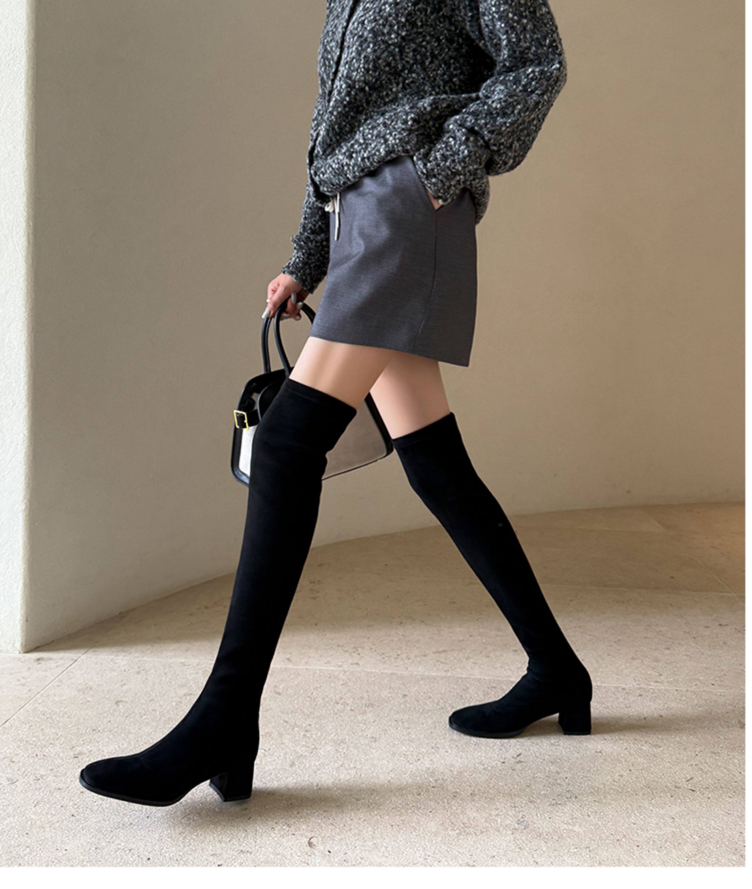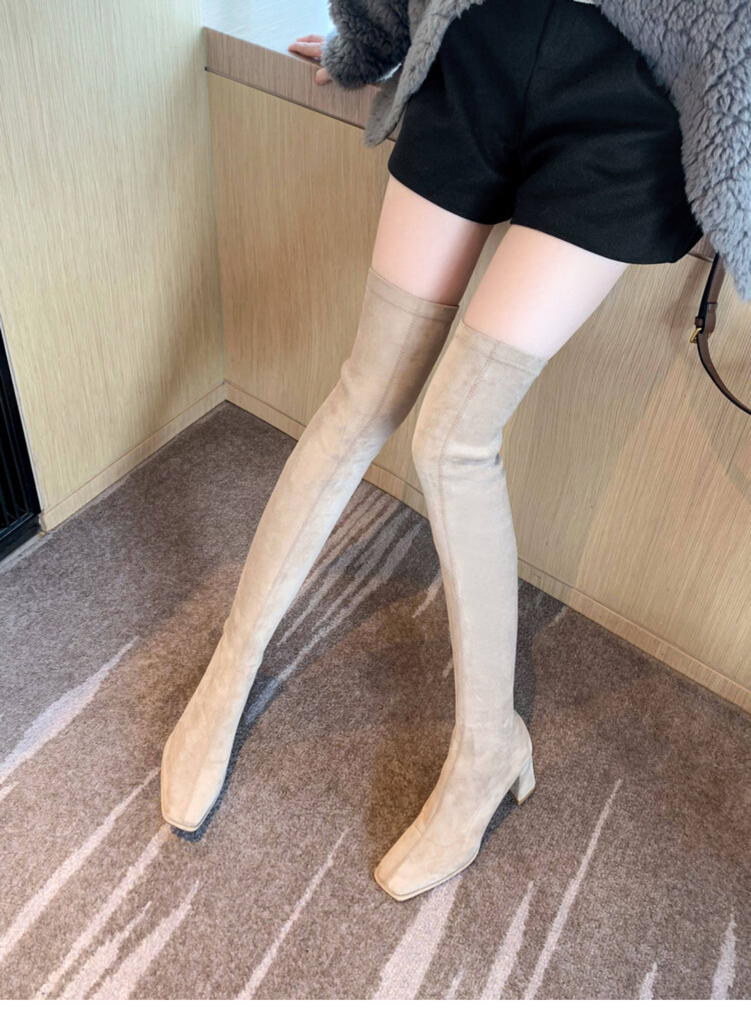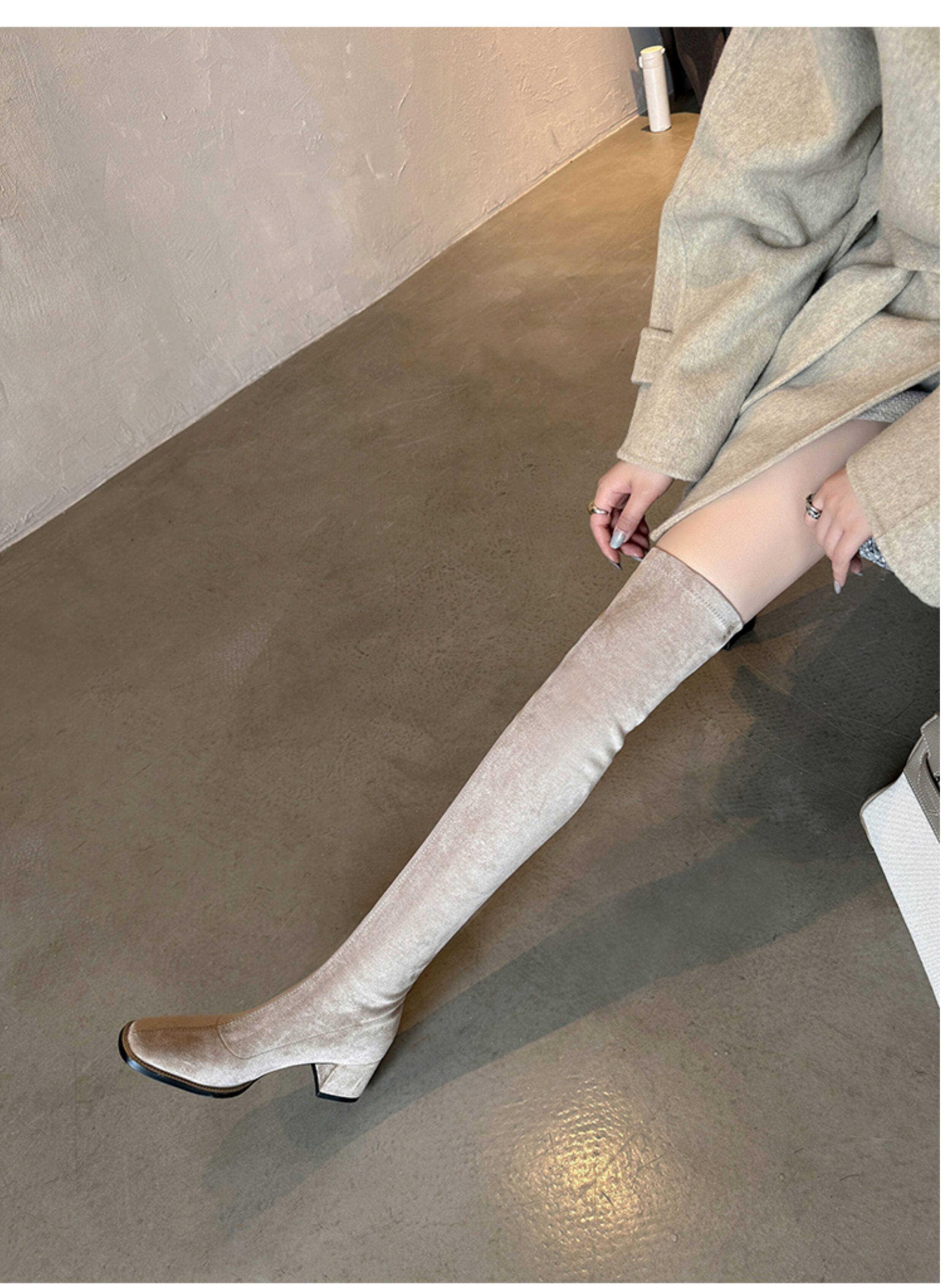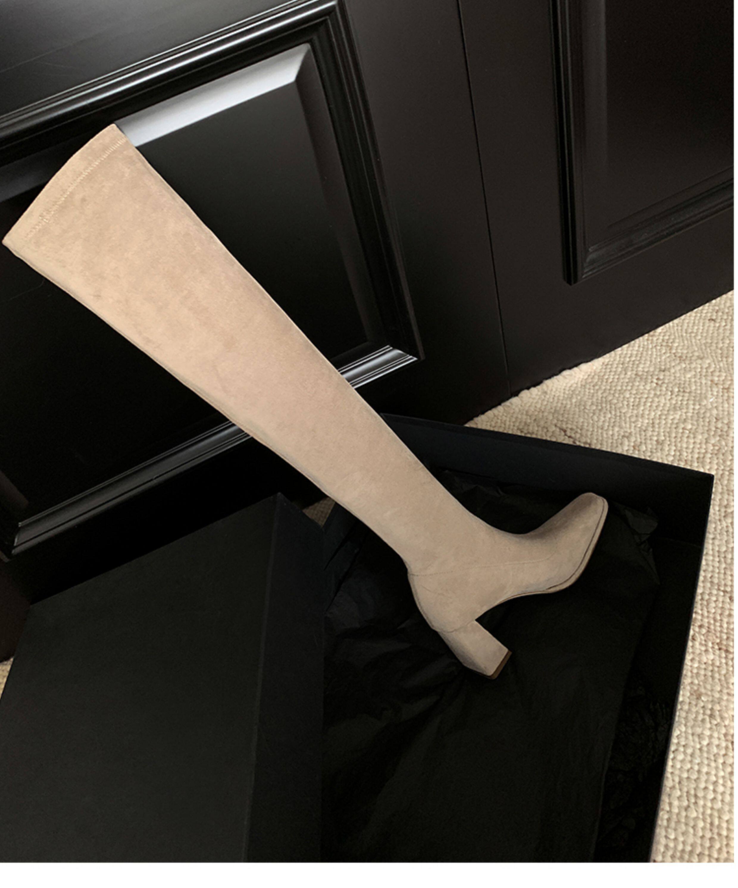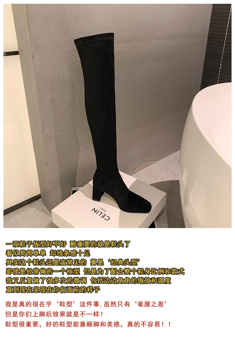 西魚許5050方頭粗跟瘦腿過膝長靴女高跟高筒靴秋冬顯瘦彈力長筒靴