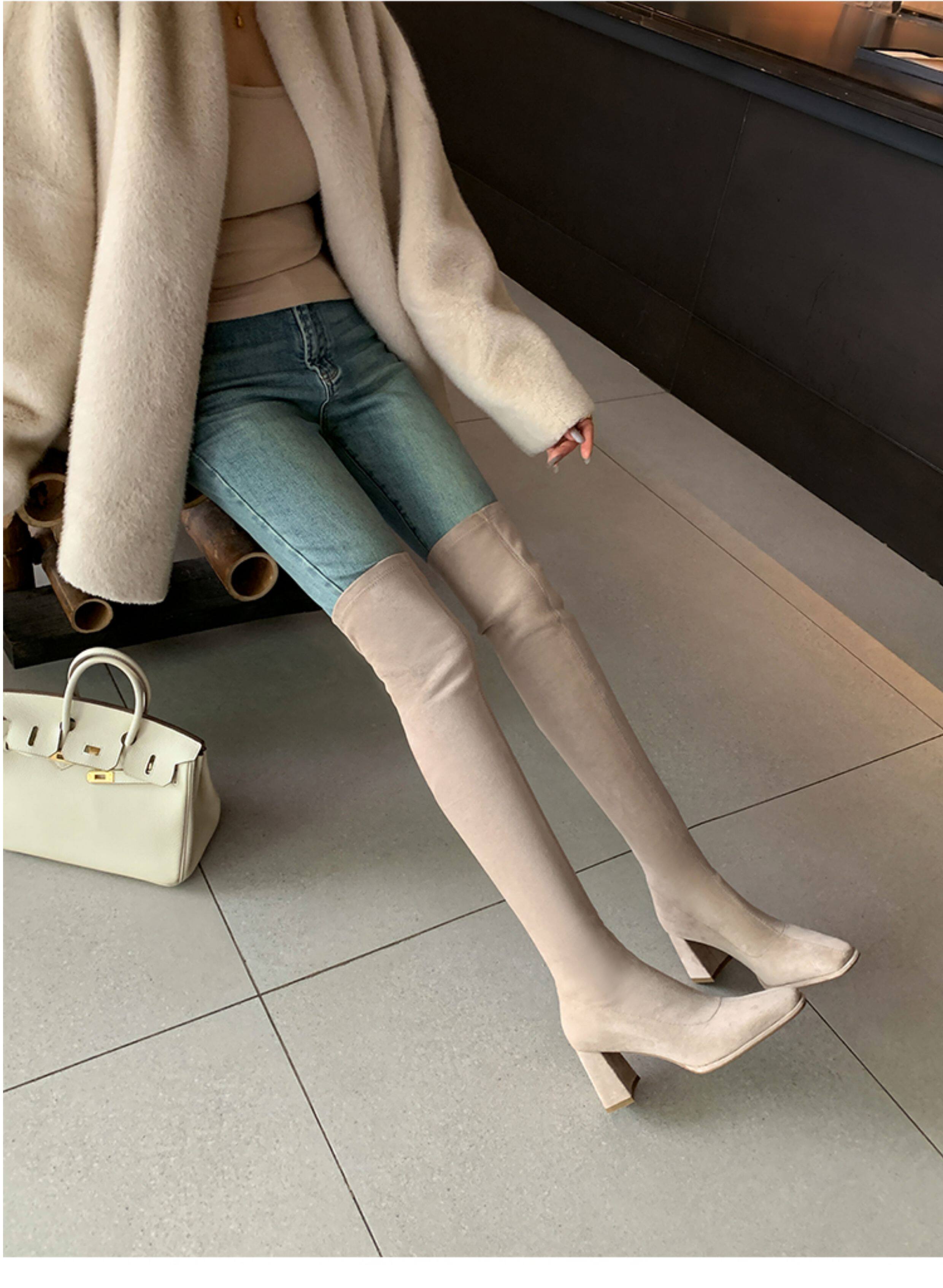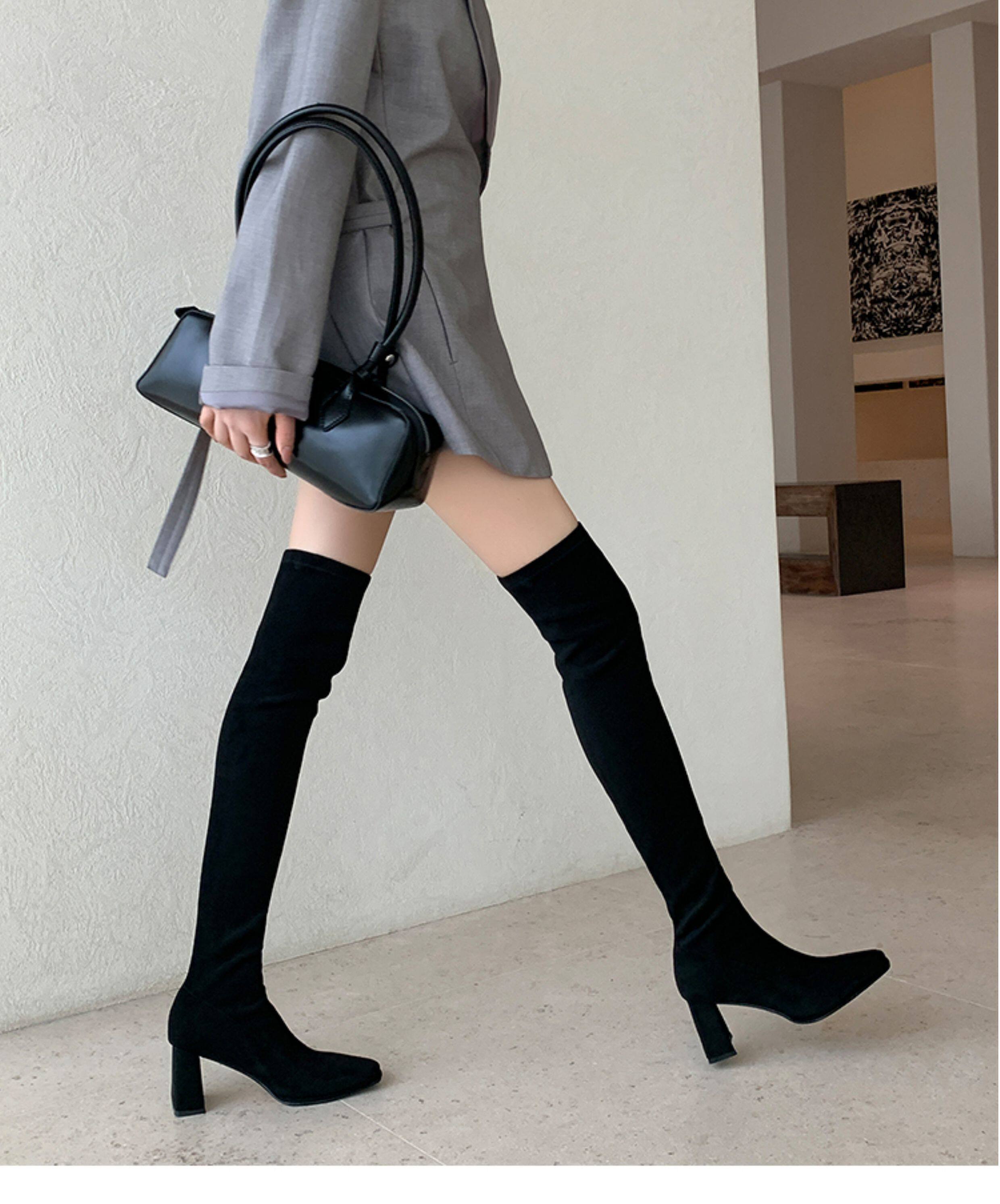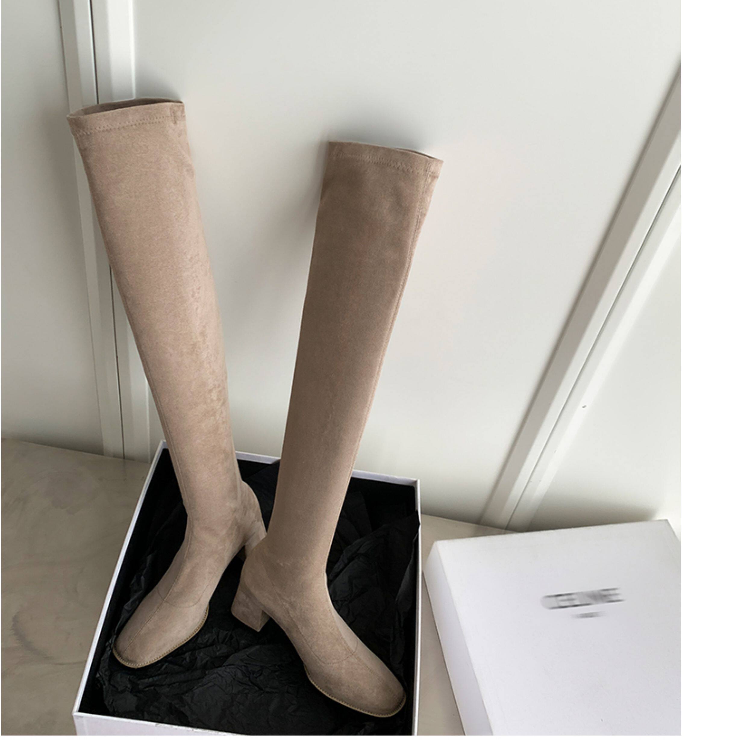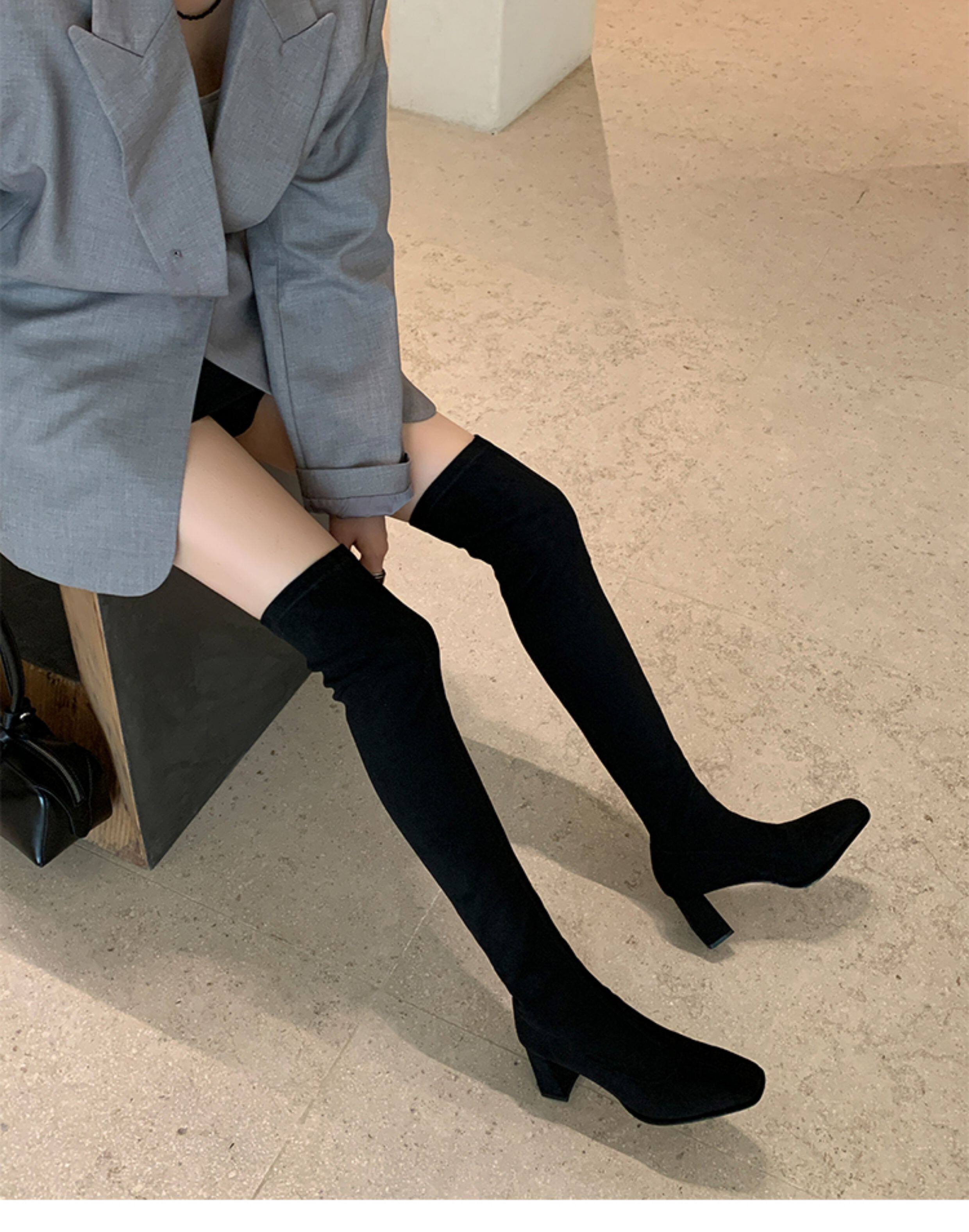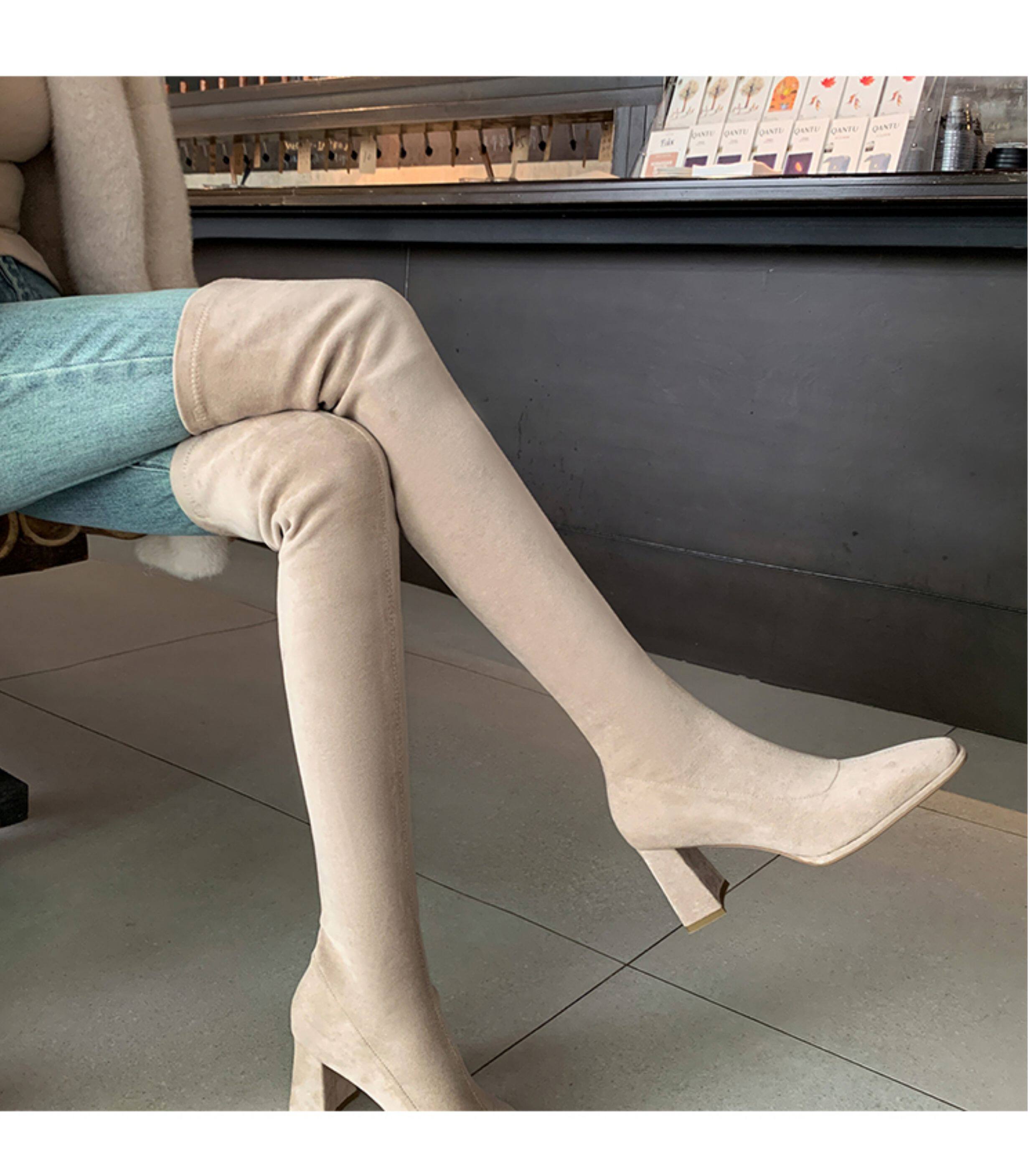 西魚許5050方頭粗跟瘦腿過膝長靴女高跟高筒靴秋冬顯瘦彈力長筒靴