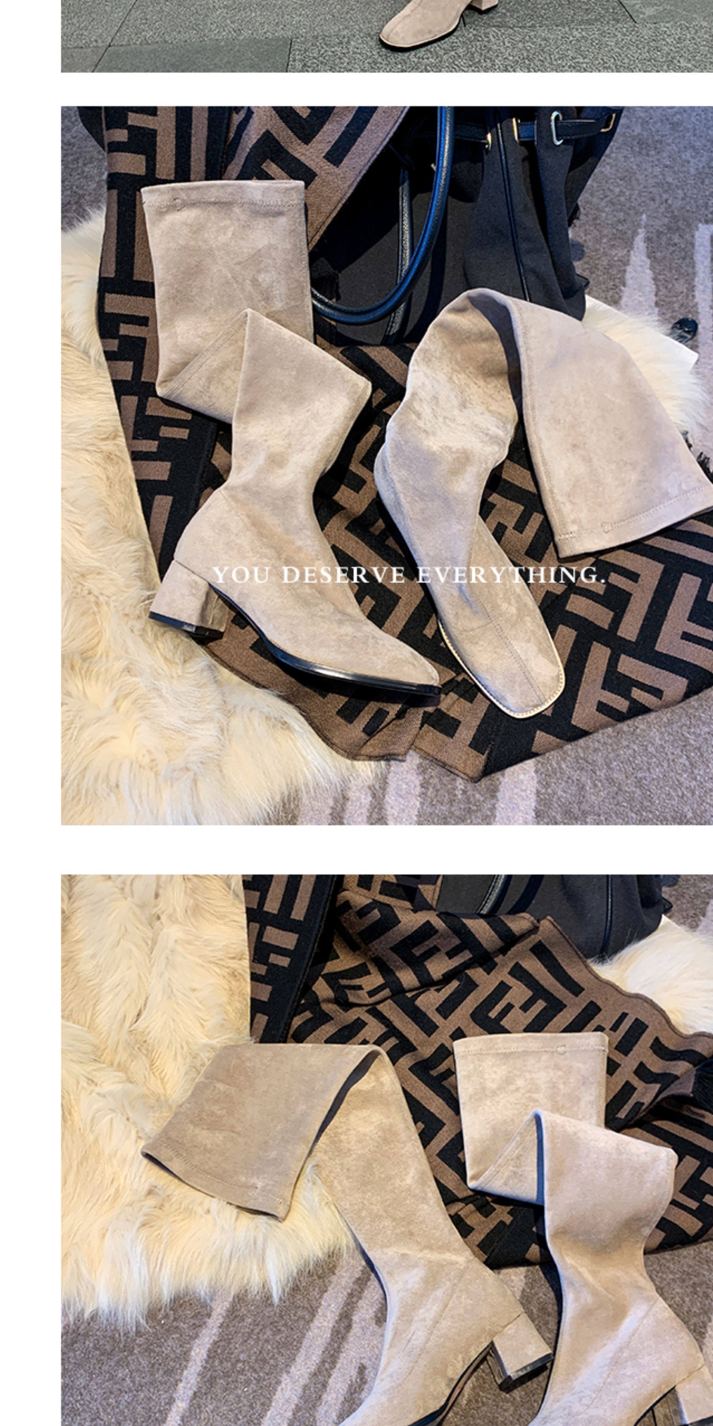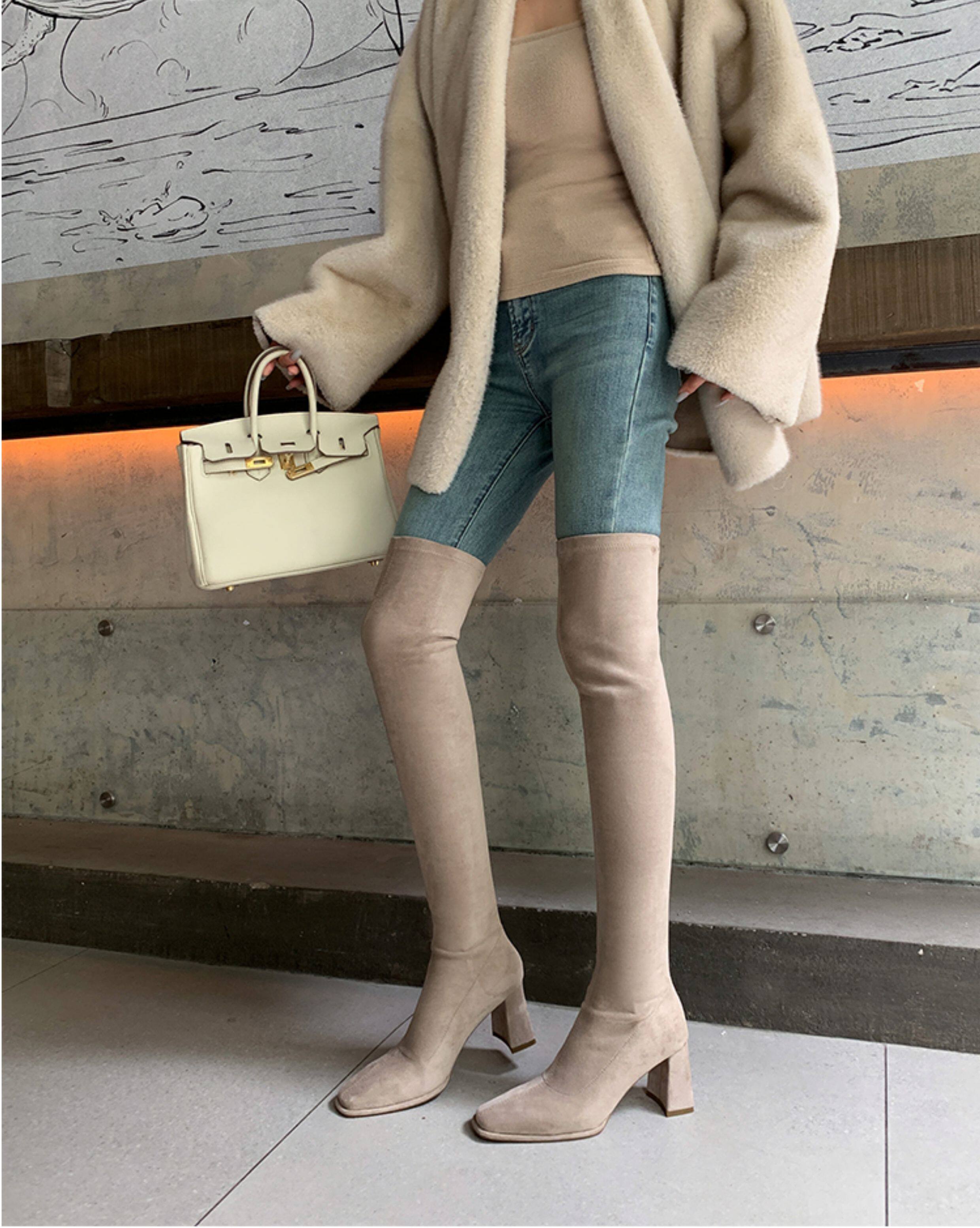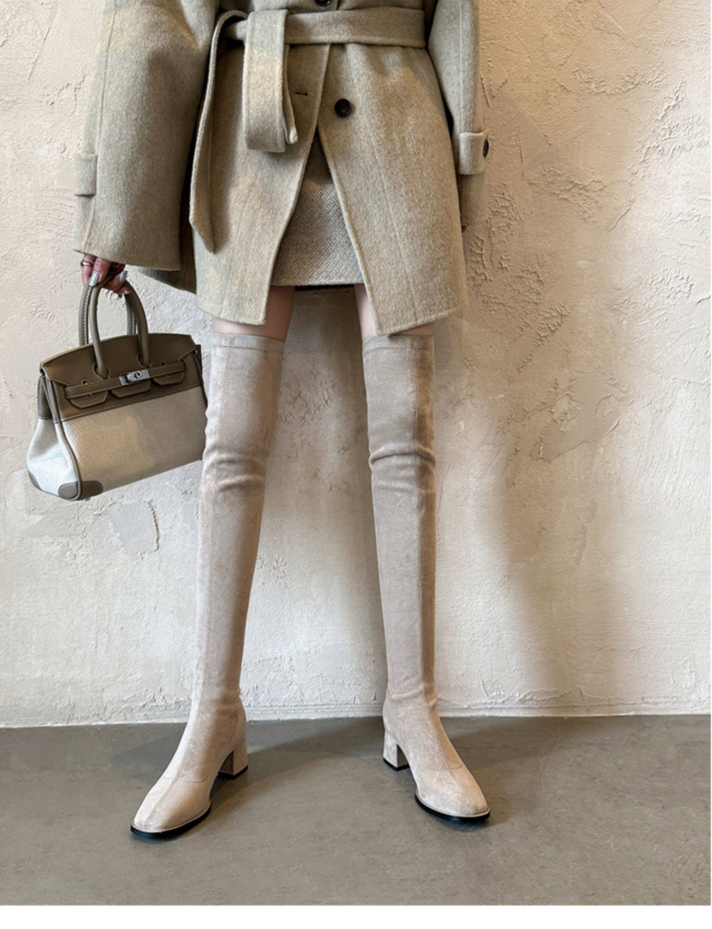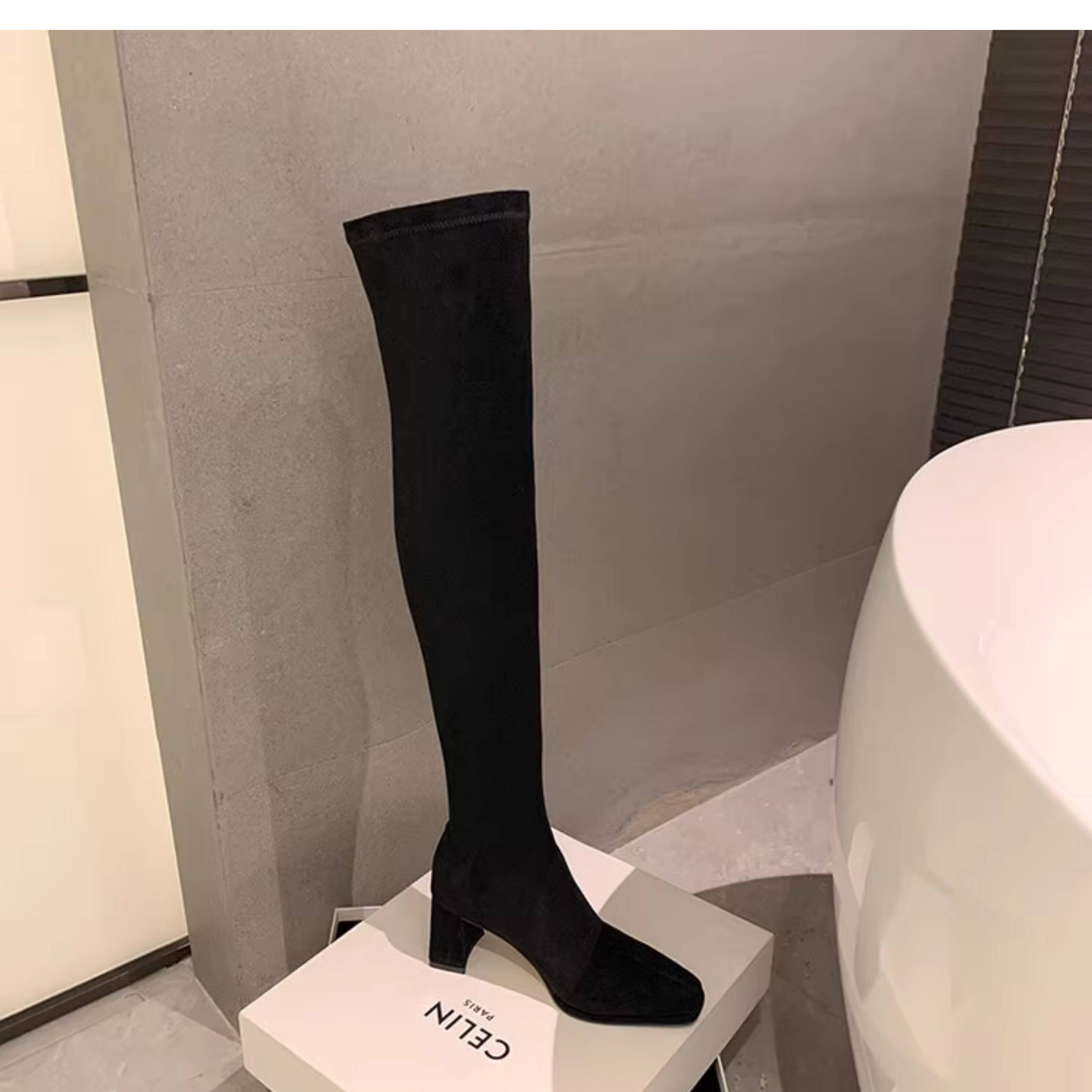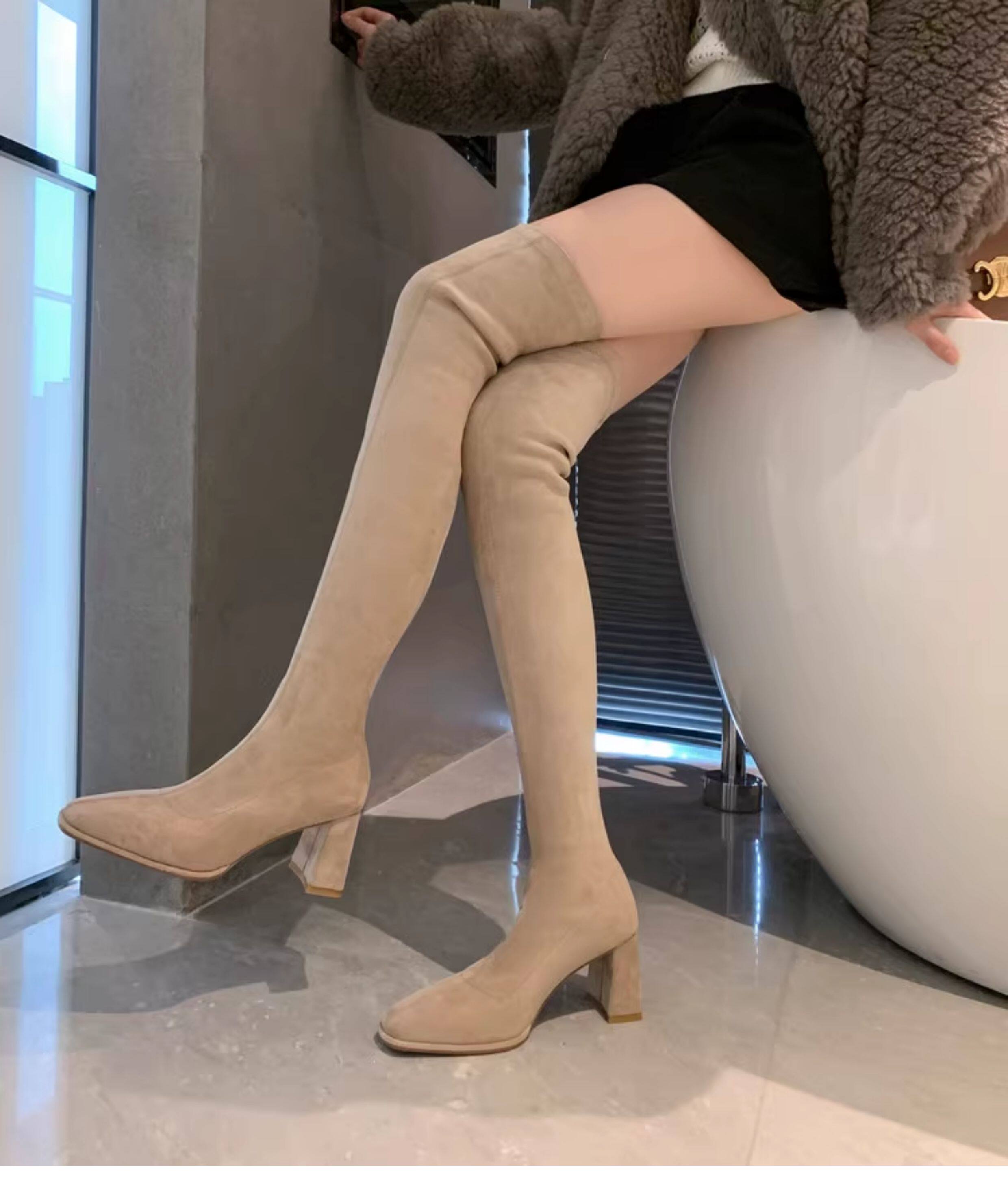 西魚許5050方頭粗跟瘦腿過膝長靴女高跟高筒靴秋冬顯瘦彈力長筒靴
