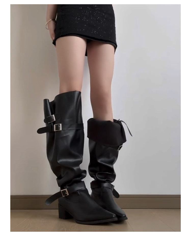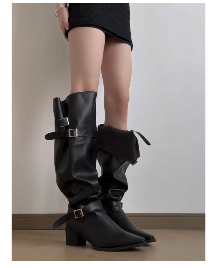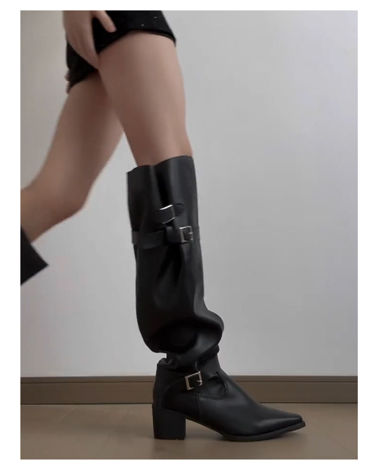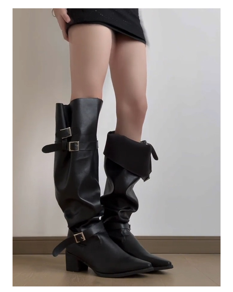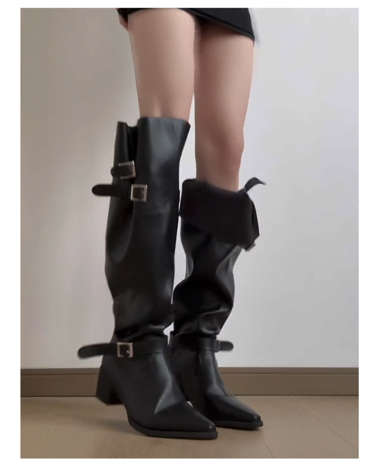 七個橙~真皮尖頭騎士靴女不過膝長靴粗跟釦帶長筒靴內增高堆堆靴