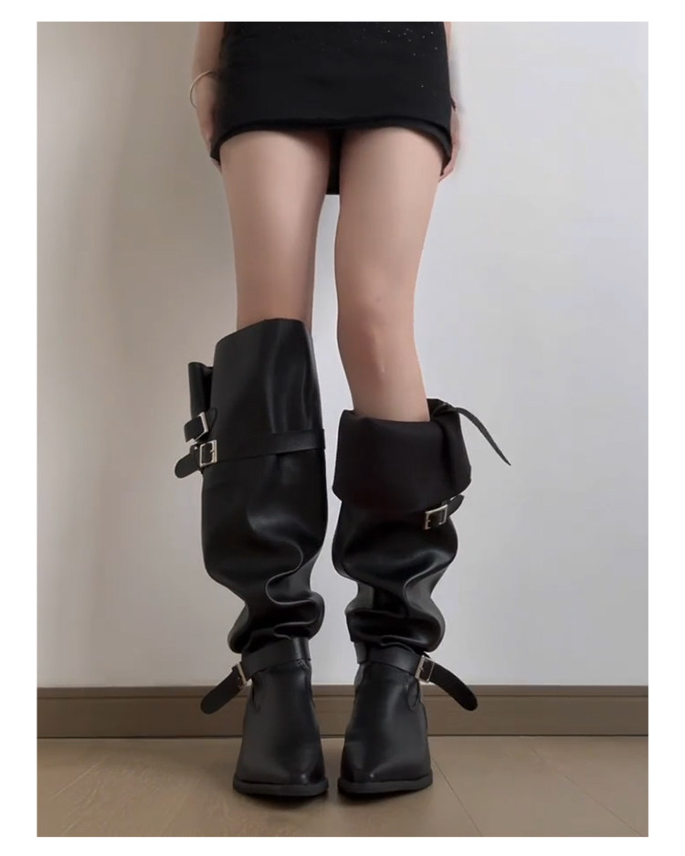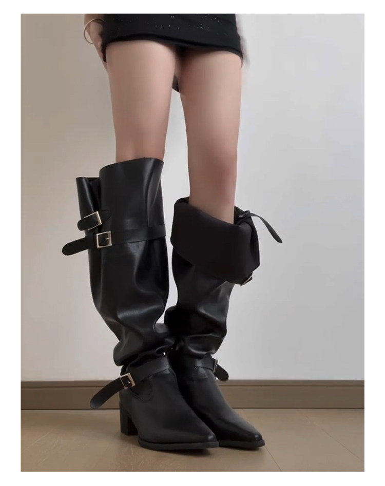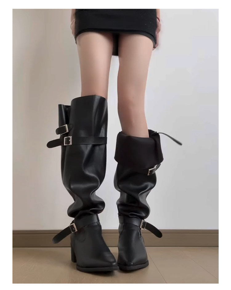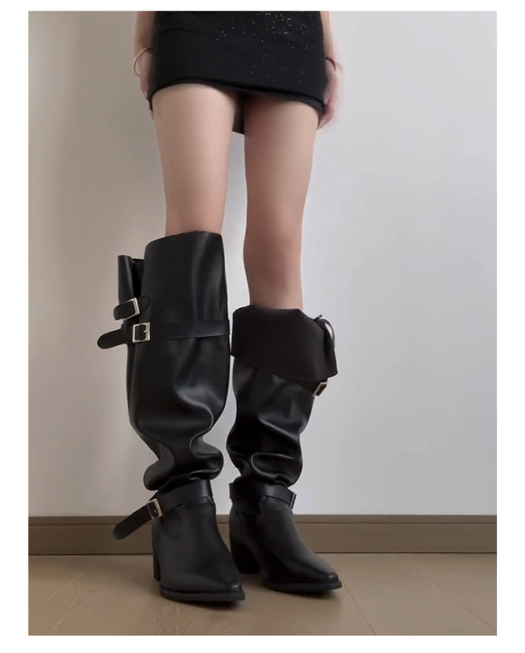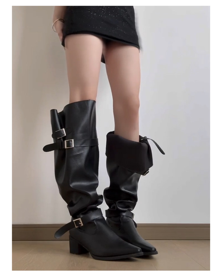 七個橙~真皮尖頭騎士靴女不過膝長靴粗跟釦帶長筒靴內增高堆堆靴