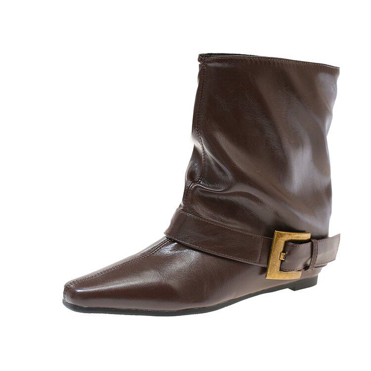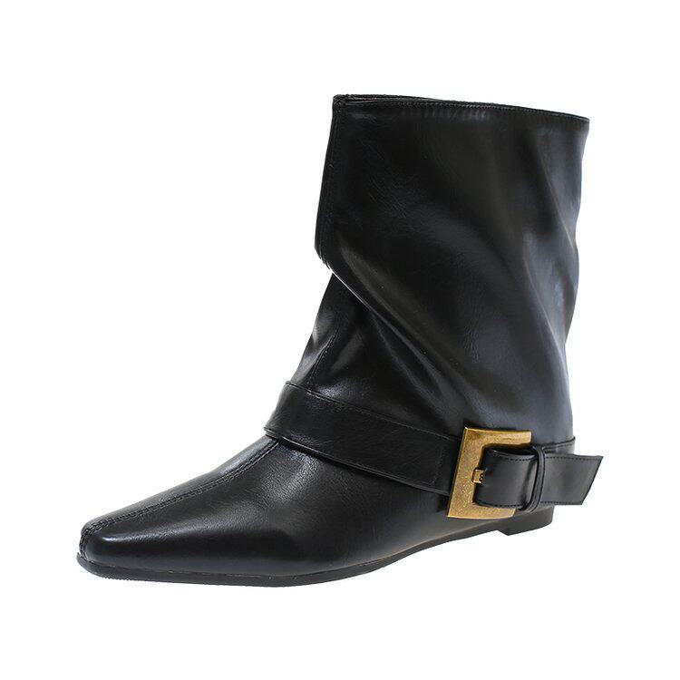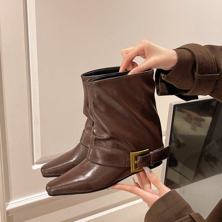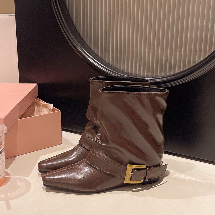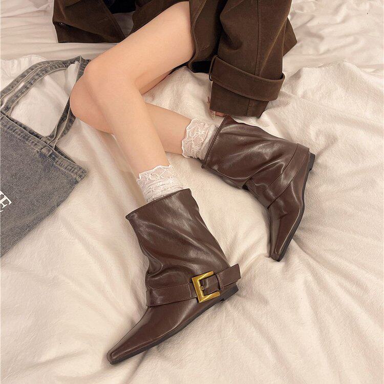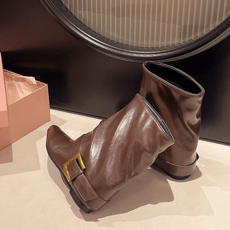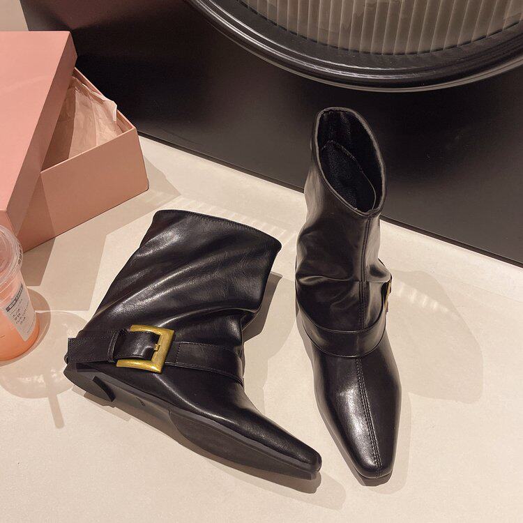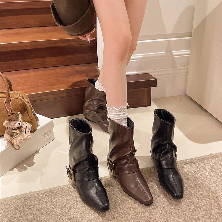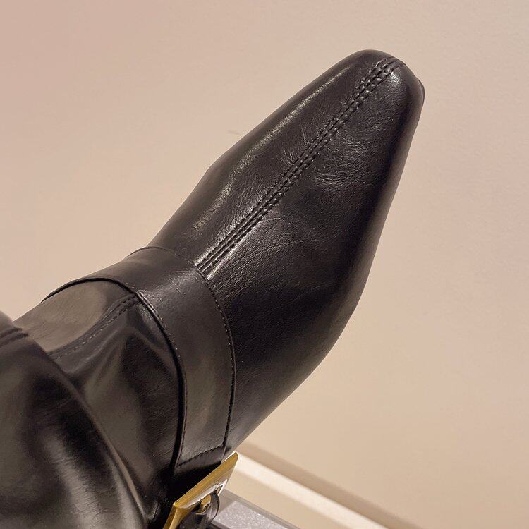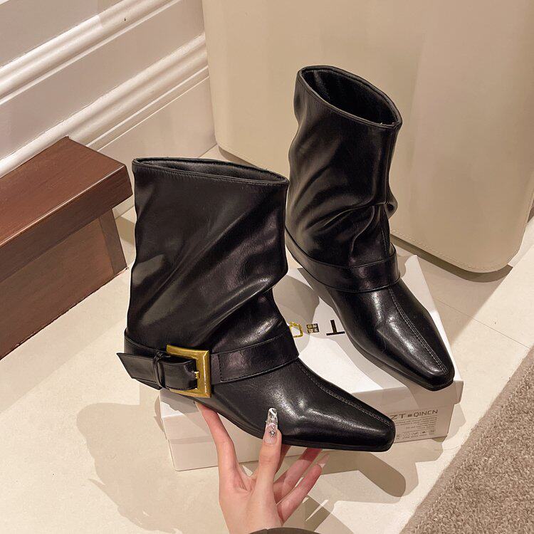 方頭短靴女2025秋冬新款百搭時裝瘦瘦靴平低洋氣馬丁靴中筒褲琯靴