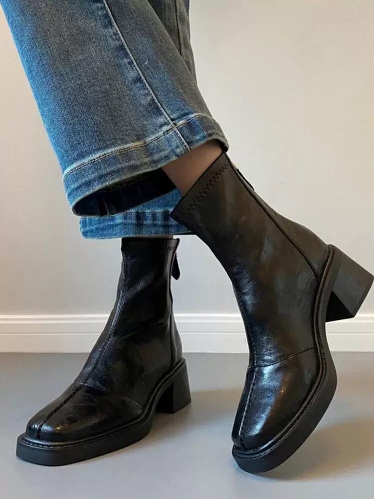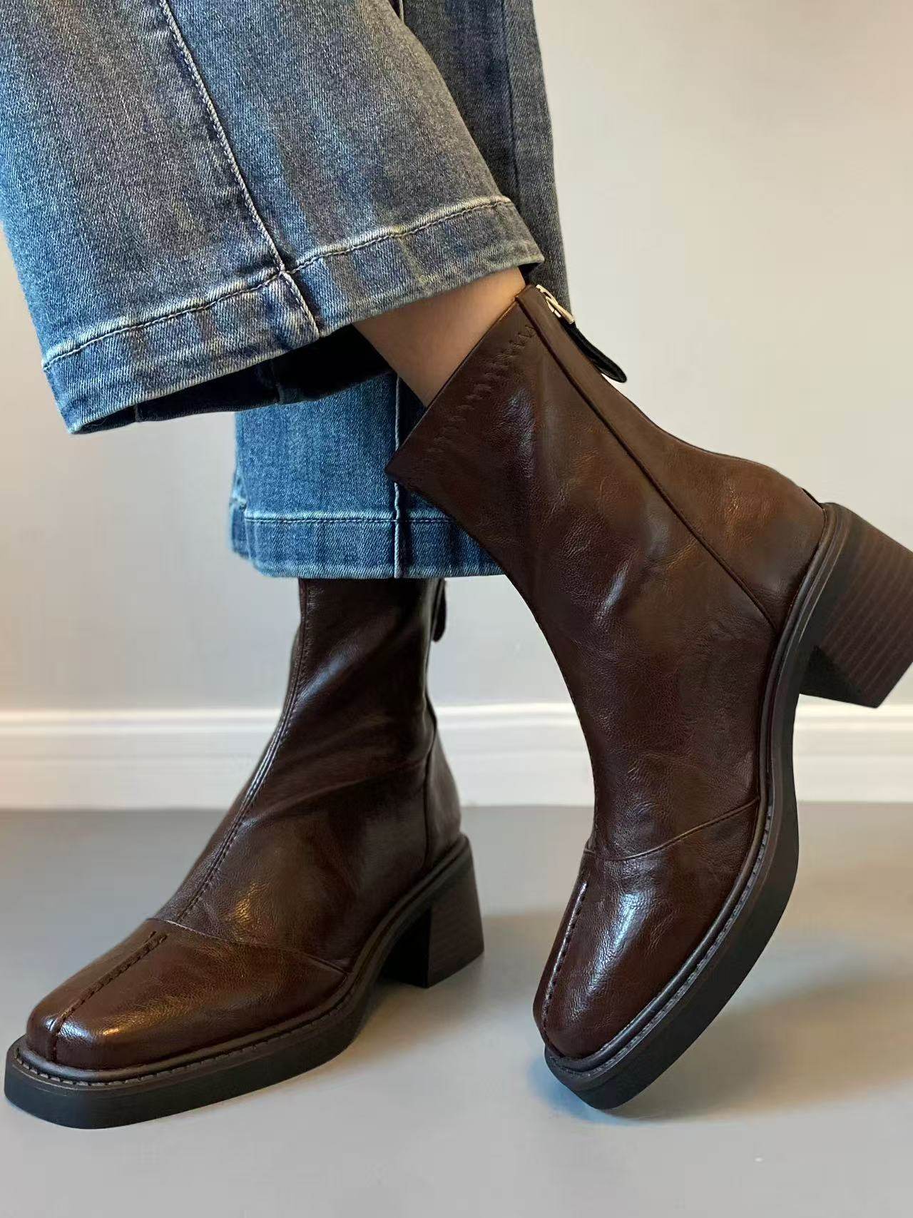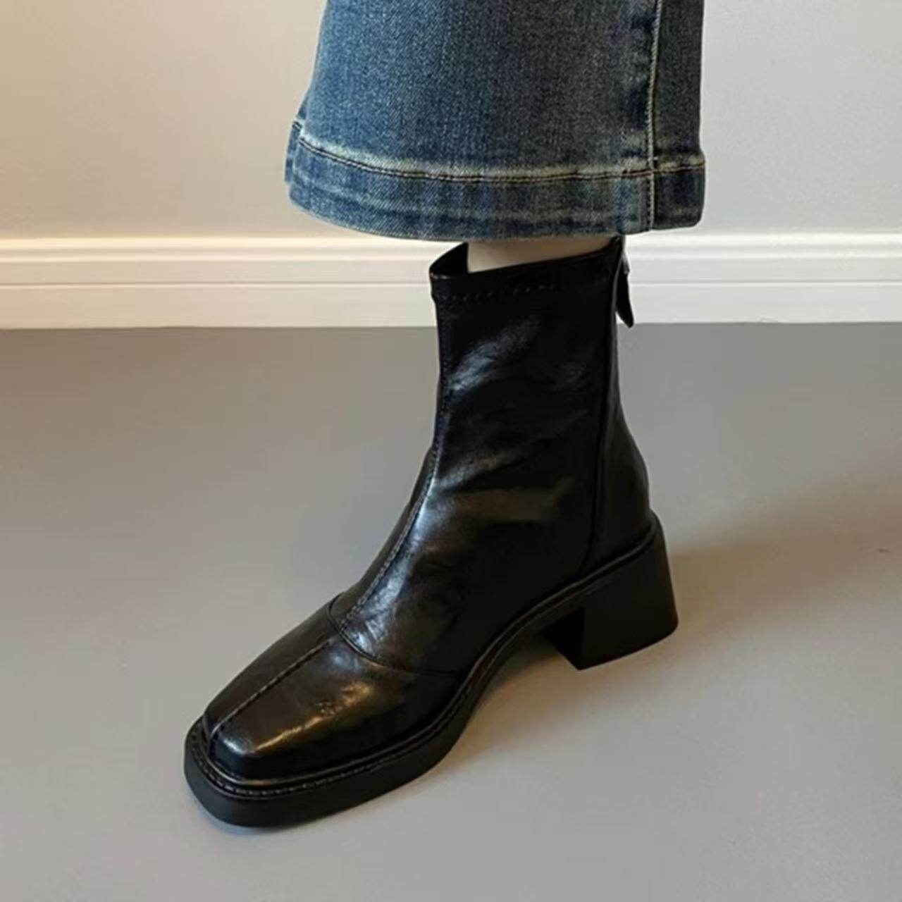 羊皮版~復古高跟女短靴方頭小衆彈力靴秋冬粗跟做舊軟皮瘦瘦靴子