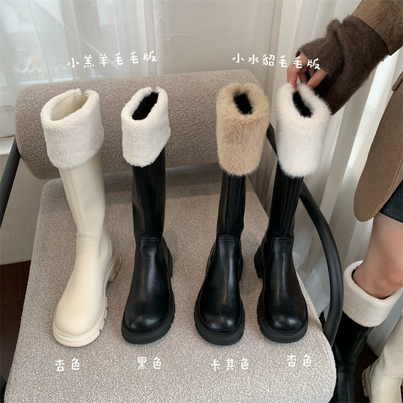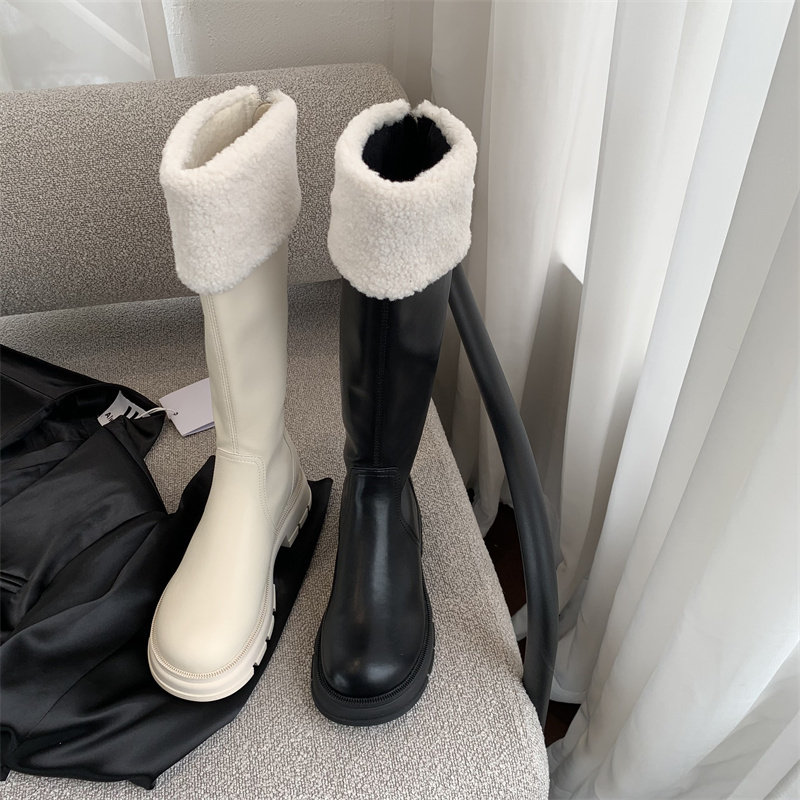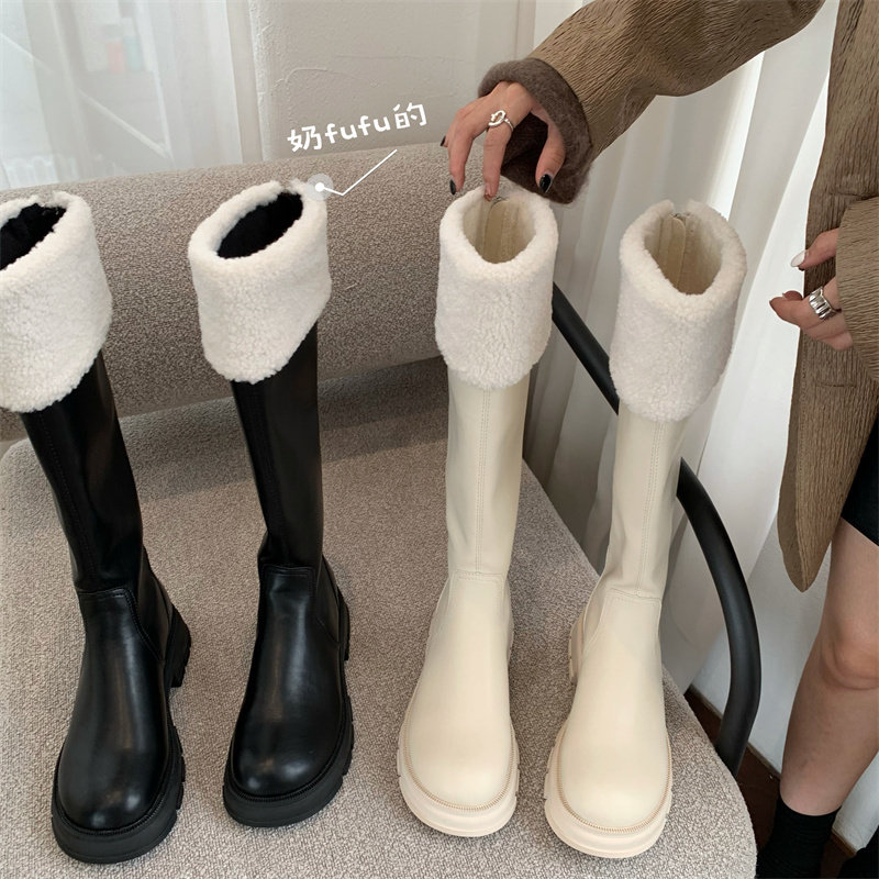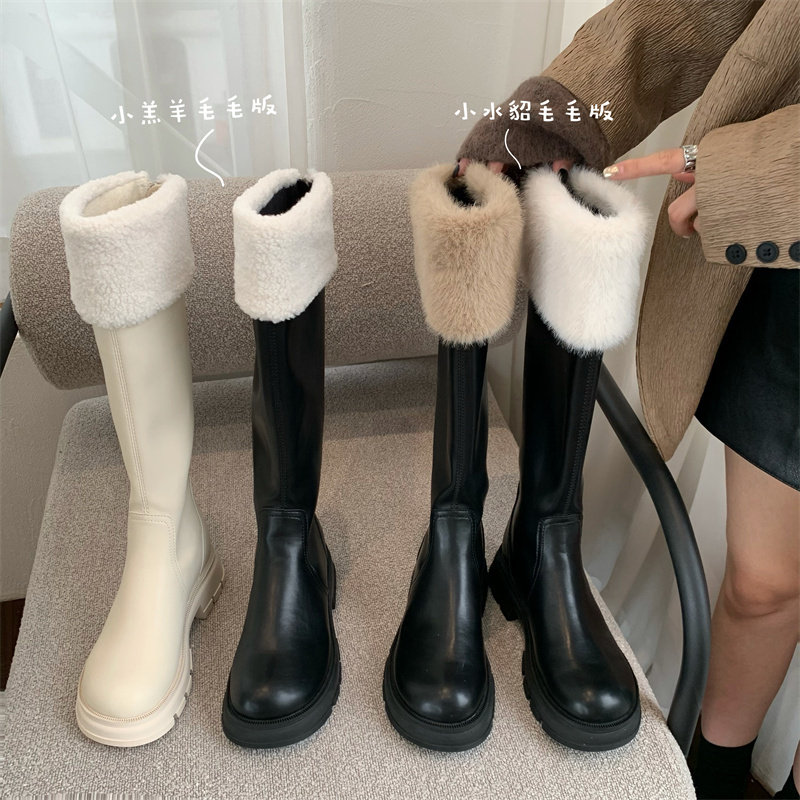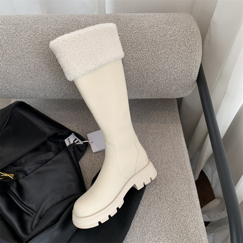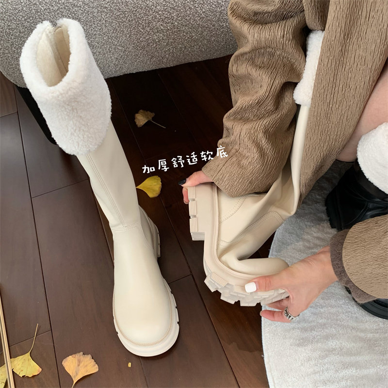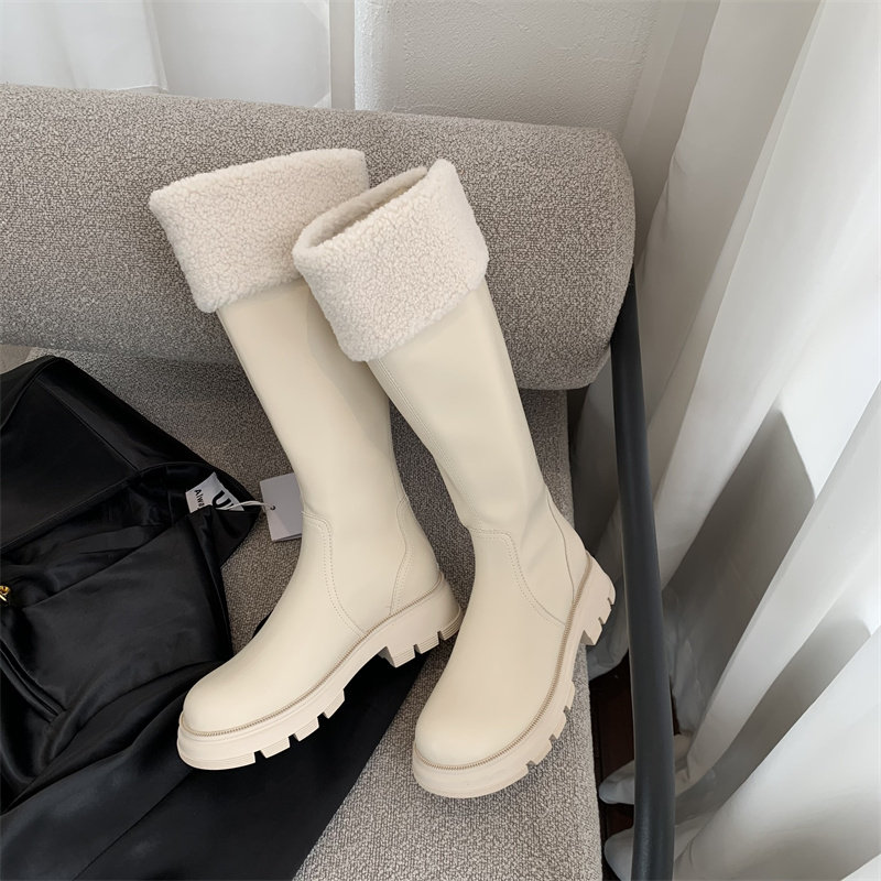 羊羔毛長筒靴女鞋2025年新款秋冬季加絨毛毛冬鞋奶白色長靴不過膝