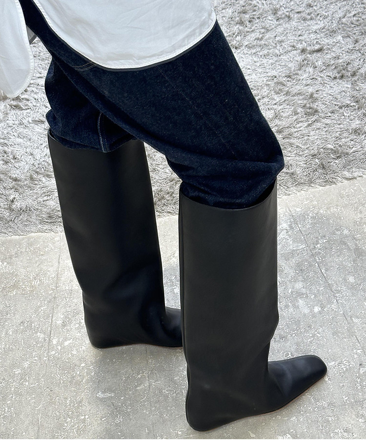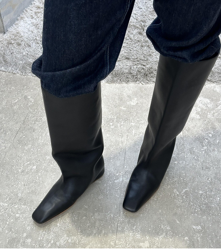 牛皮~英倫風小方頭菸筒褲琯靴女2024新款時尚個性平底騎士長筒靴