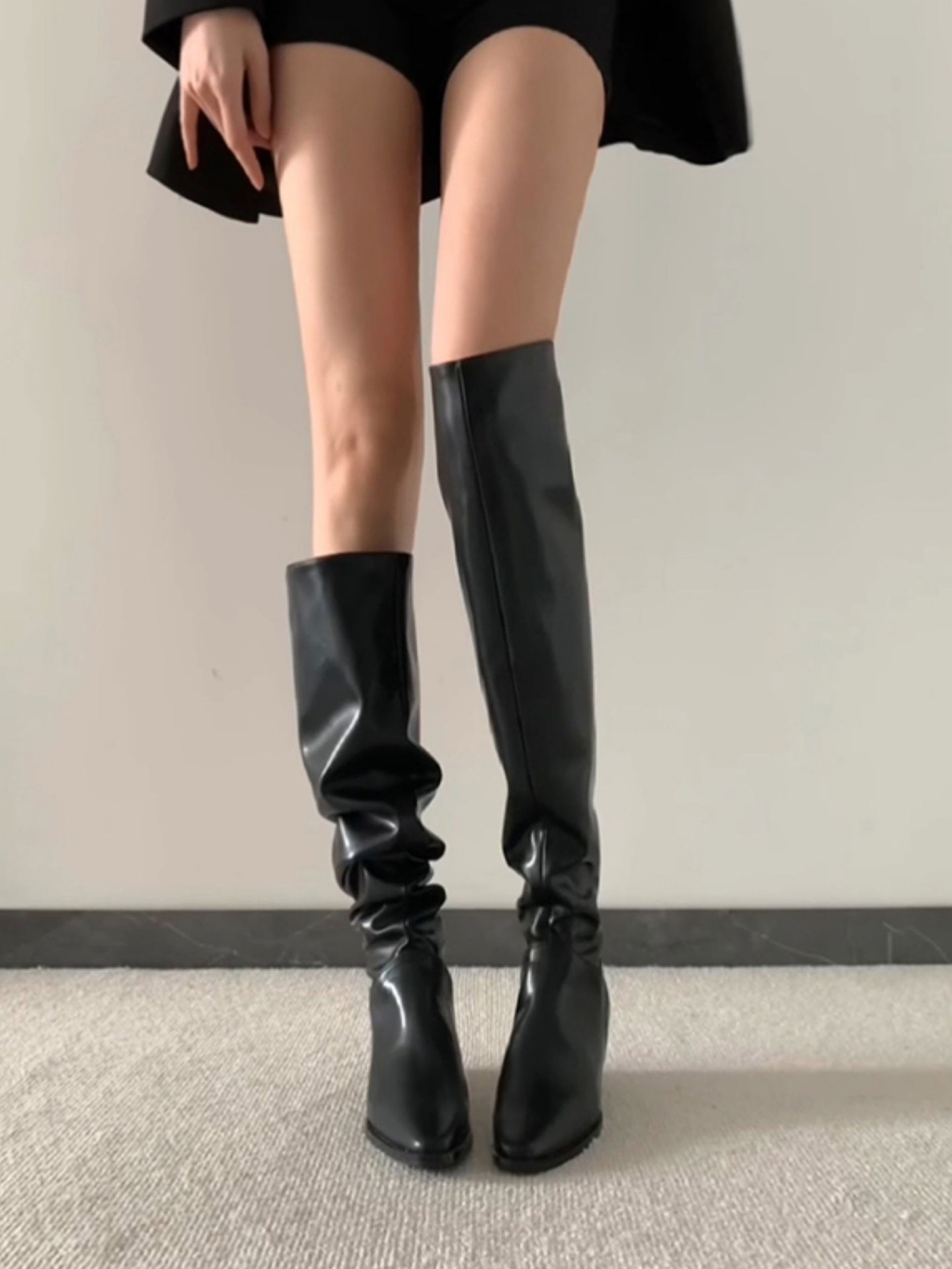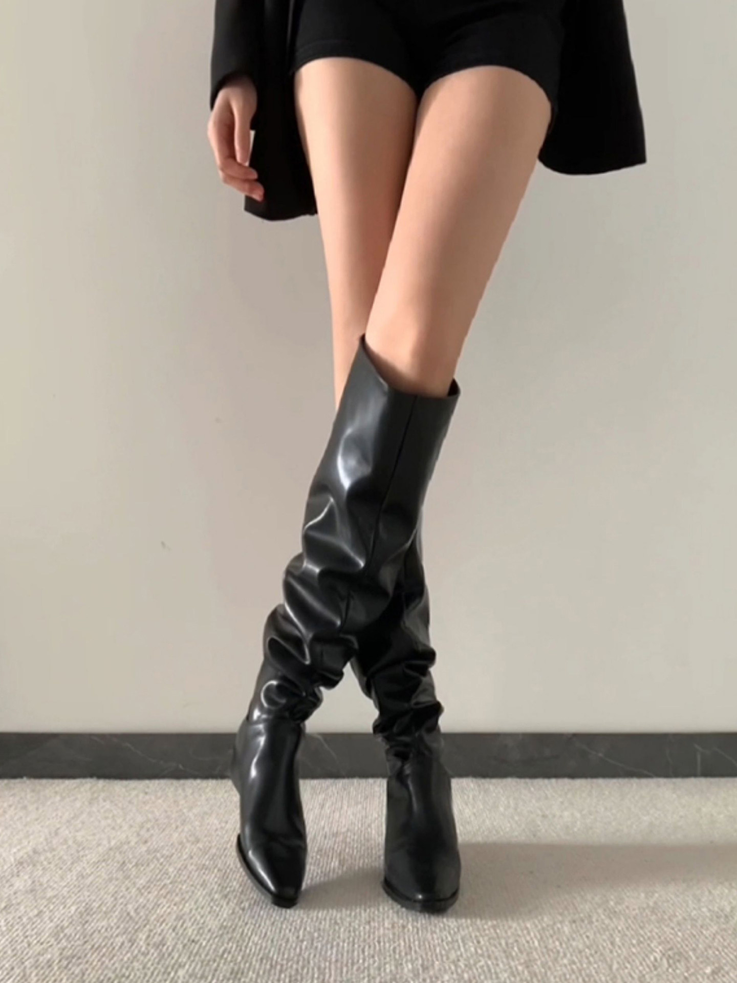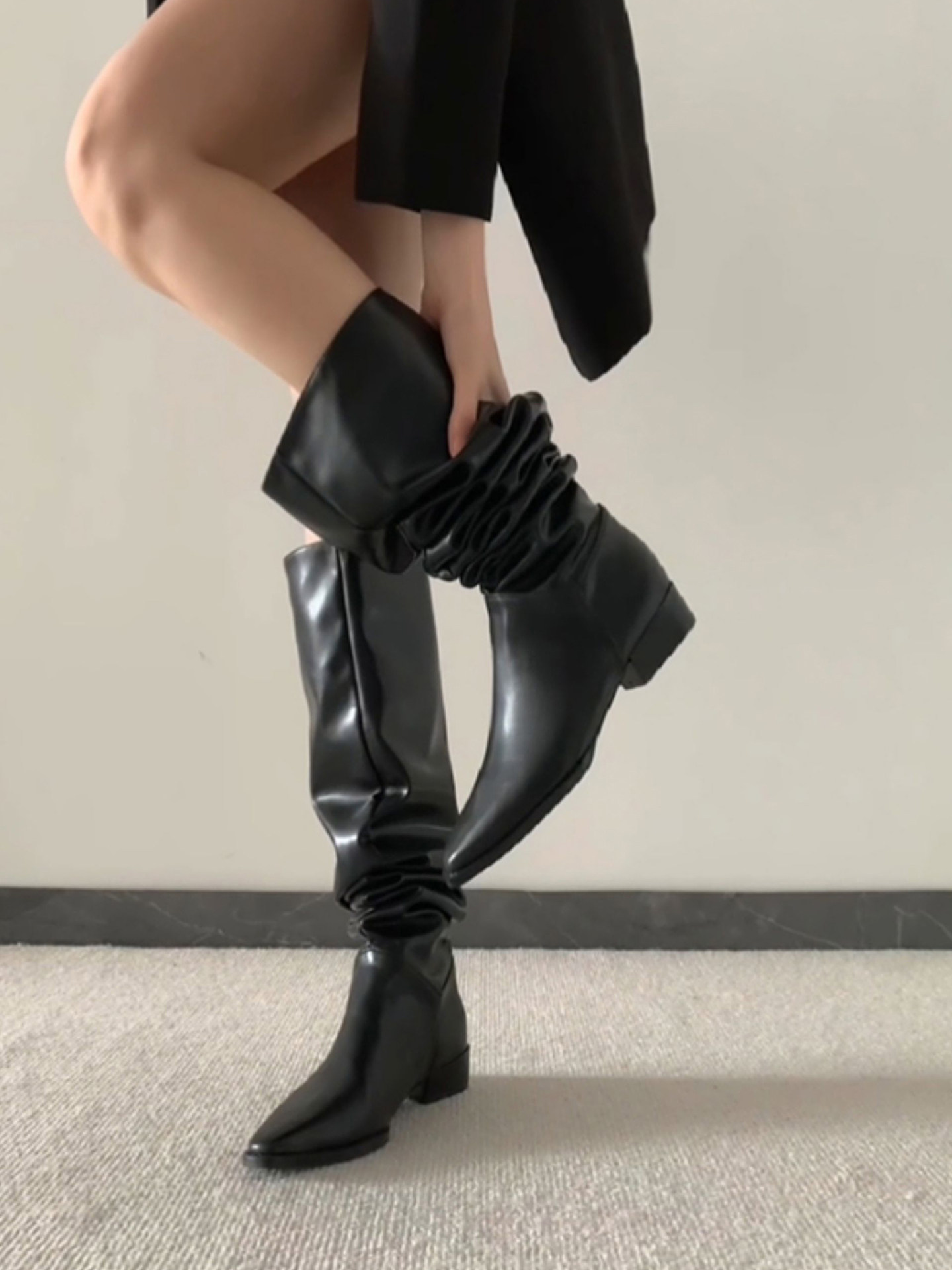 騎士靴女2025新款美拉德棕色尖頭長靴粗跟高筒復古絨面褶皺堆堆靴