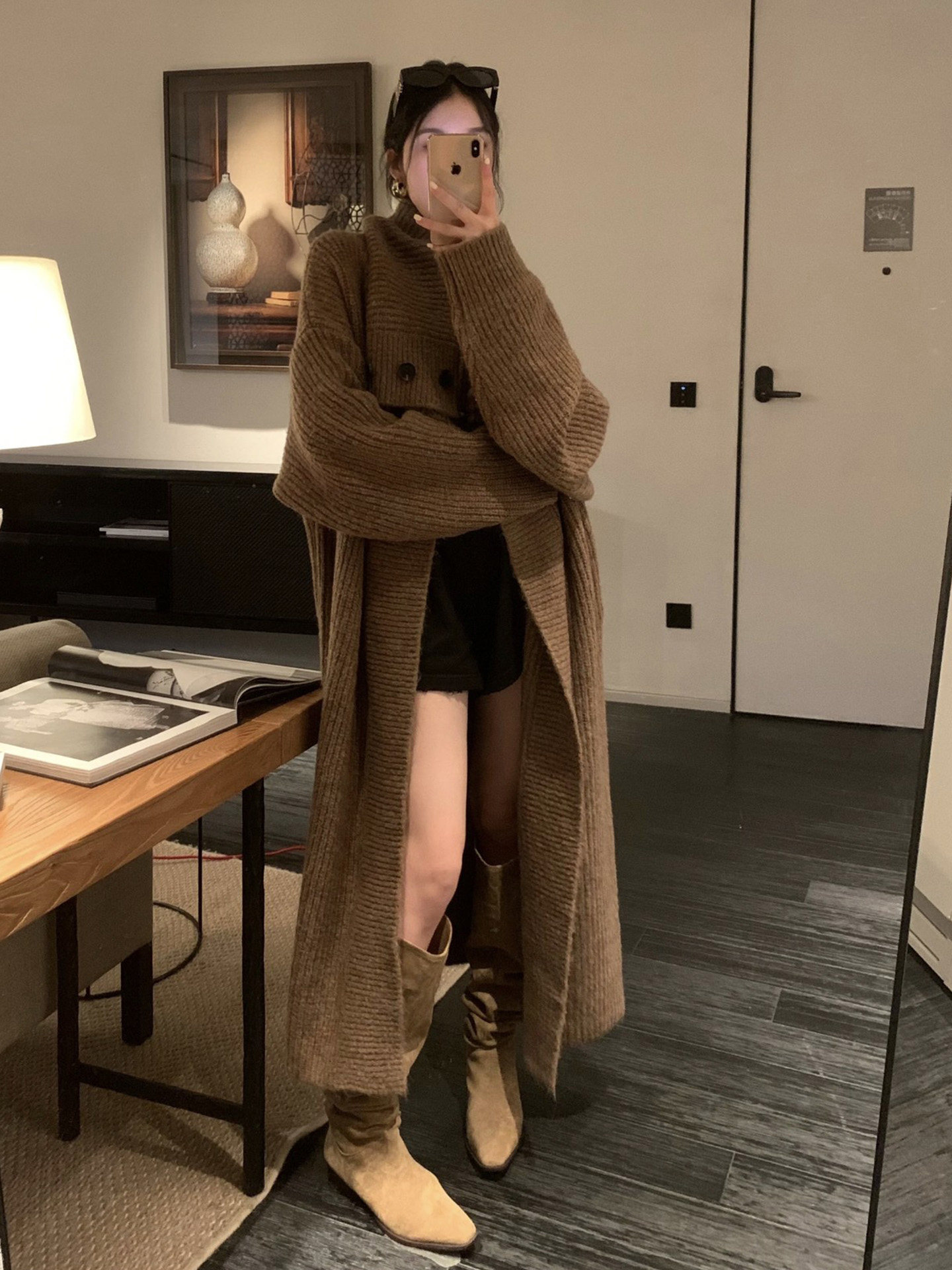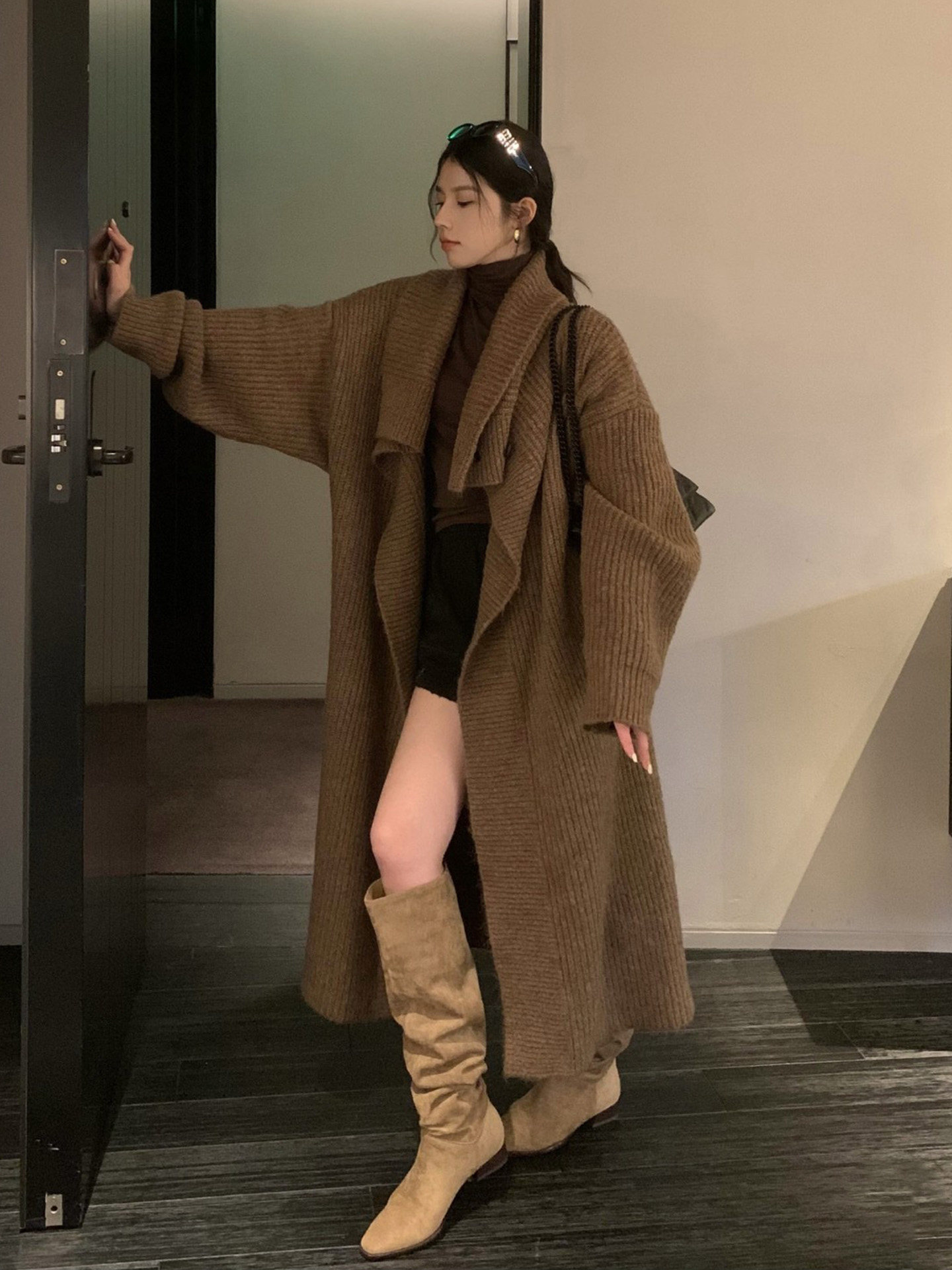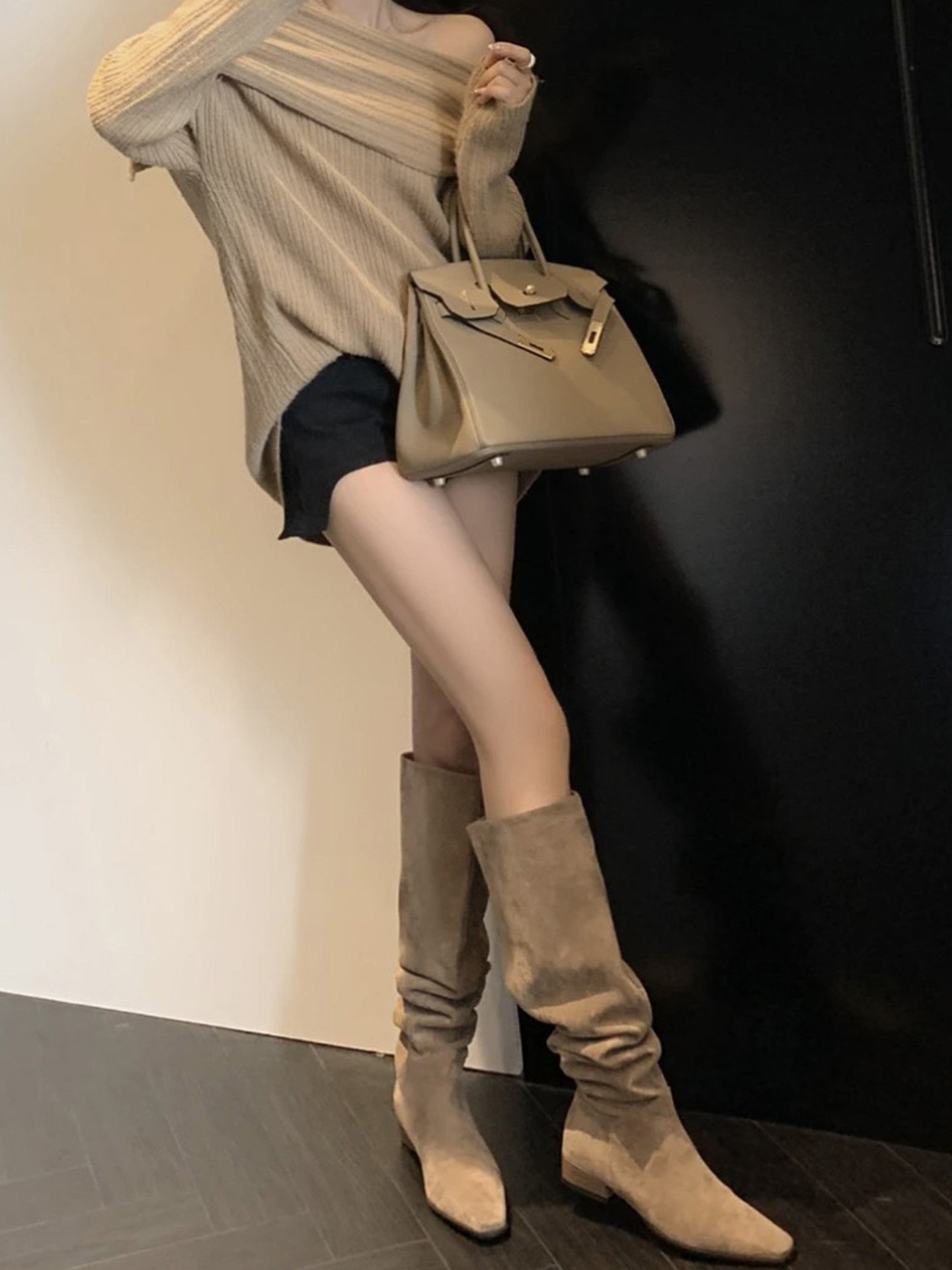 騎士靴女2025新款美拉德棕色尖頭長靴粗跟高筒復古絨面褶皺堆堆靴