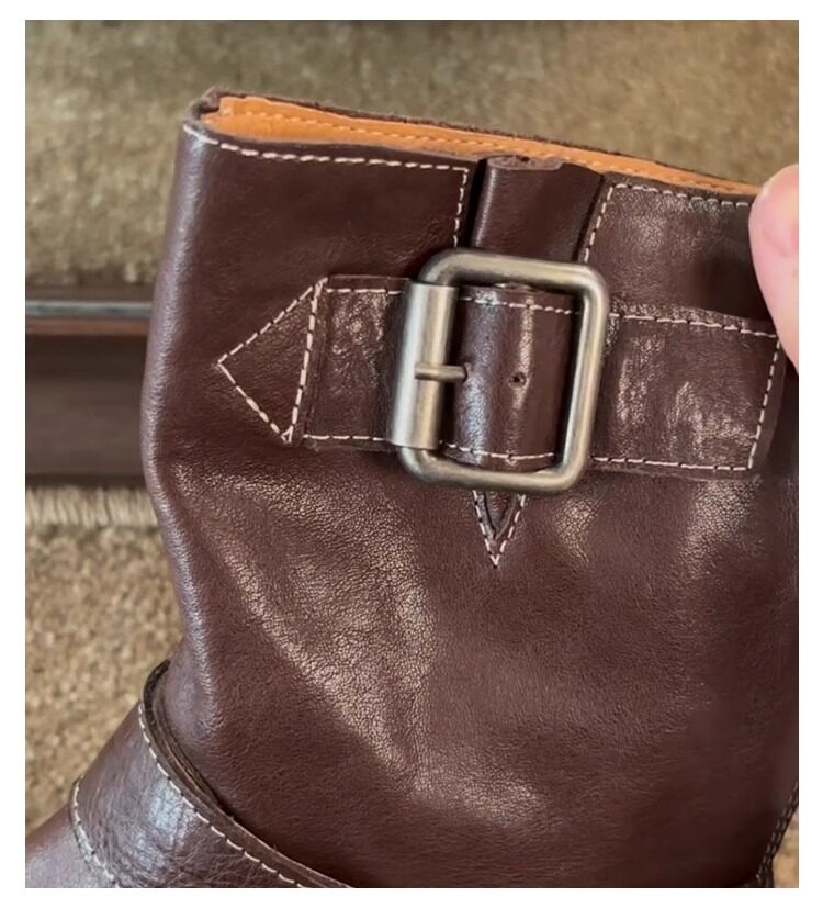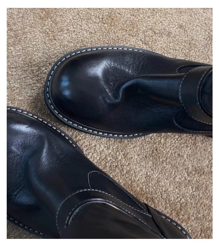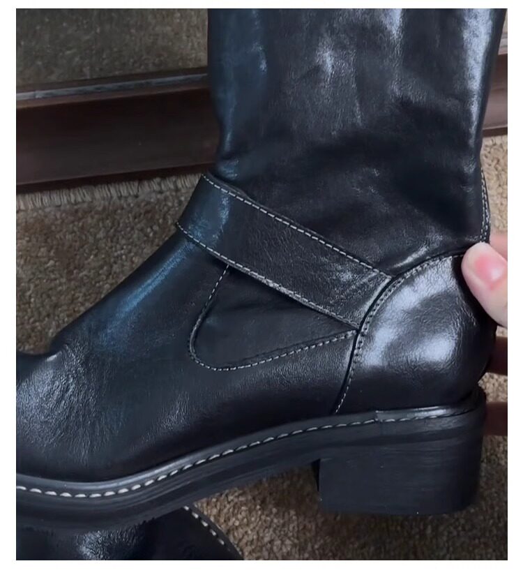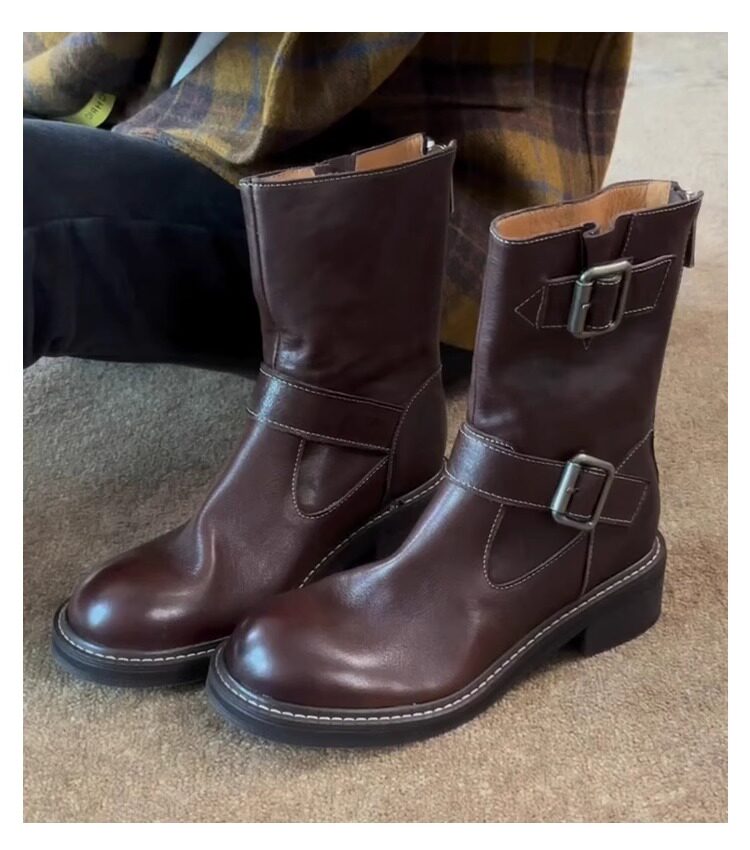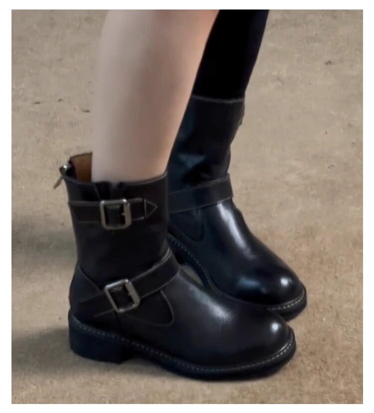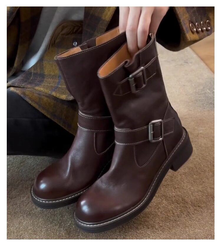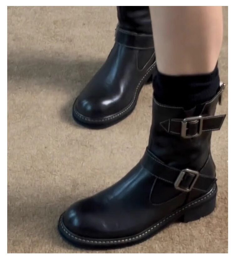 漸進支時尚復古辣妹機車靴女粗跟圓頭皮釦短靴高級感英倫風中筒靴