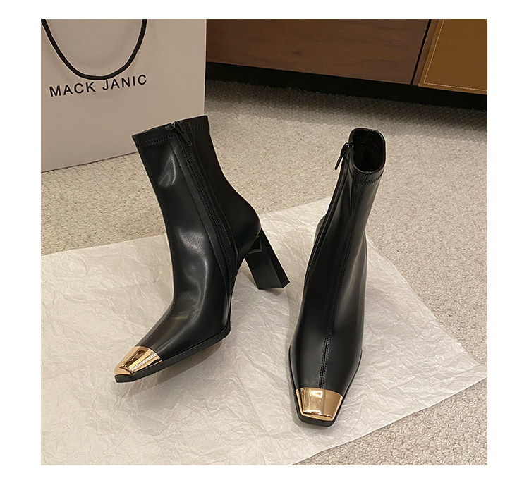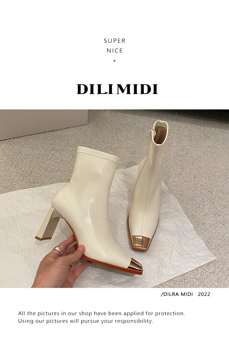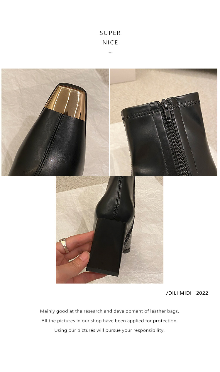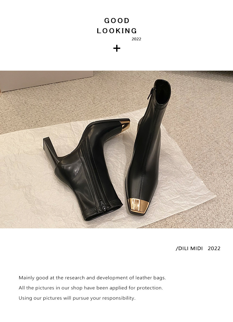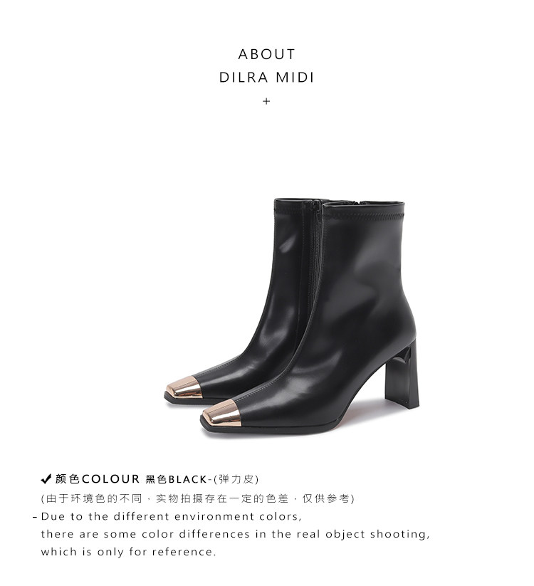 迪麗米迪 靴子女秋冬粗跟金屬方頭短靴女2025新款爆款高跟瘦瘦靴