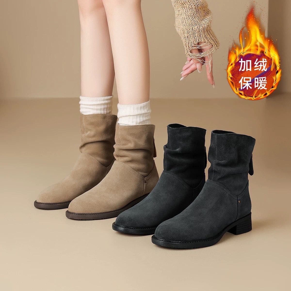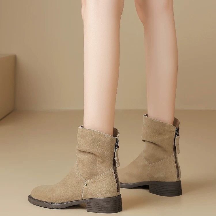 真軟皮粗跟短靴女2025年秋冬新款復古百搭磨砂靴子加絨馬丁靴