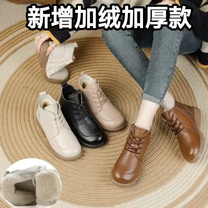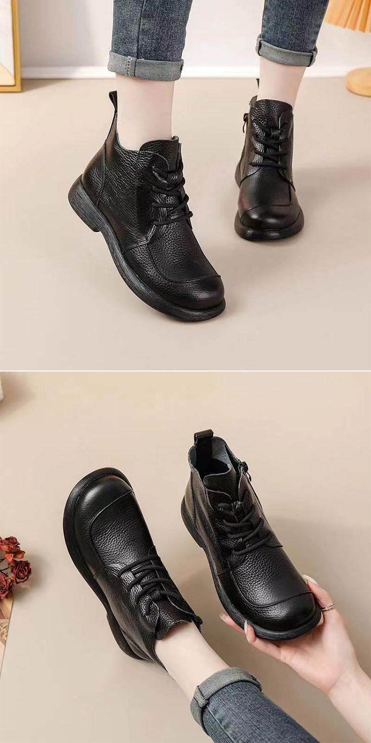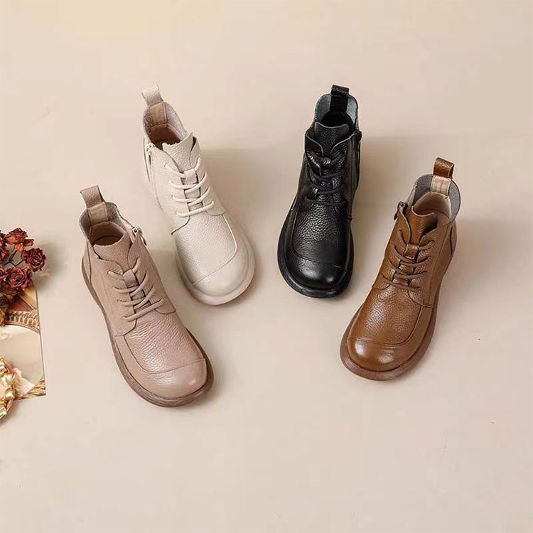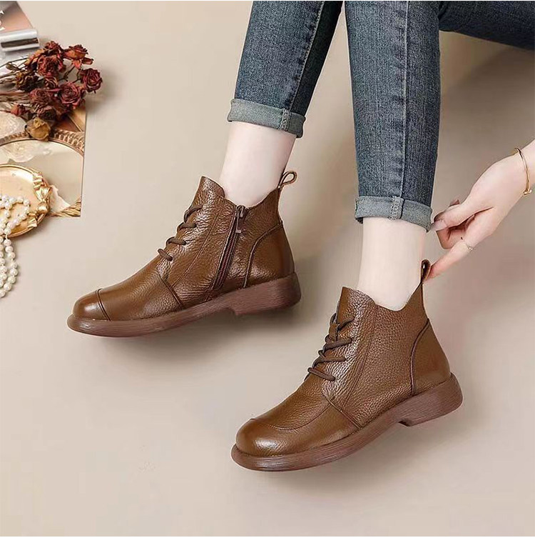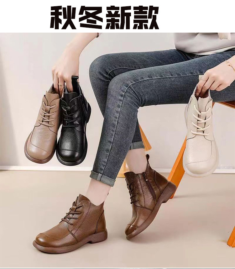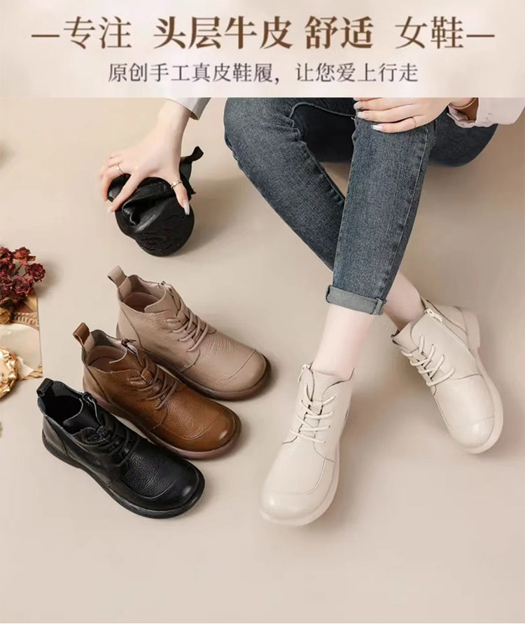 頭層牛皮短靴秋季新款馬丁靴粗跟防滑真皮復古百搭女靴手工媽媽鞋