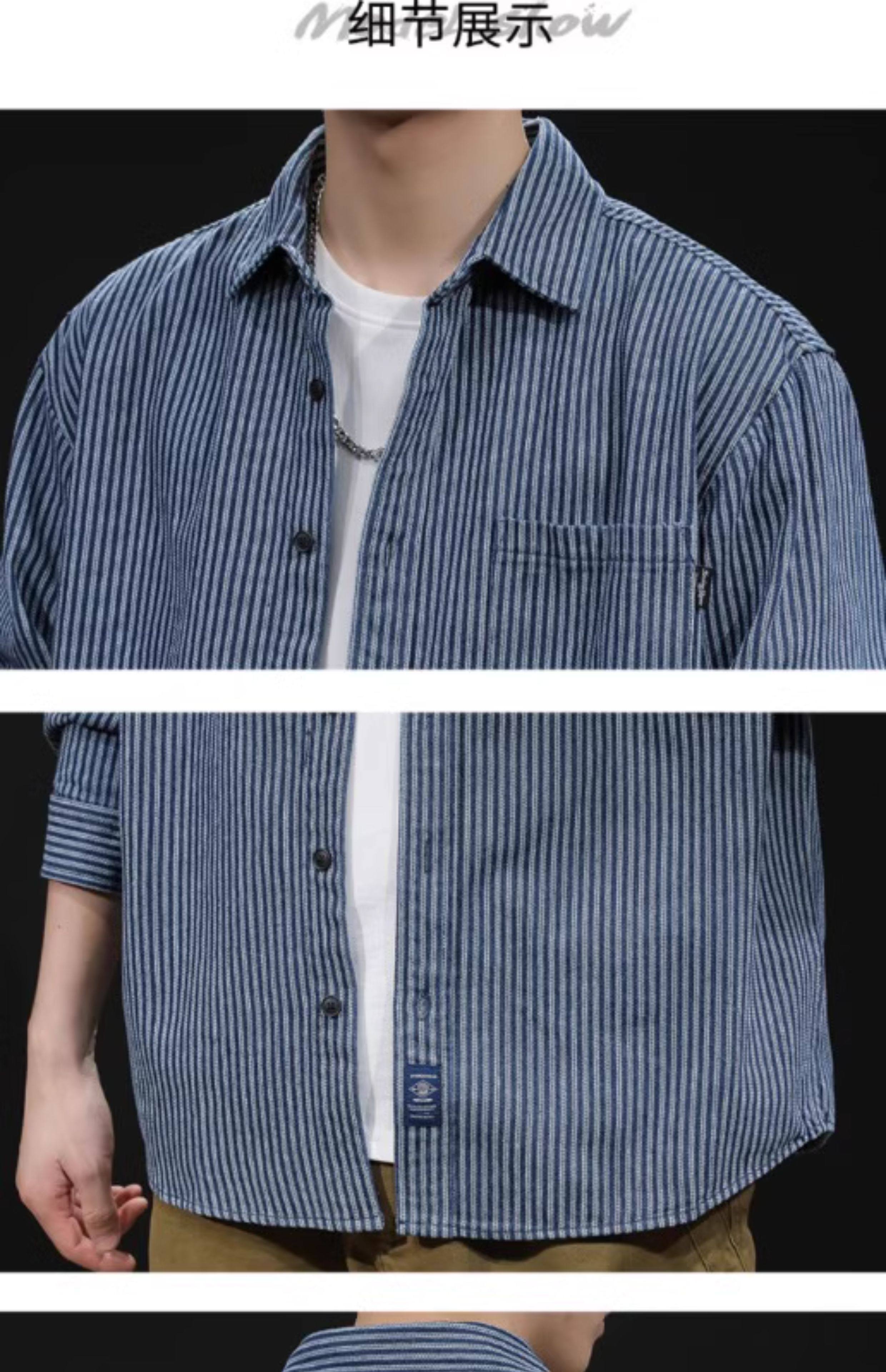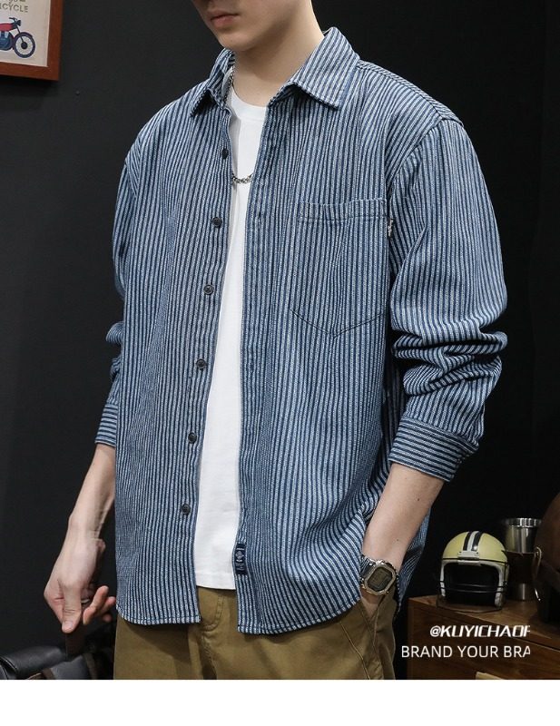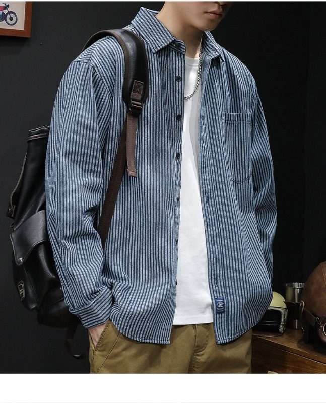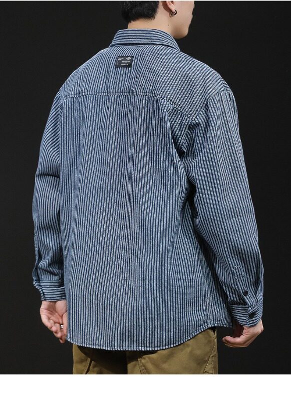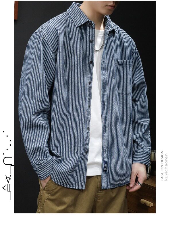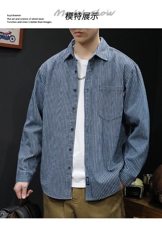 日系復古條紋牛仔襯衫男長袖春秋季潮牌寬鬆休閒百搭襯衣外套上衣