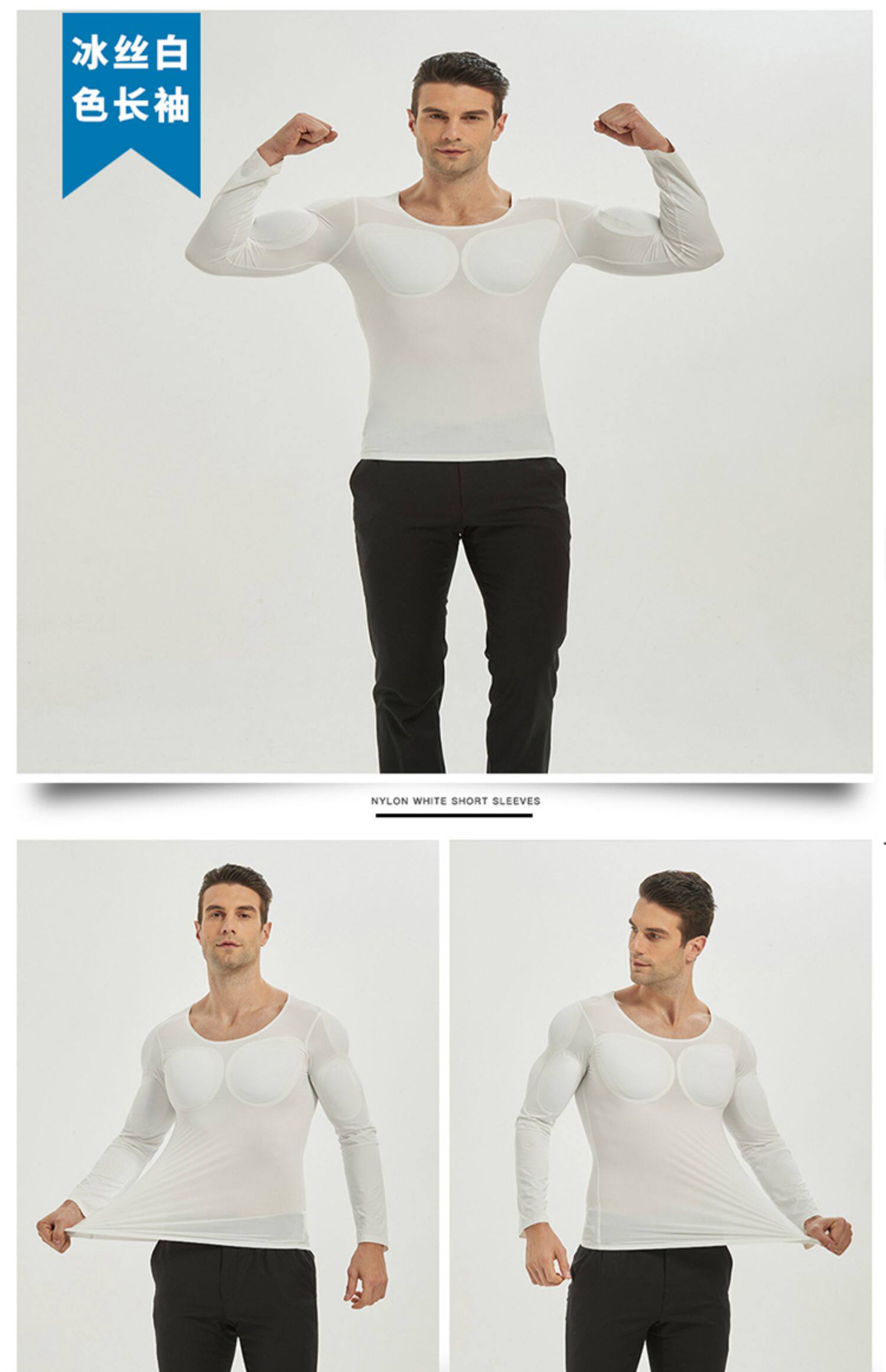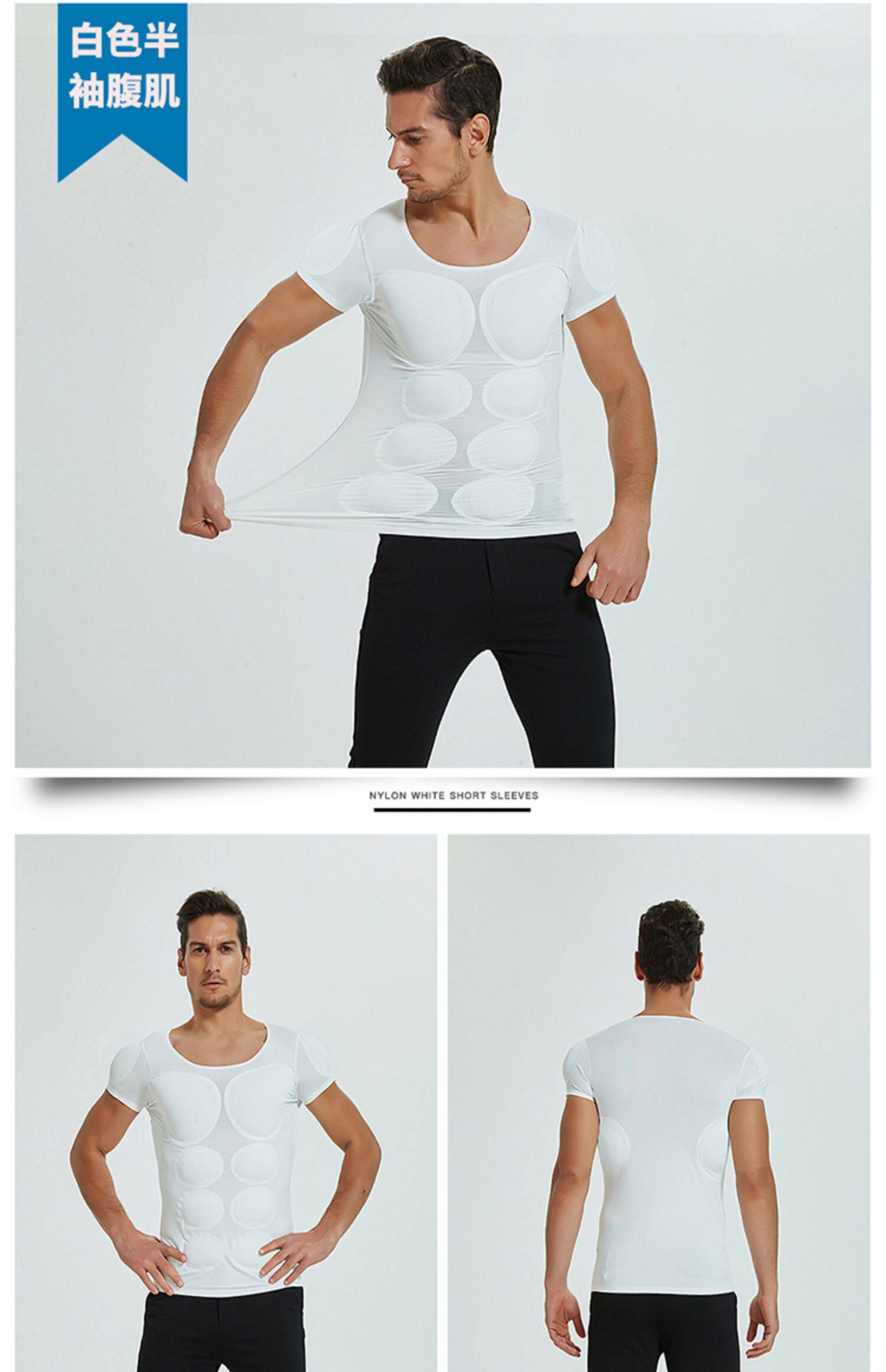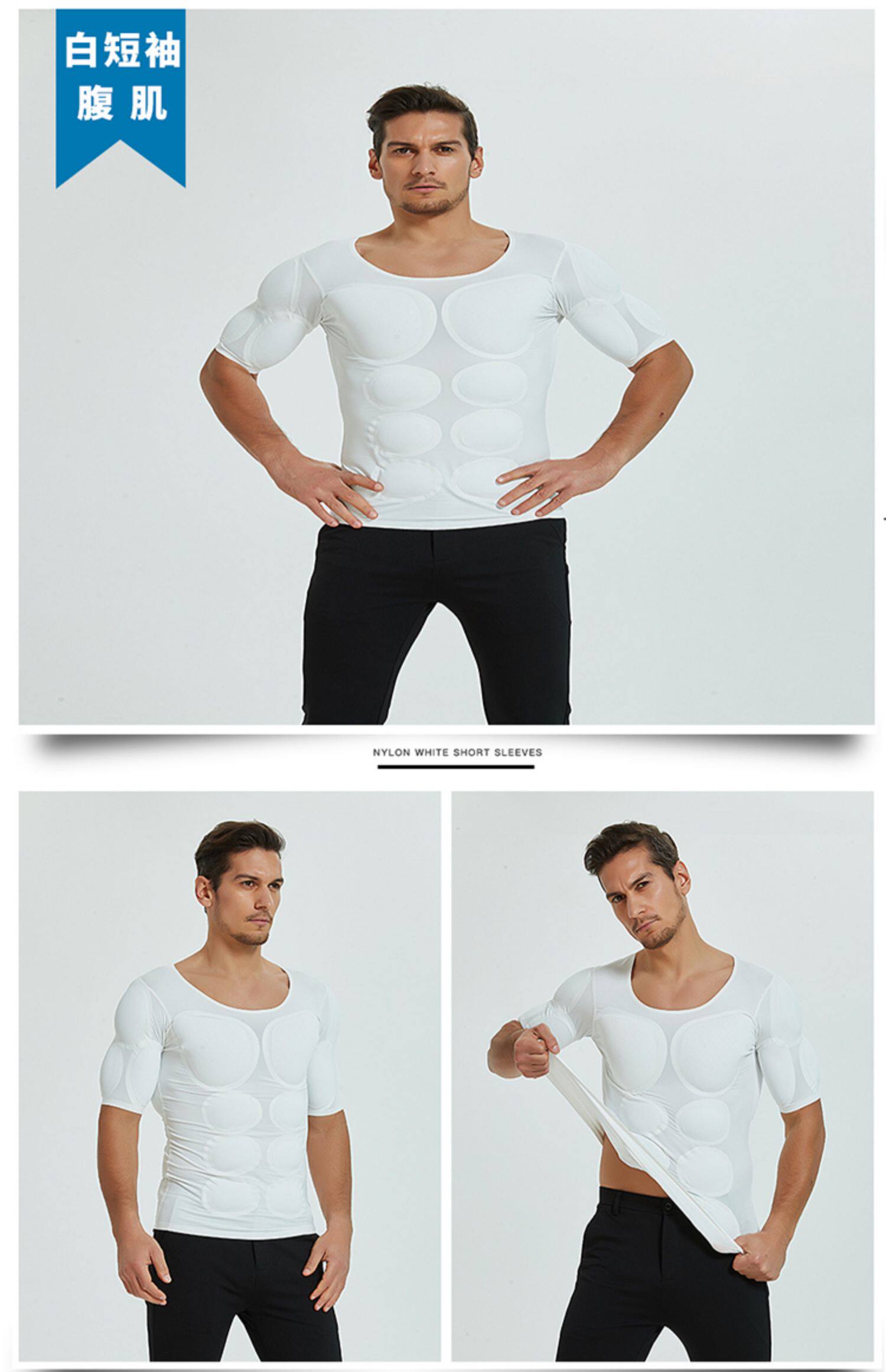 新款無痕白色假肌肉衣服男士t恤隱形仿真假胸肌假腹肌墊肩增肥cos