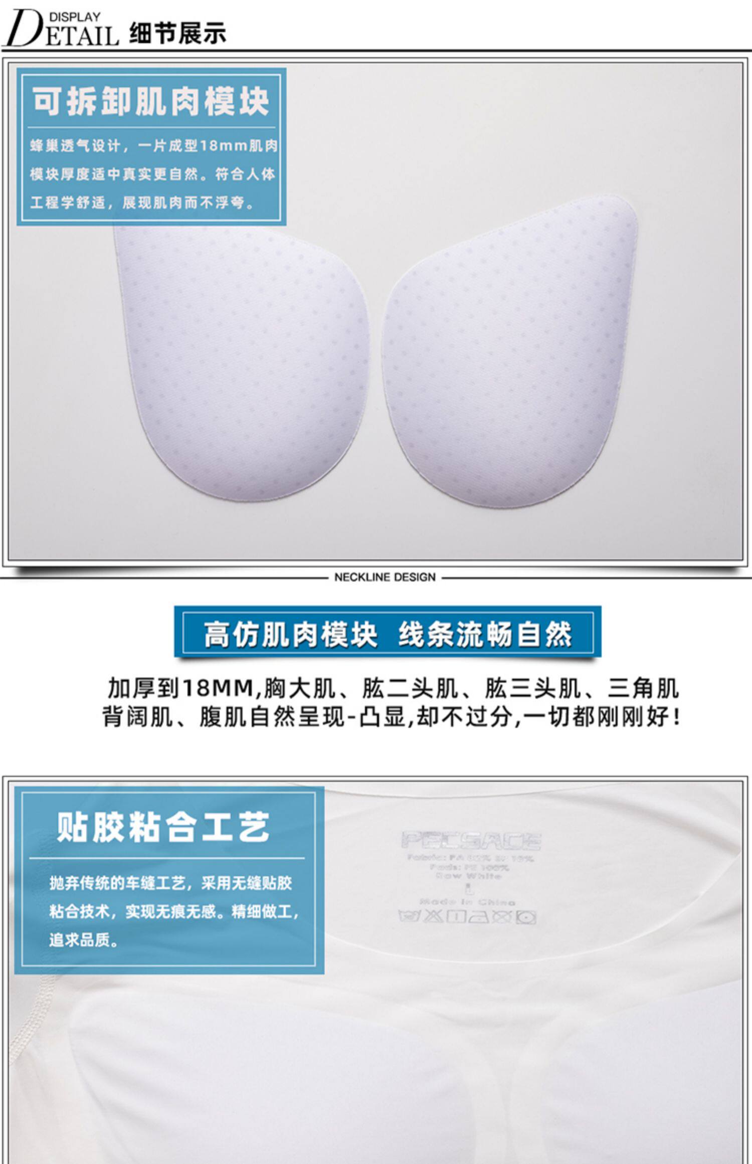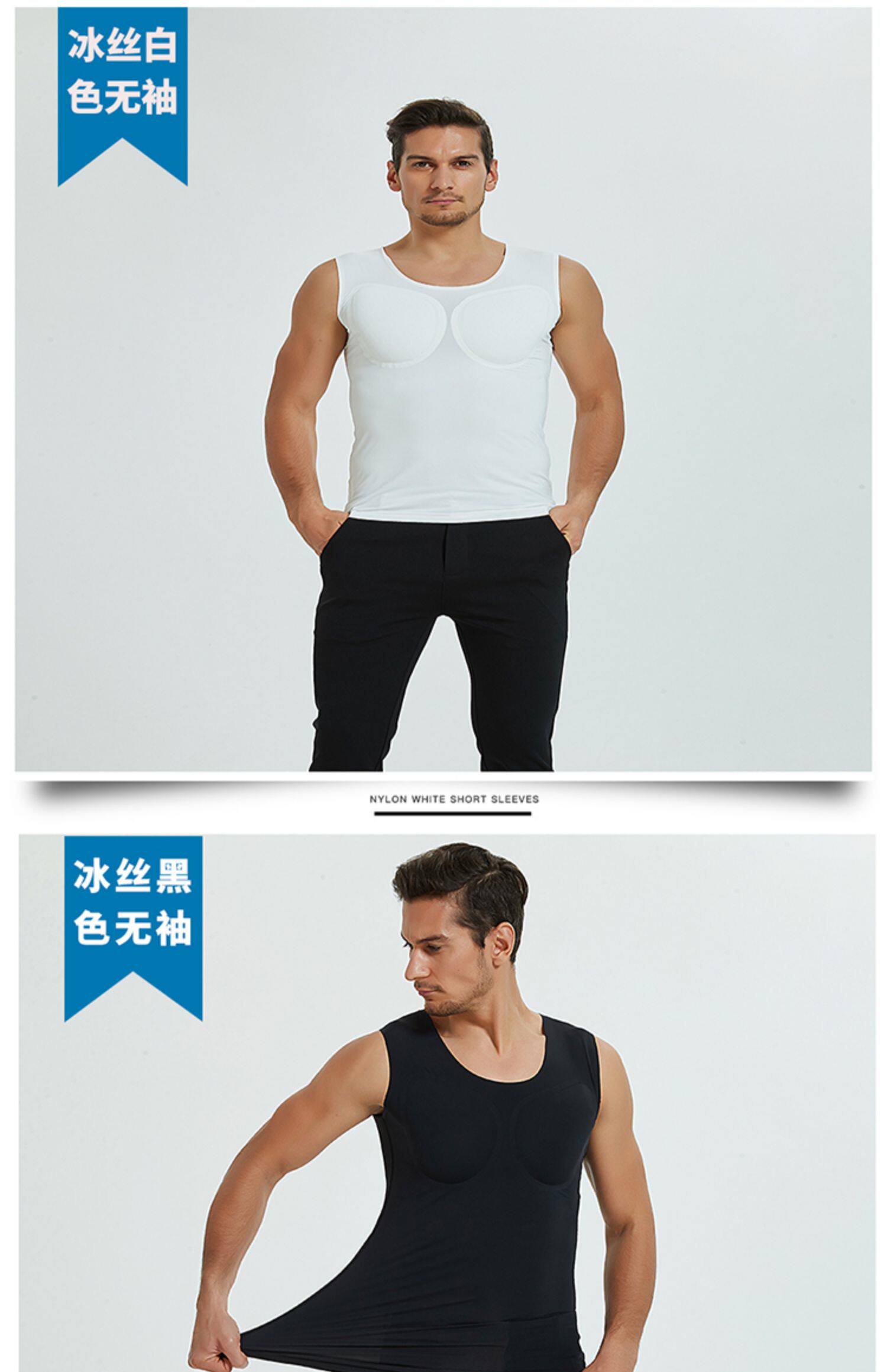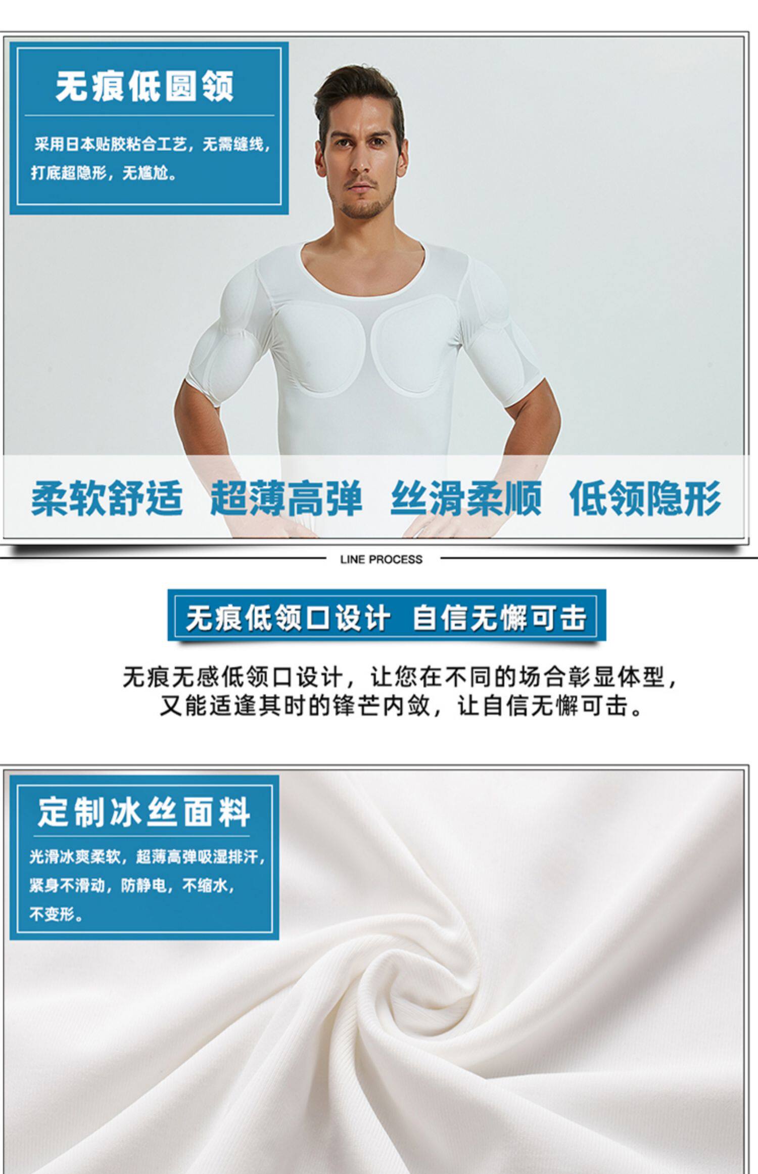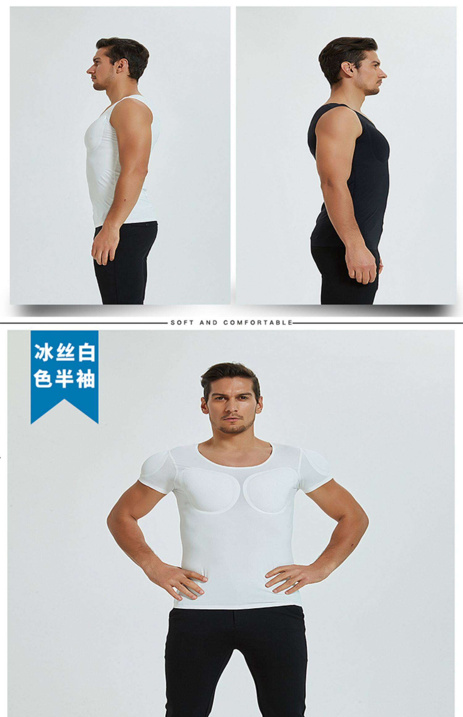 新款無痕白色假肌肉衣服男士t恤隱形仿真假胸肌假腹肌墊肩增肥cos