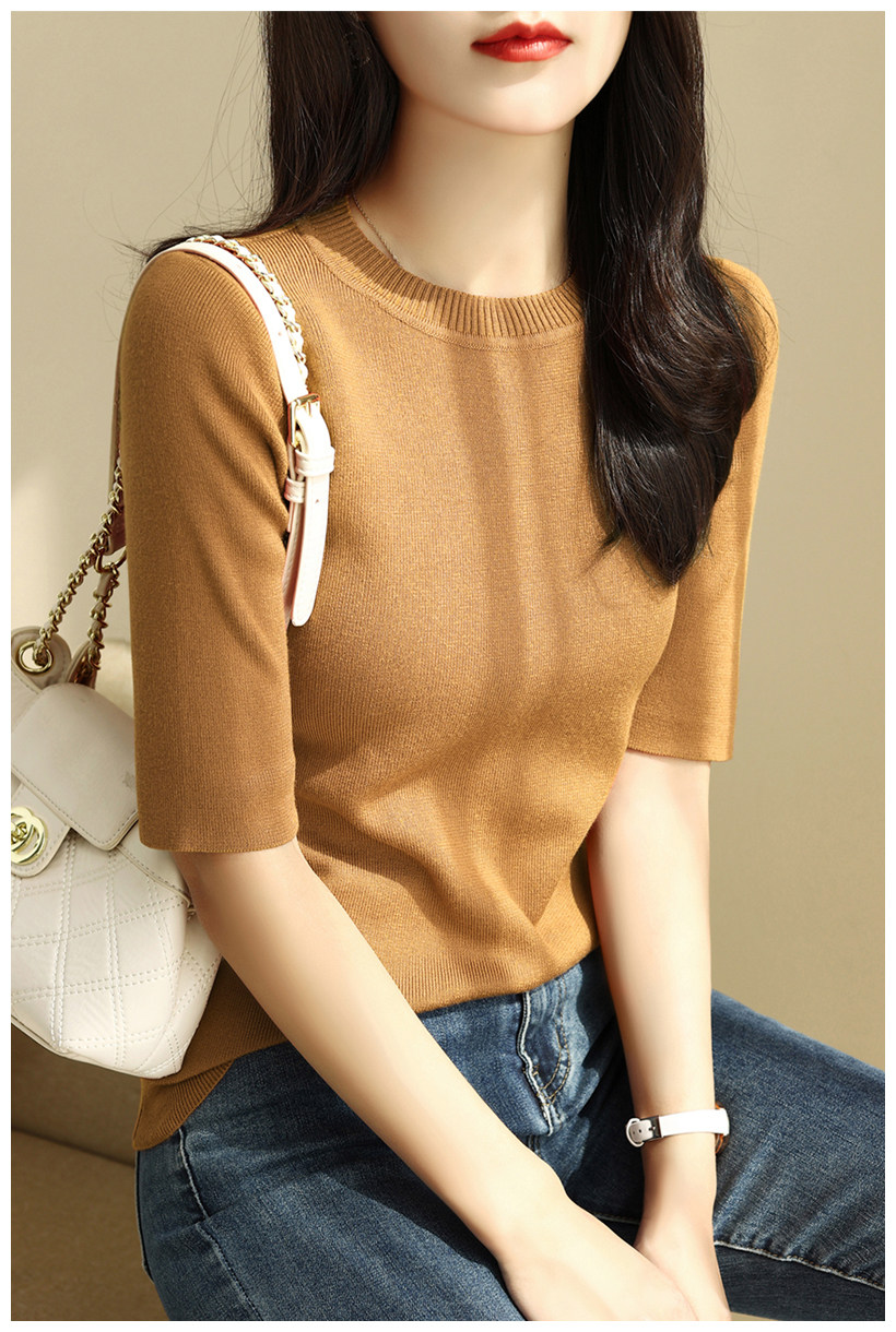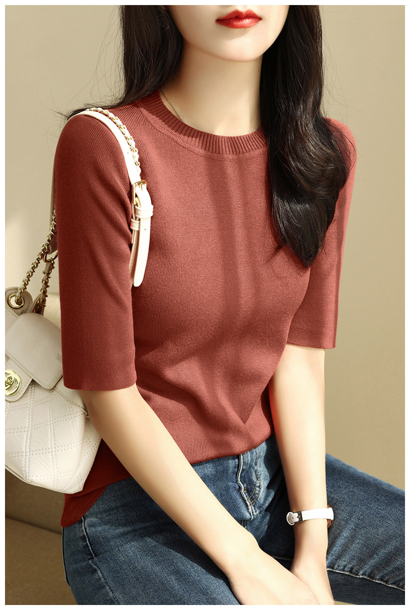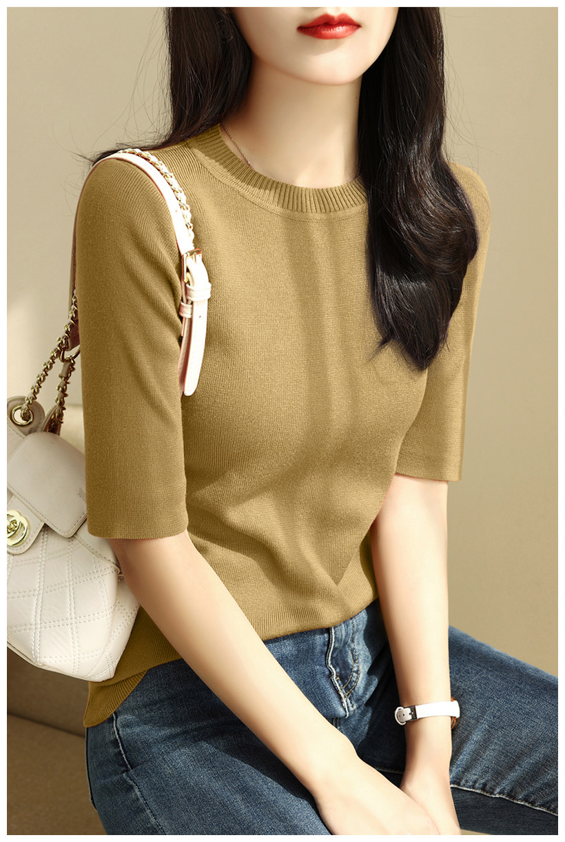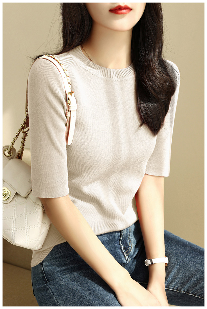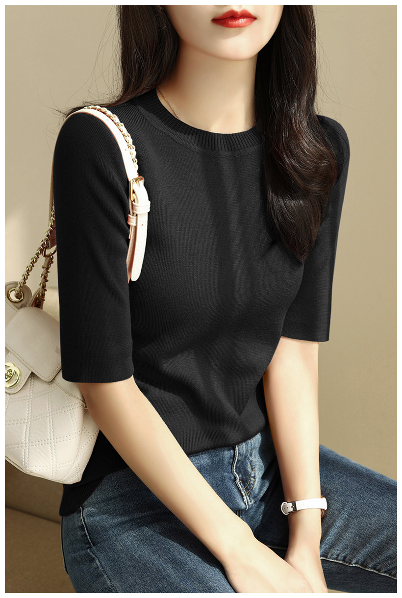 簡約圓領五分袖顯瘦打底衫2025年時尚春秋百搭中袖修身針織衫上衣