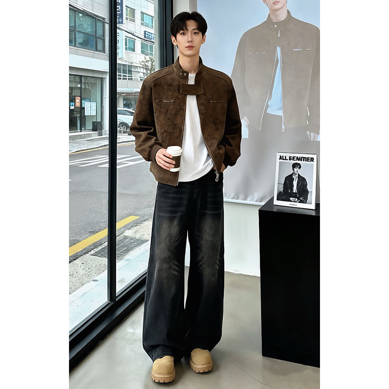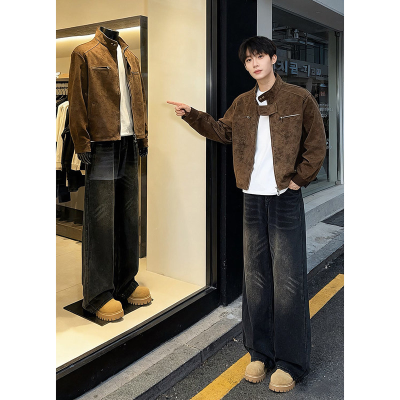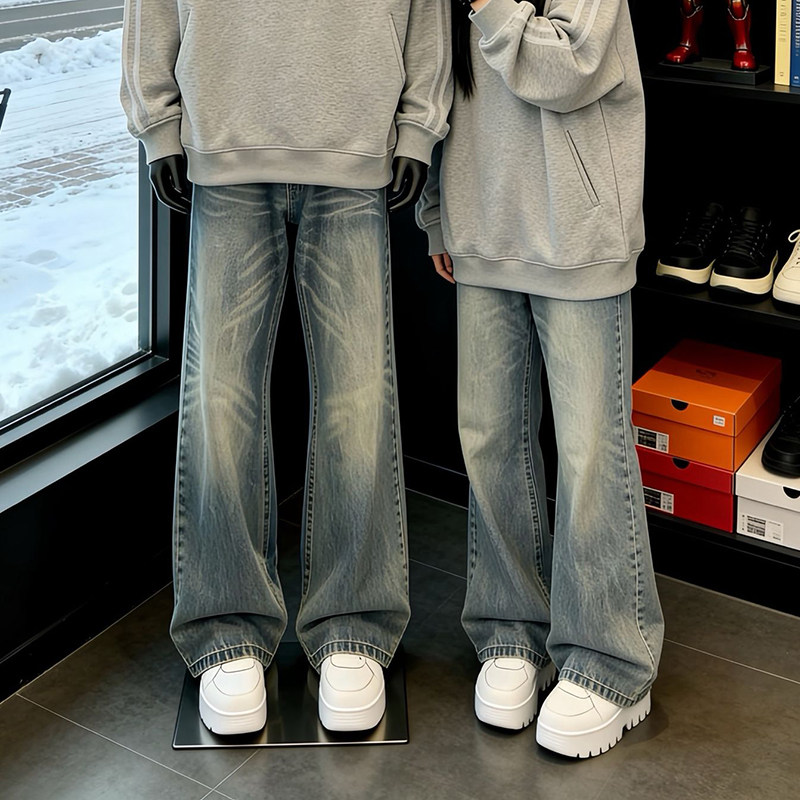 黑色美式微喇牛仔褲男冬季加絨加厚褲子新塘高質量復古寬鬆彎刀褲