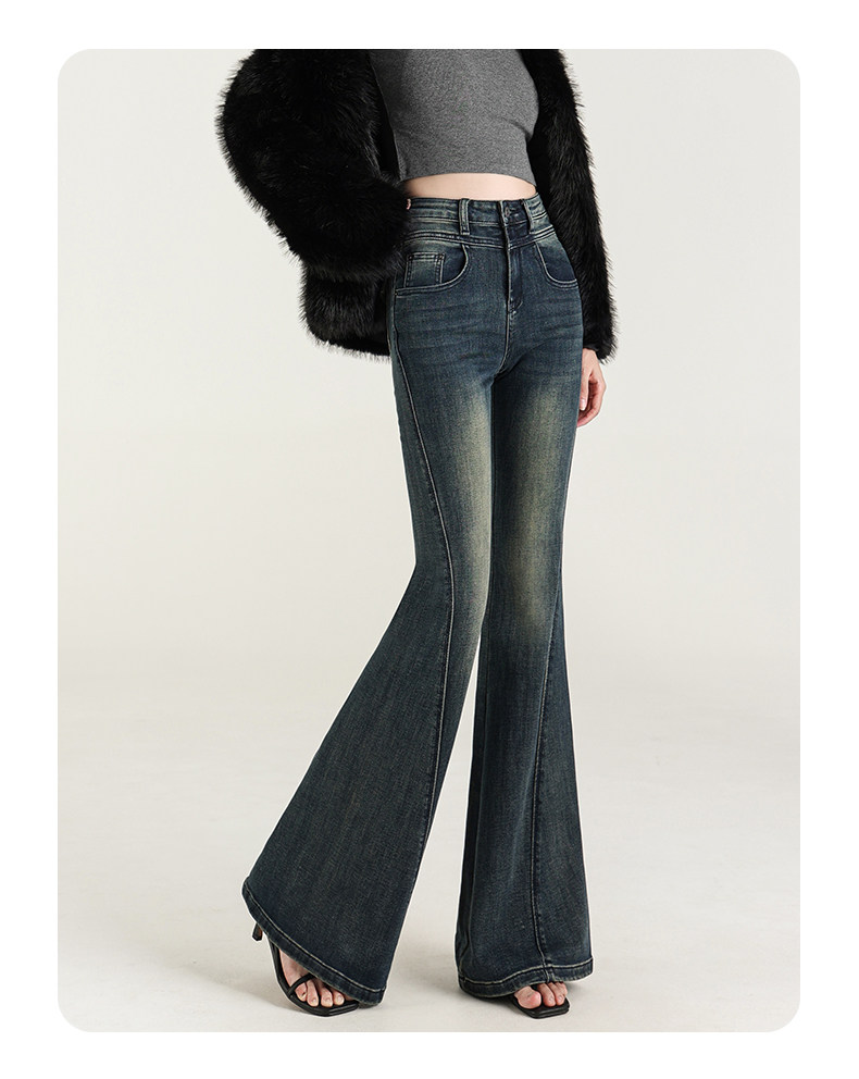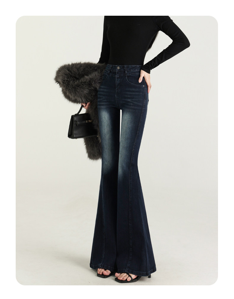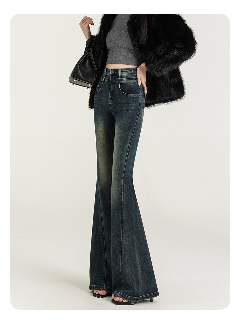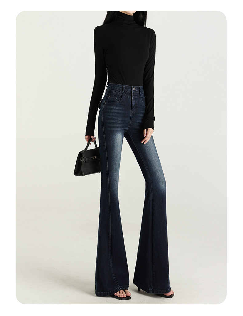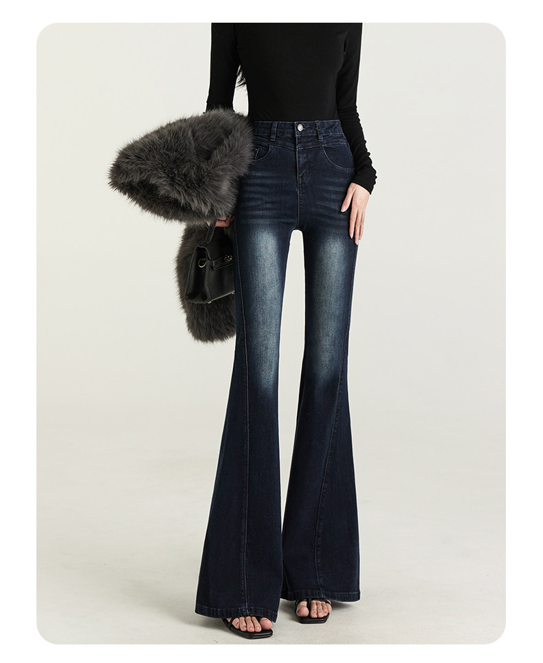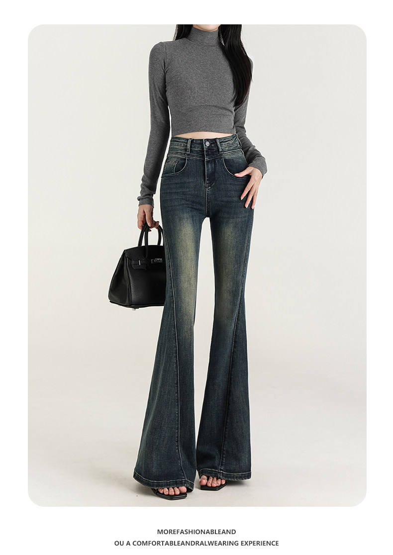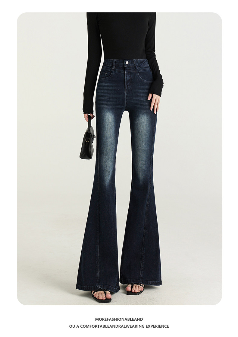 氣質設計感美式復古藍微喇牛仔褲女春季新款修身拖地緊身喇叭褲子