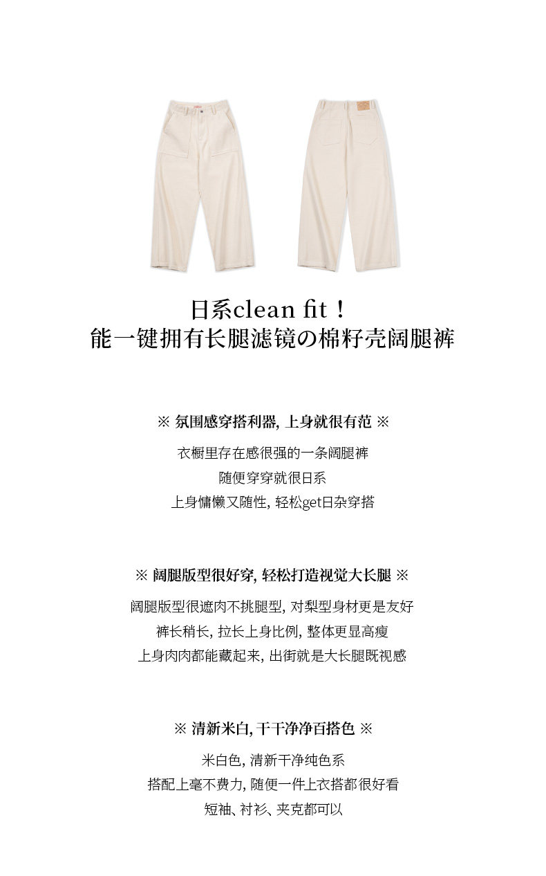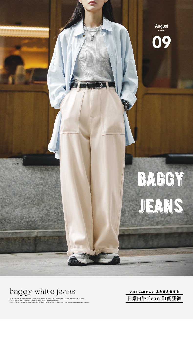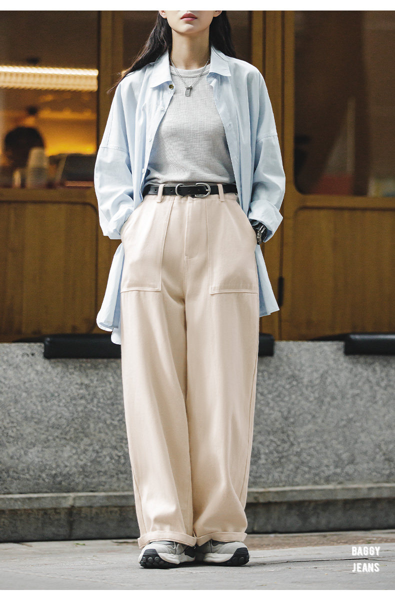 馬登老錢風米白色直筒高腰濶腿牛仔褲垂墜感寬鬆工裝休閒長褲子女