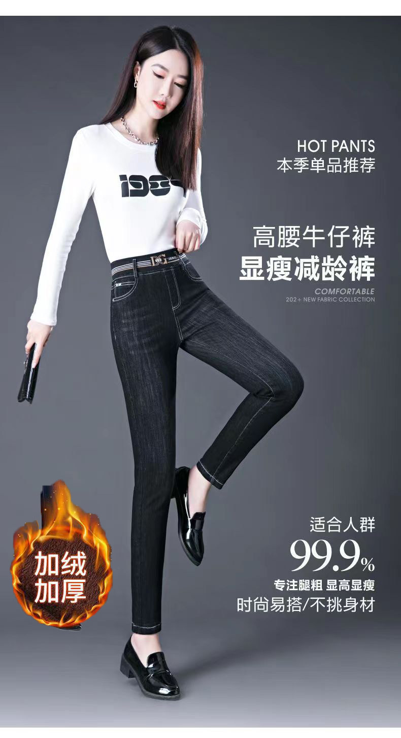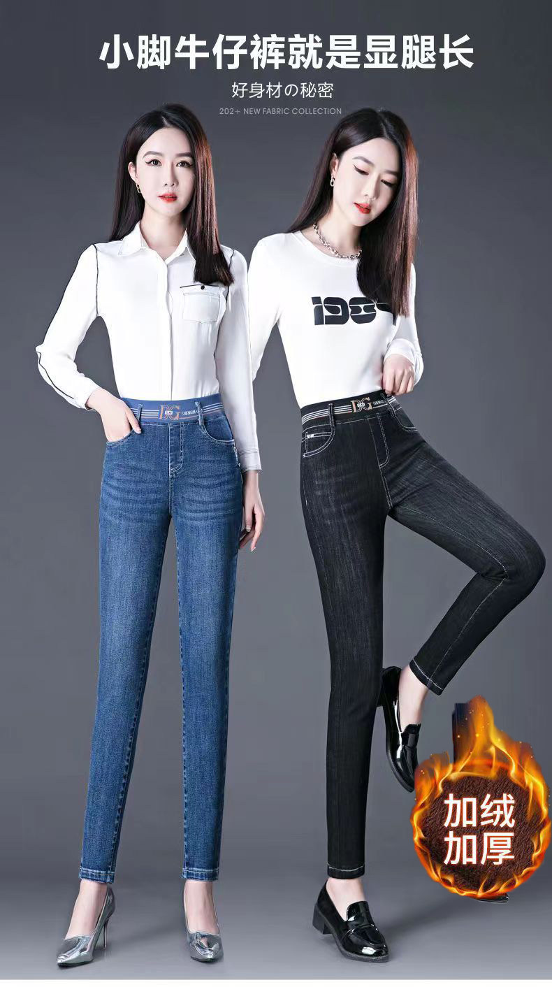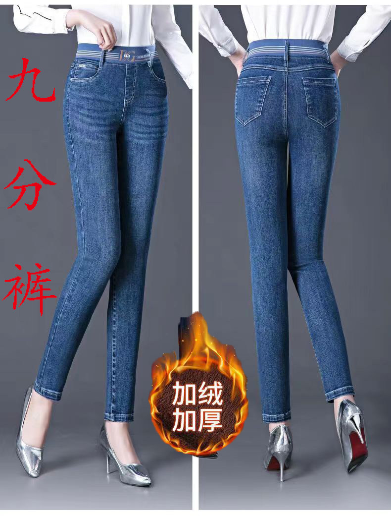 加絨加厚九分牛仔褲女小個子松緊腰彈力冬季保暖褲百搭高腰小腳褲