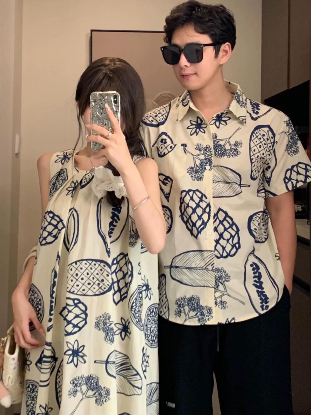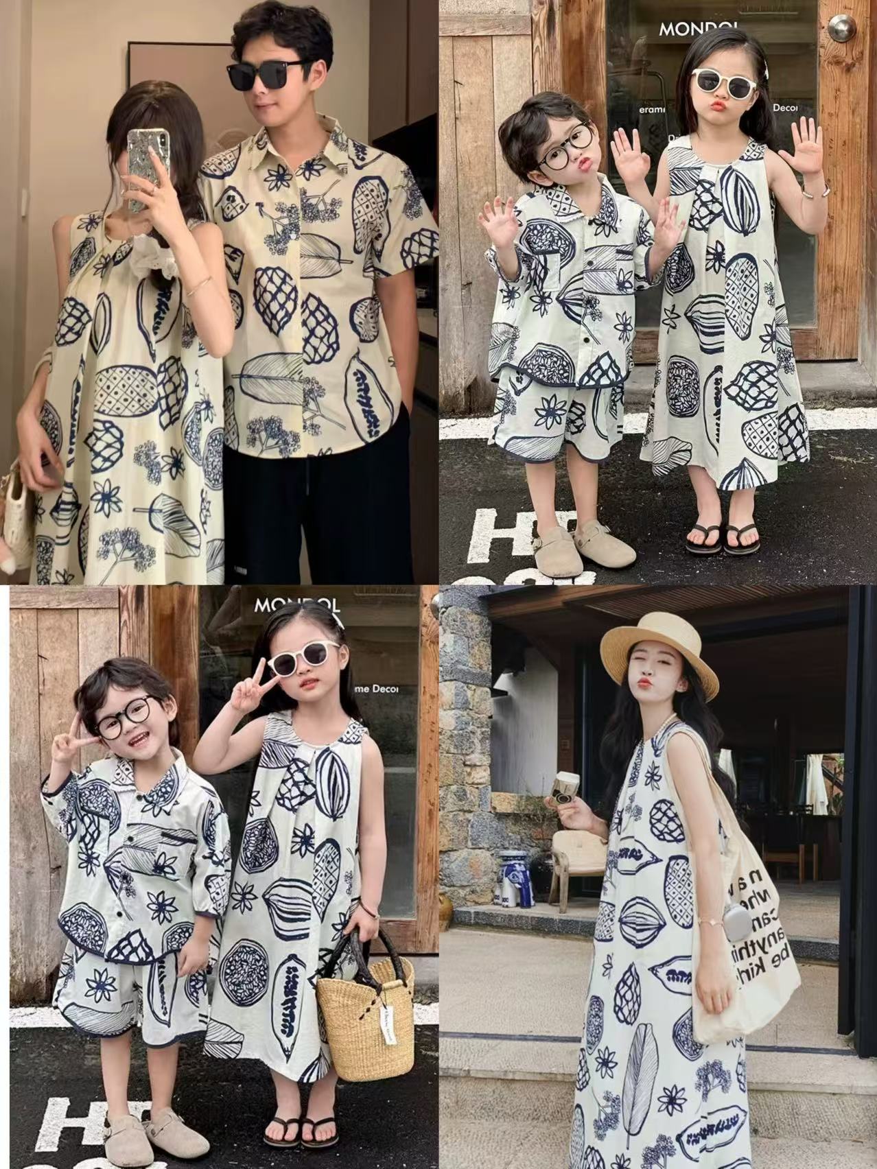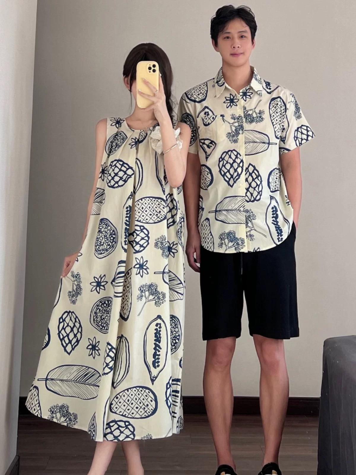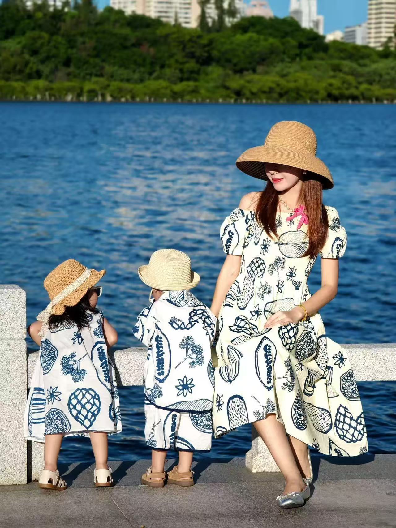夏威夷親子裝夏裝花襯衫2025新款一家三口海邊度假母女寬松連衣裙