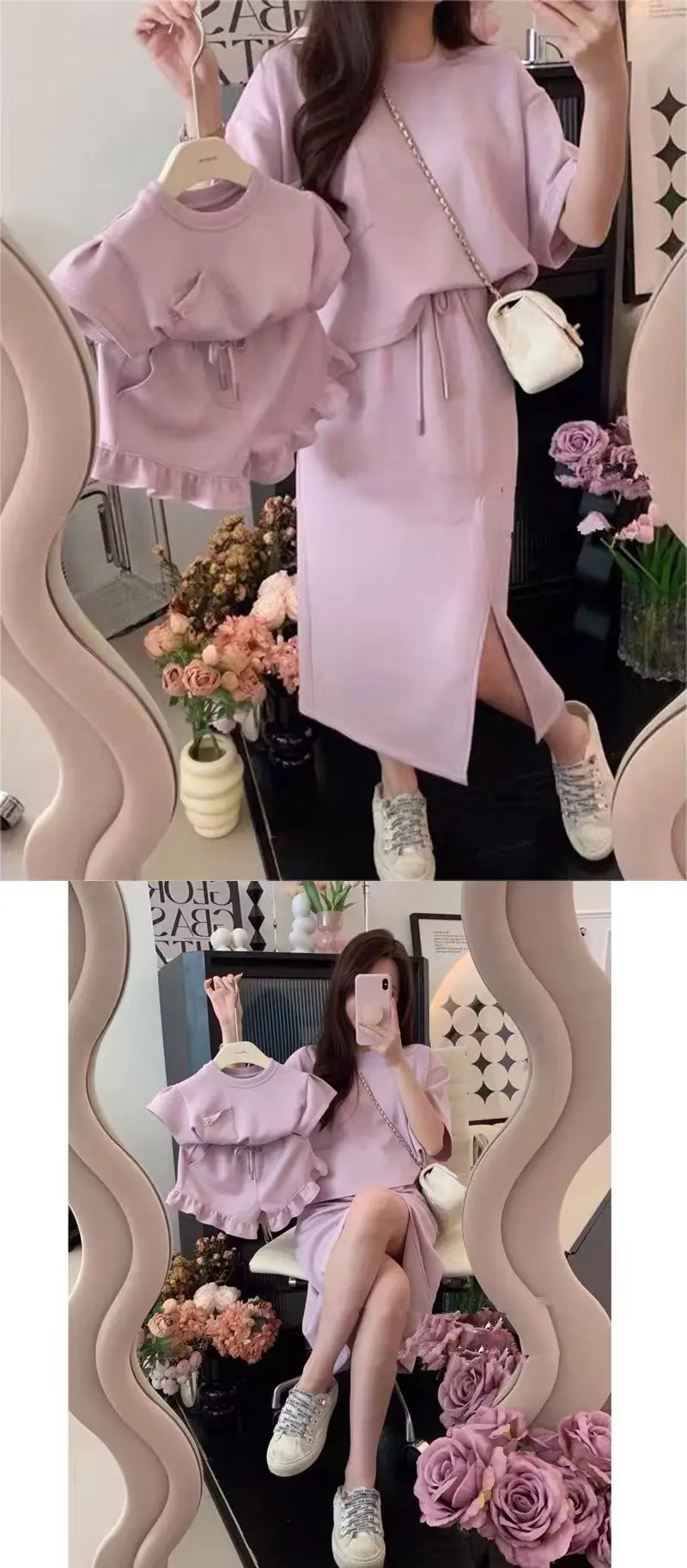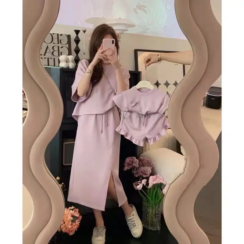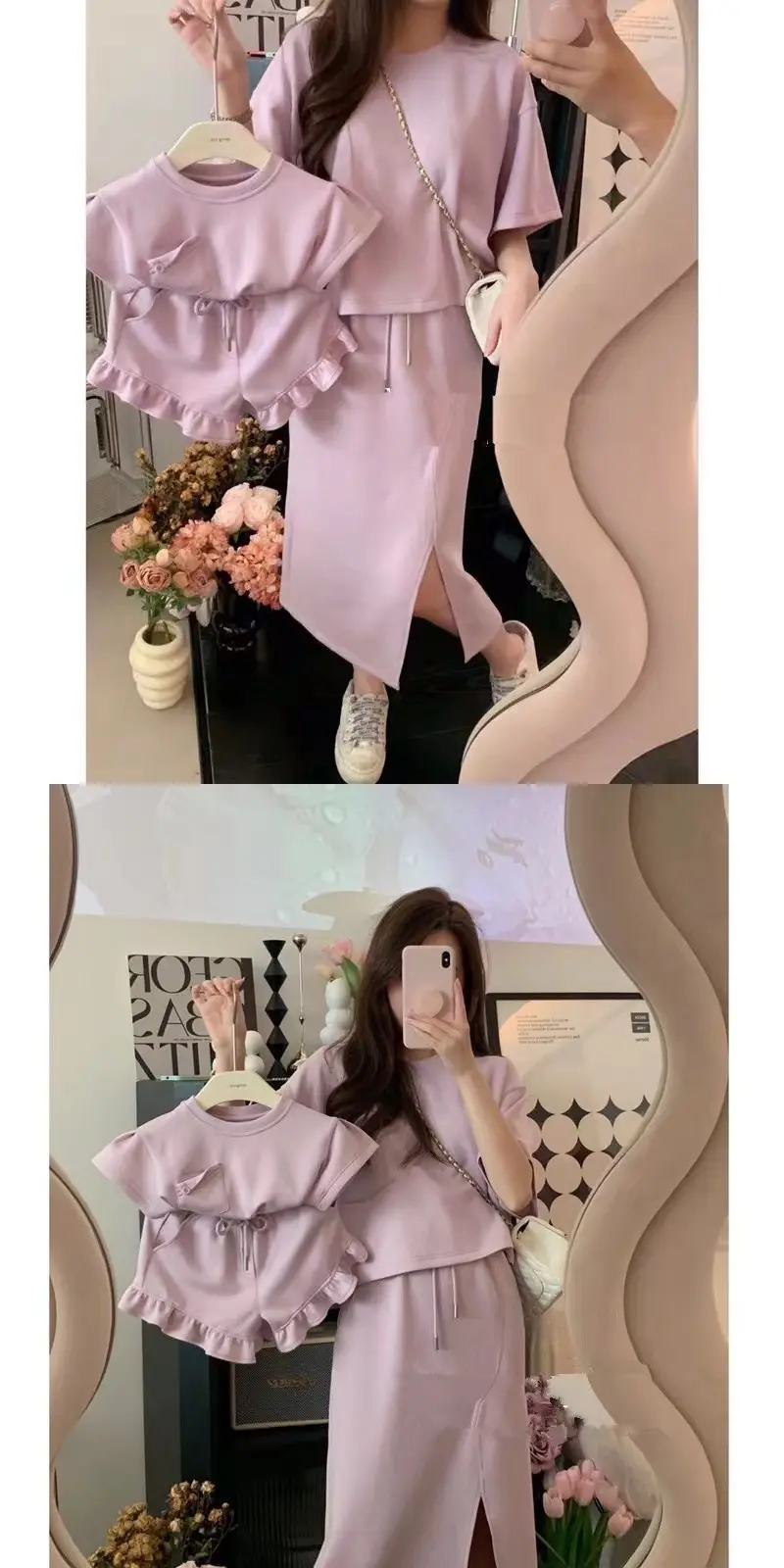 親子裝夏季新款母女親子炸街套裝女童口袋T恤花邊短褲休閒套裝女