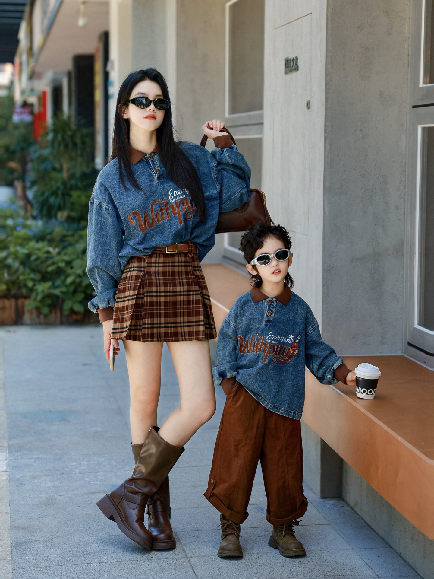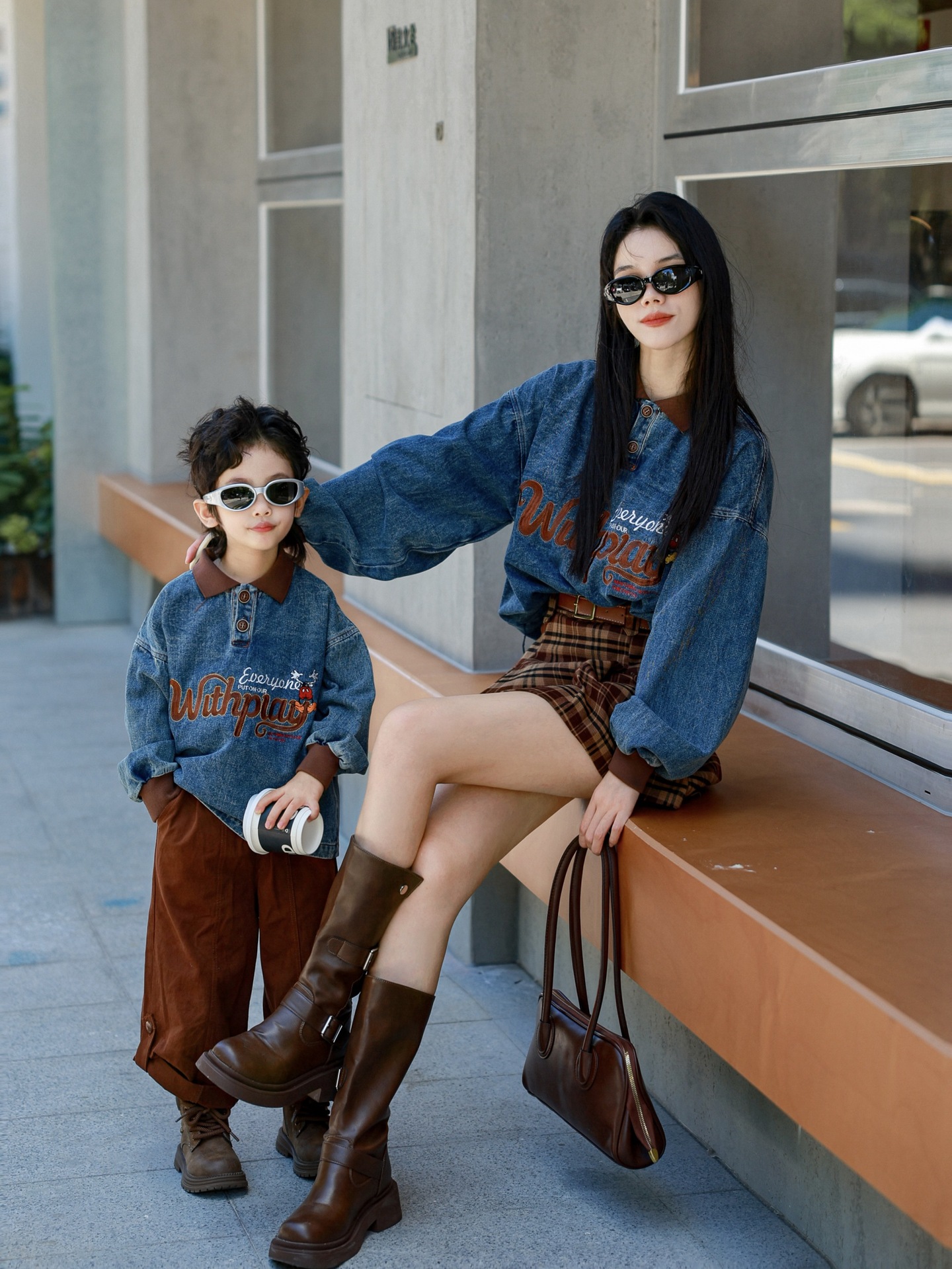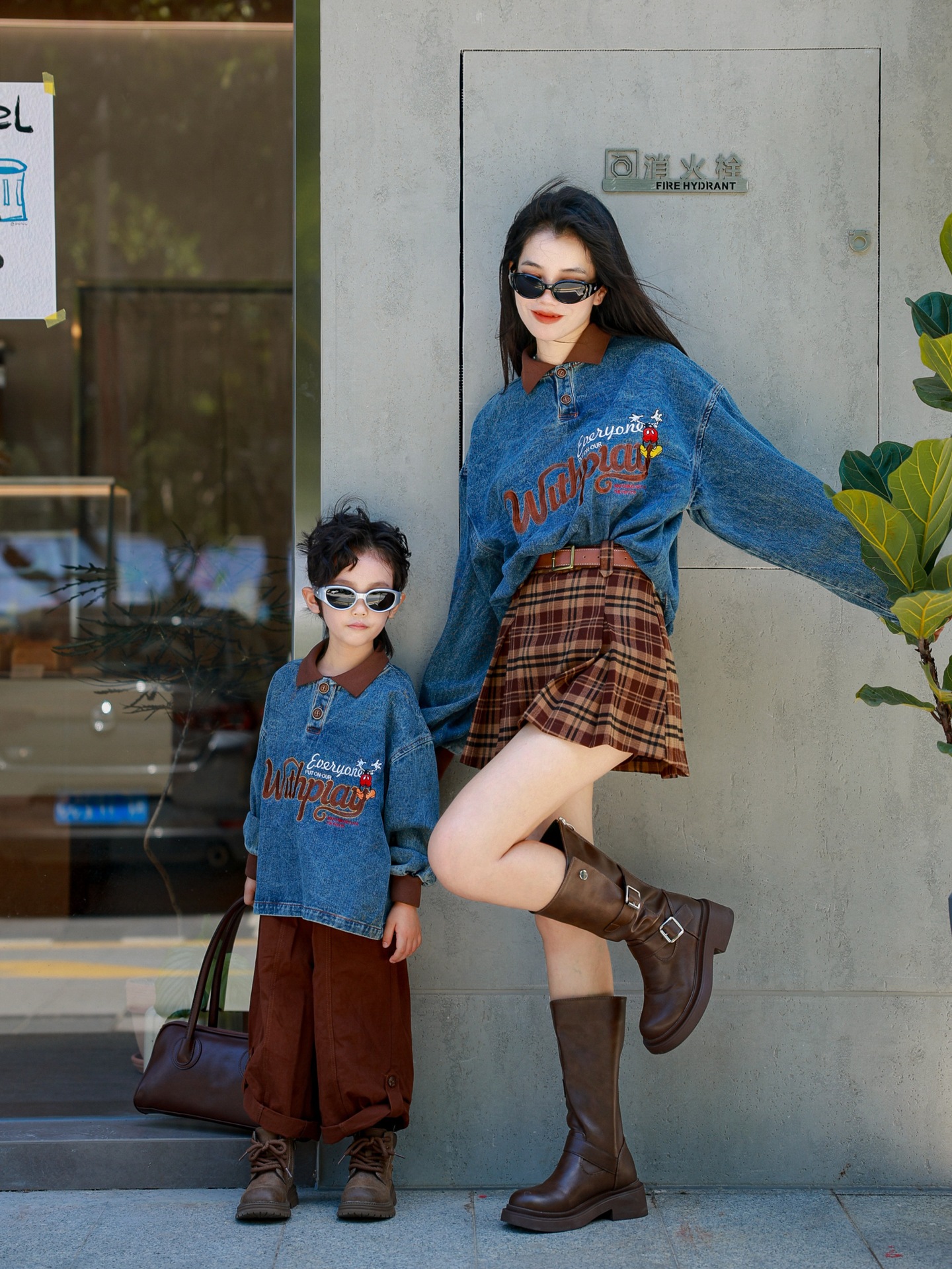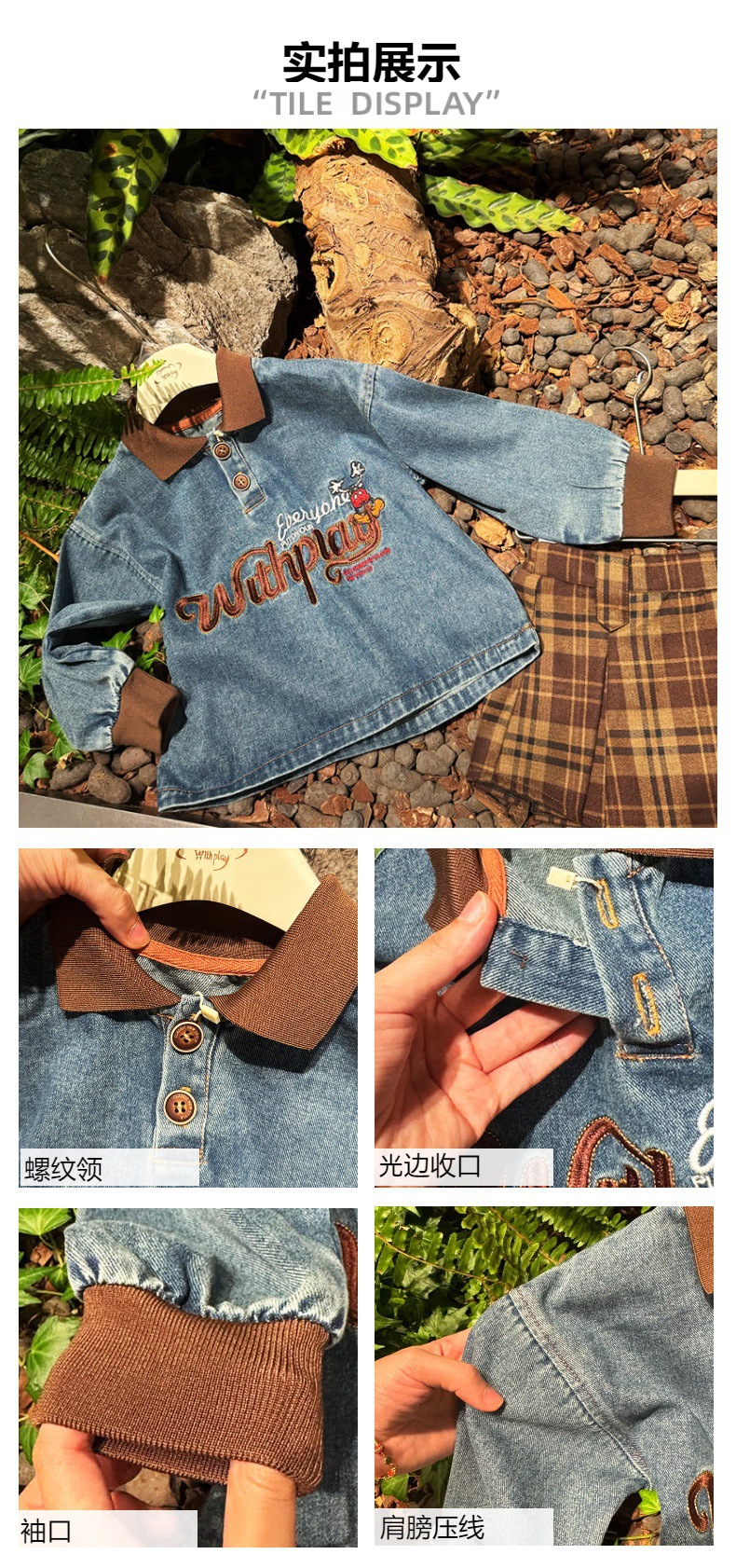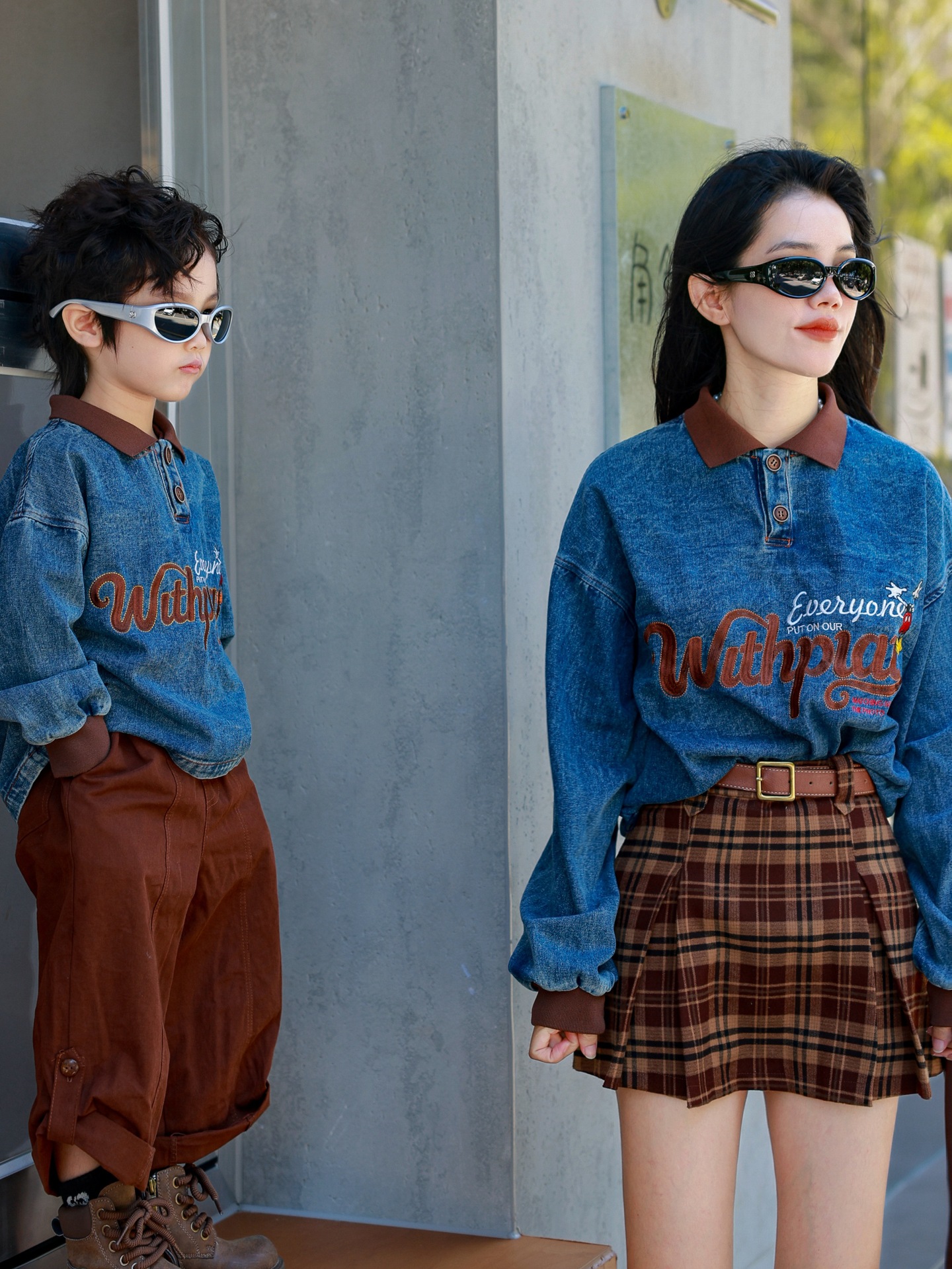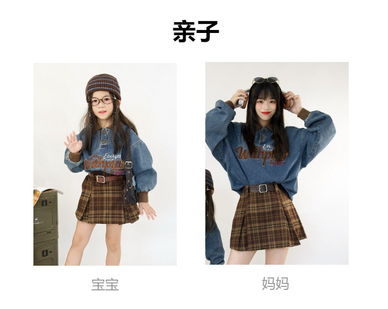 又潮又酷親子裝母子美式復古襯衫秋季新款兒童翻領字母刺綉牛仔衣