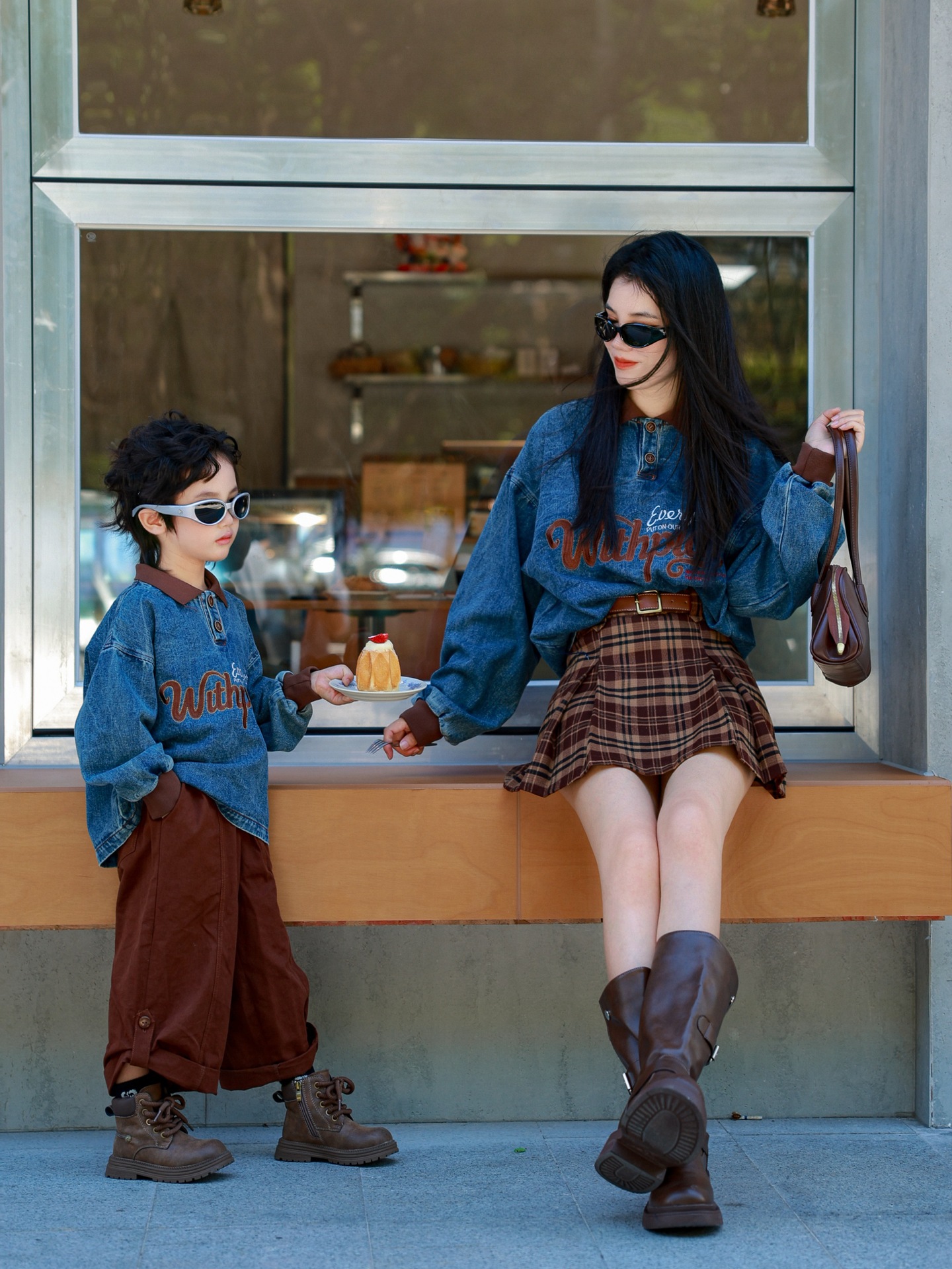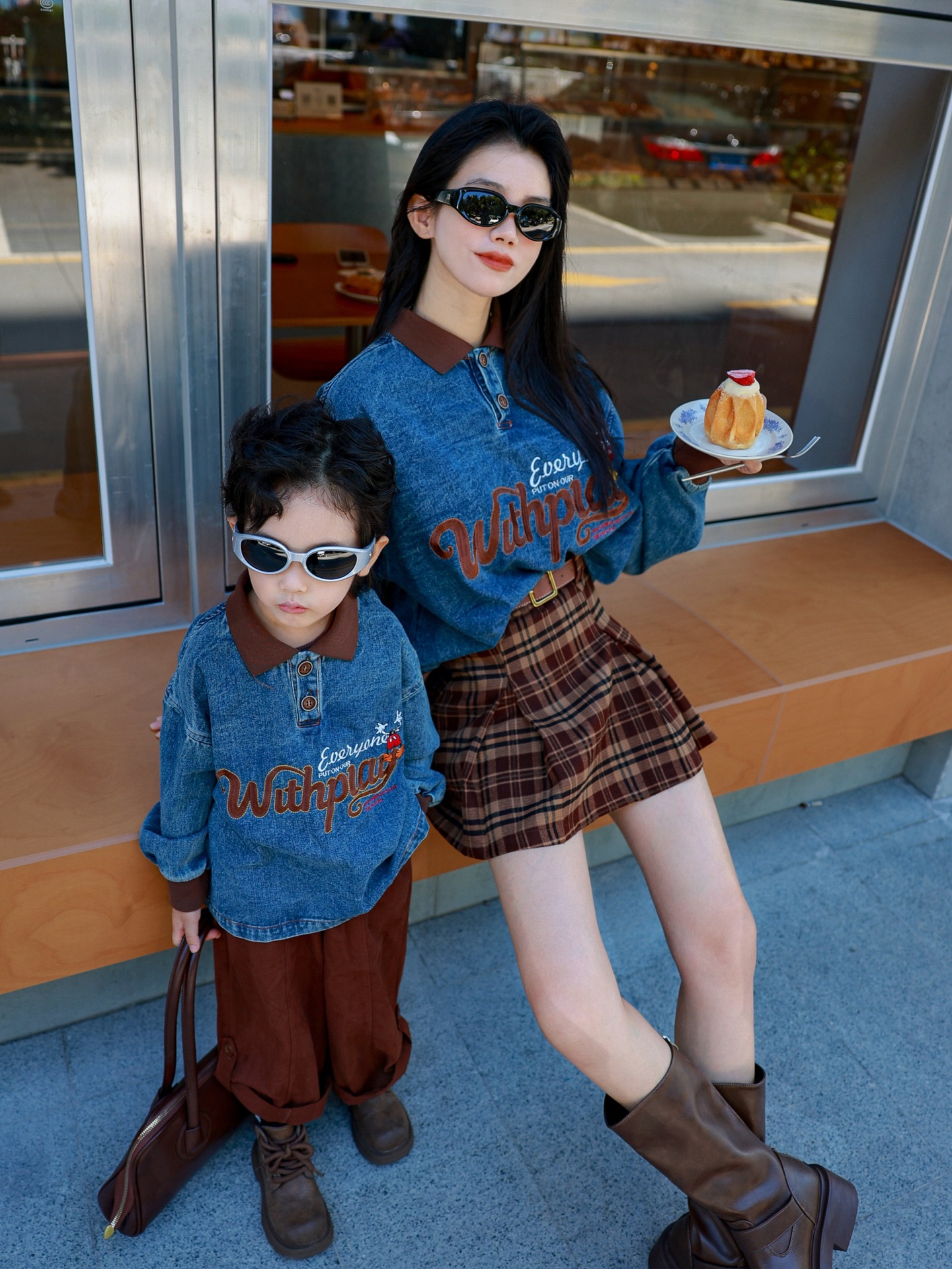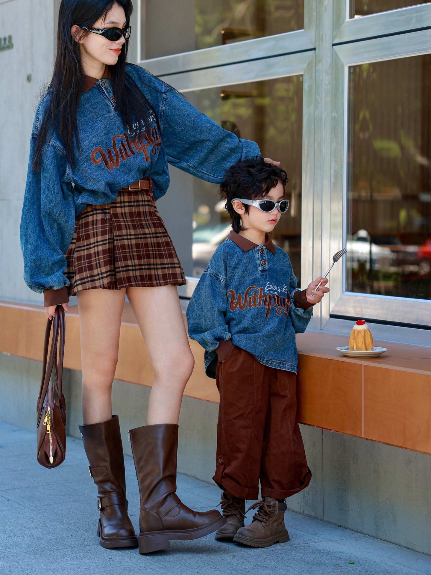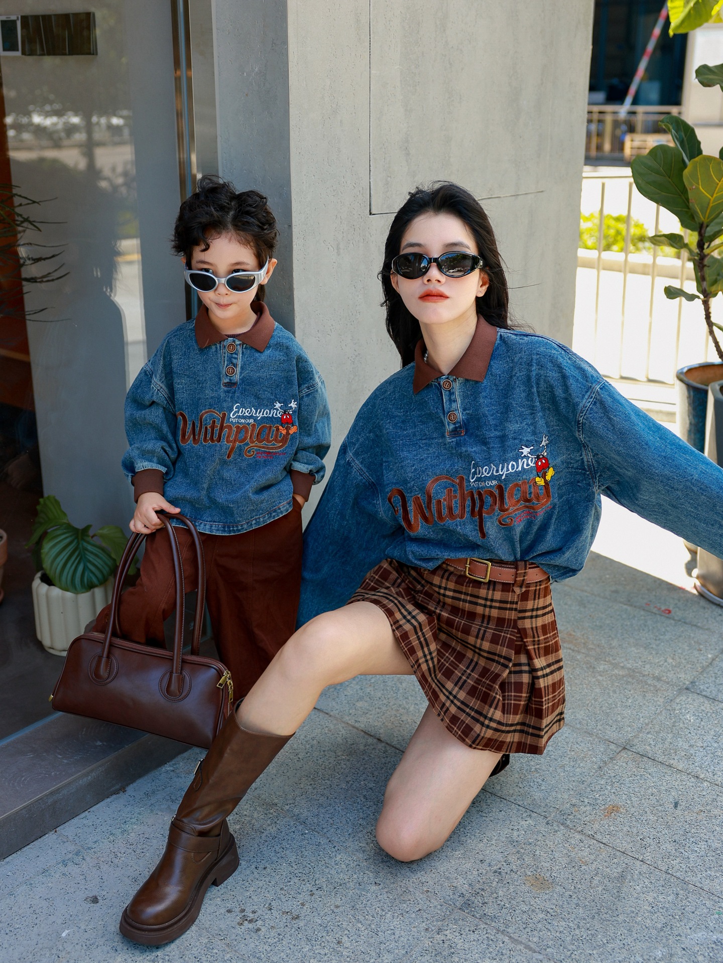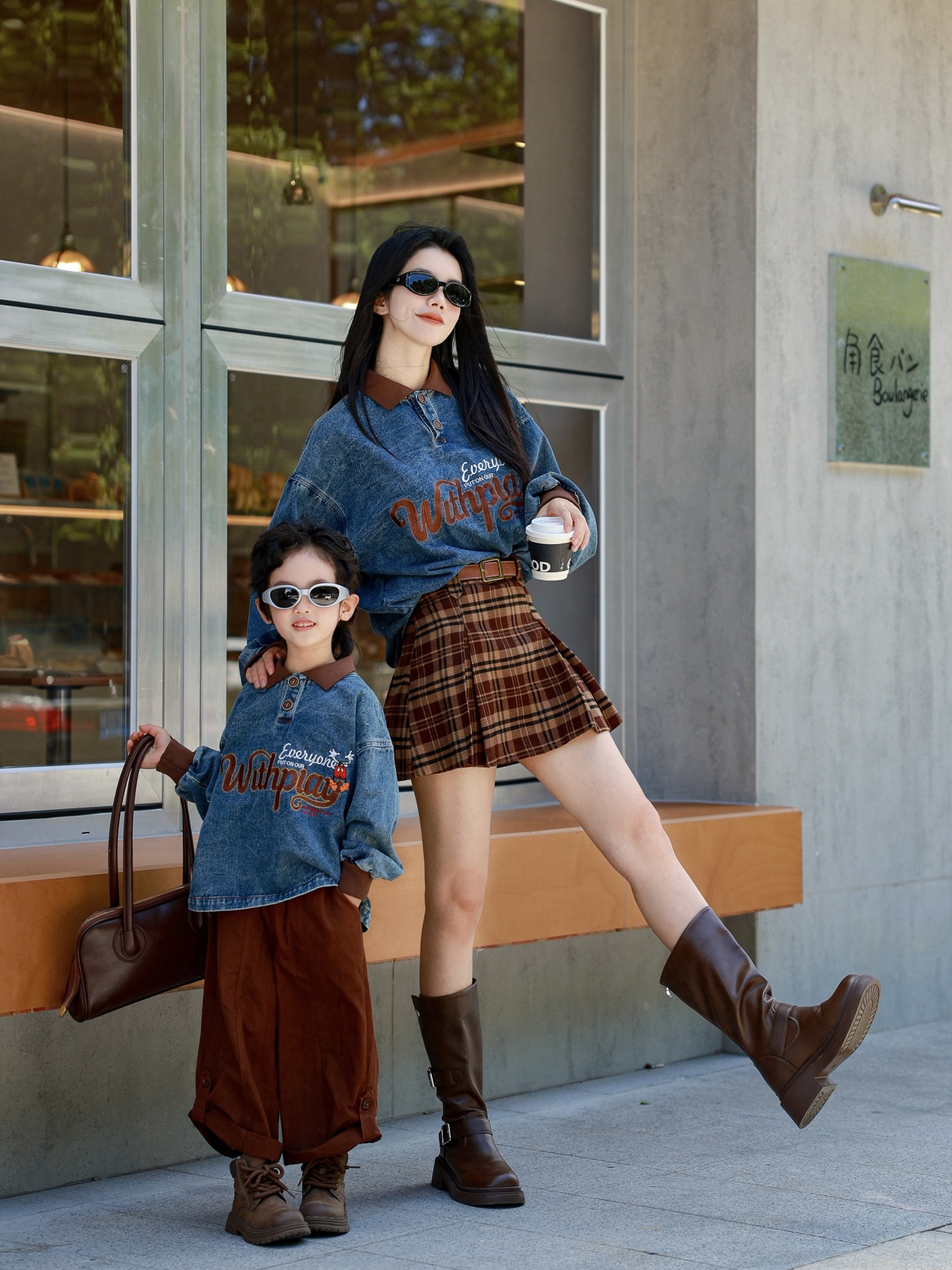 又潮又酷親子裝母子美式復古襯衫秋季新款兒童翻領字母刺綉牛仔衣