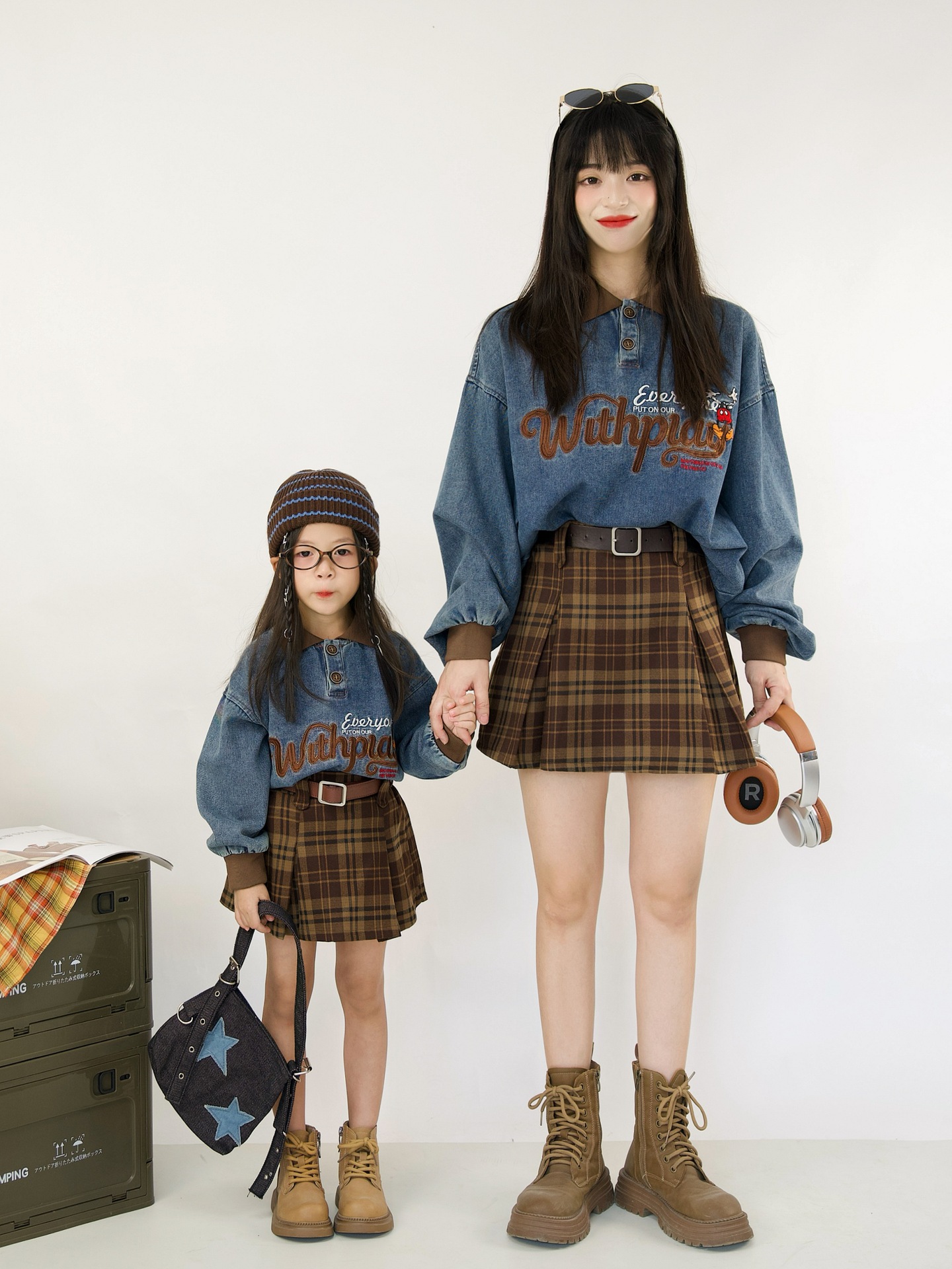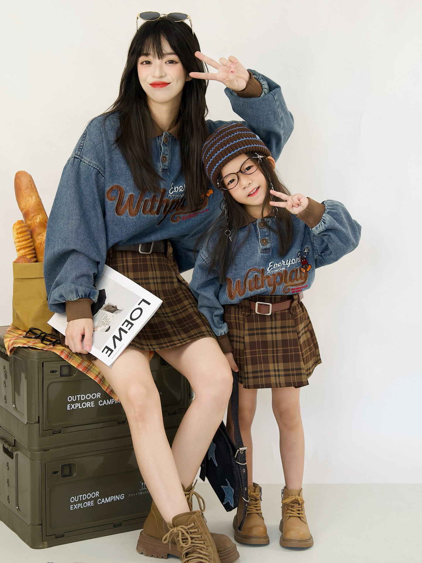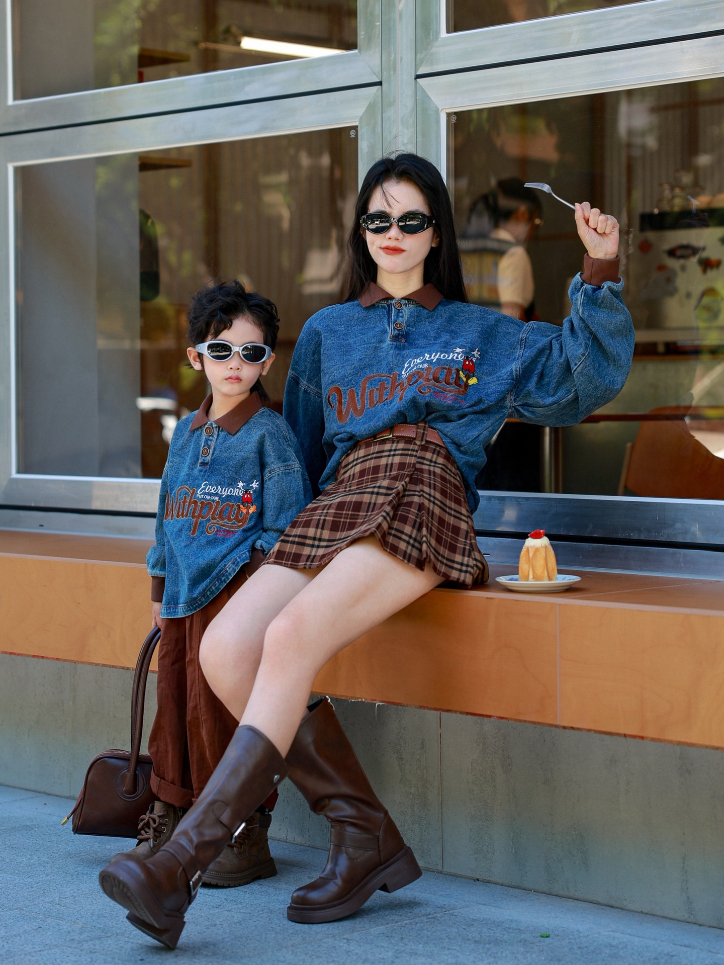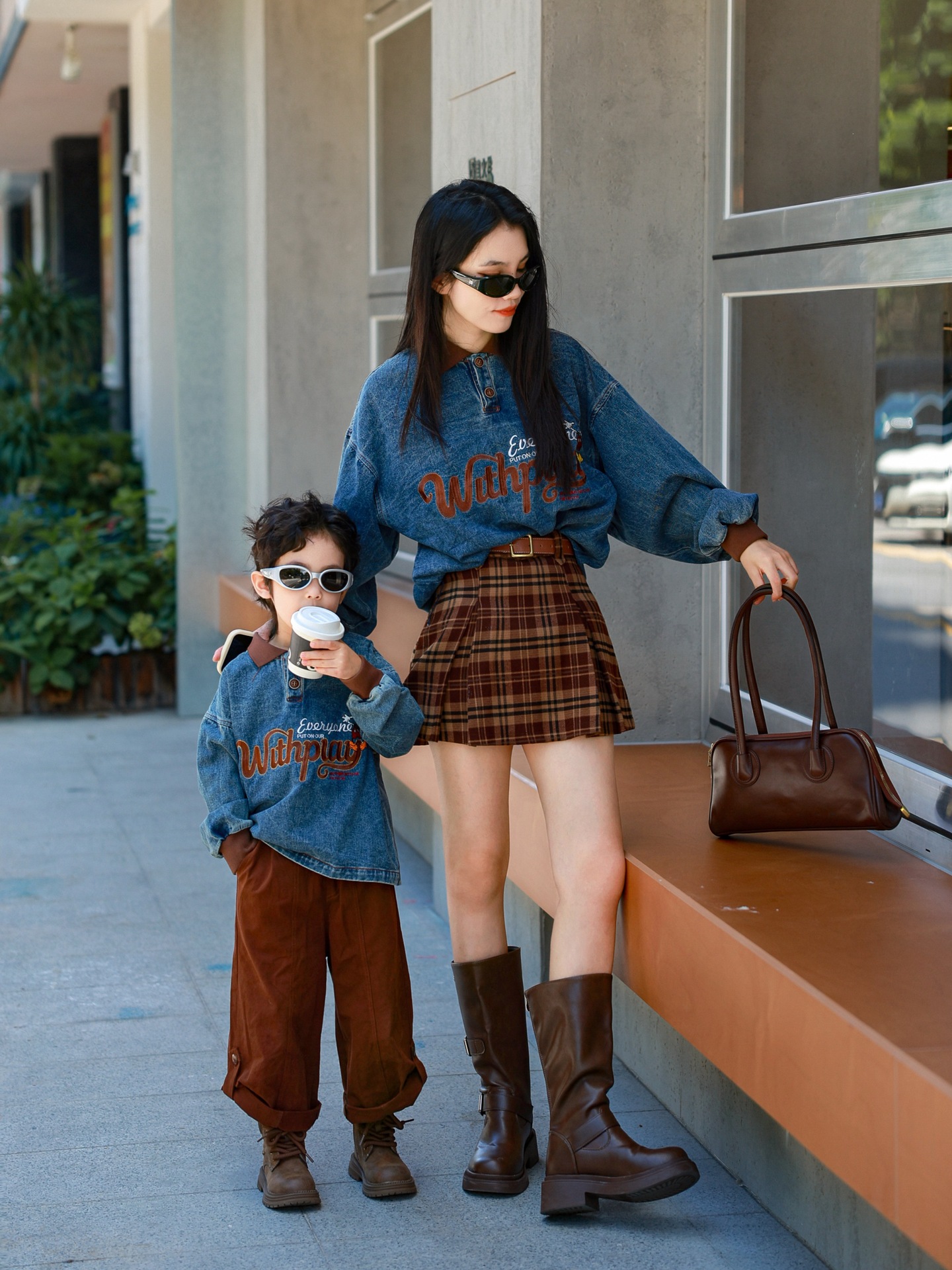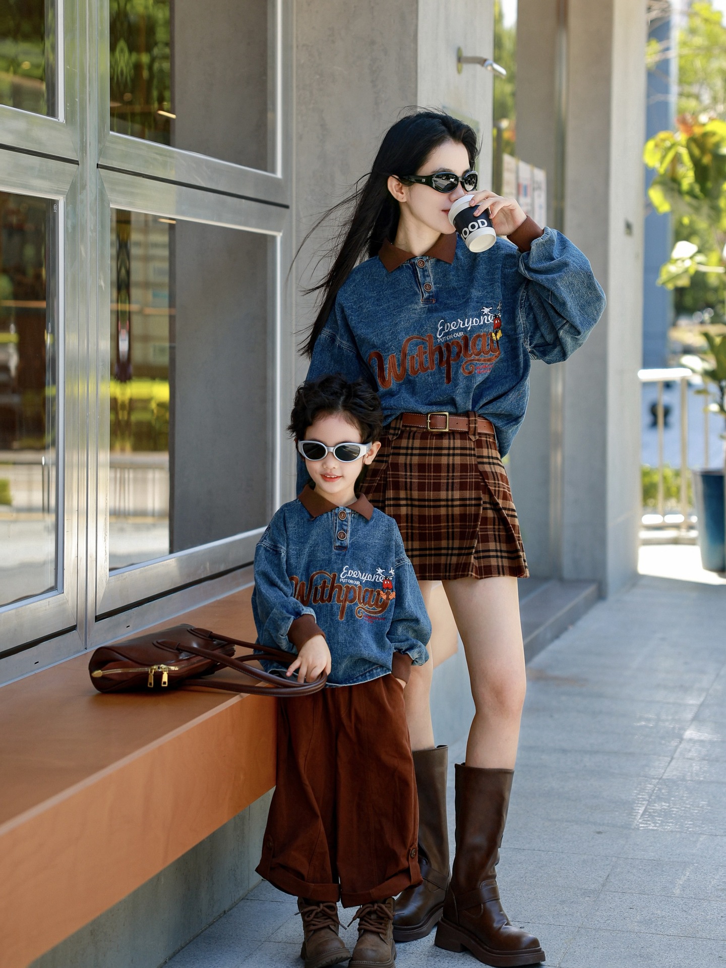 又潮又酷親子裝母子美式復古襯衫秋季新款兒童翻領字母刺綉牛仔衣