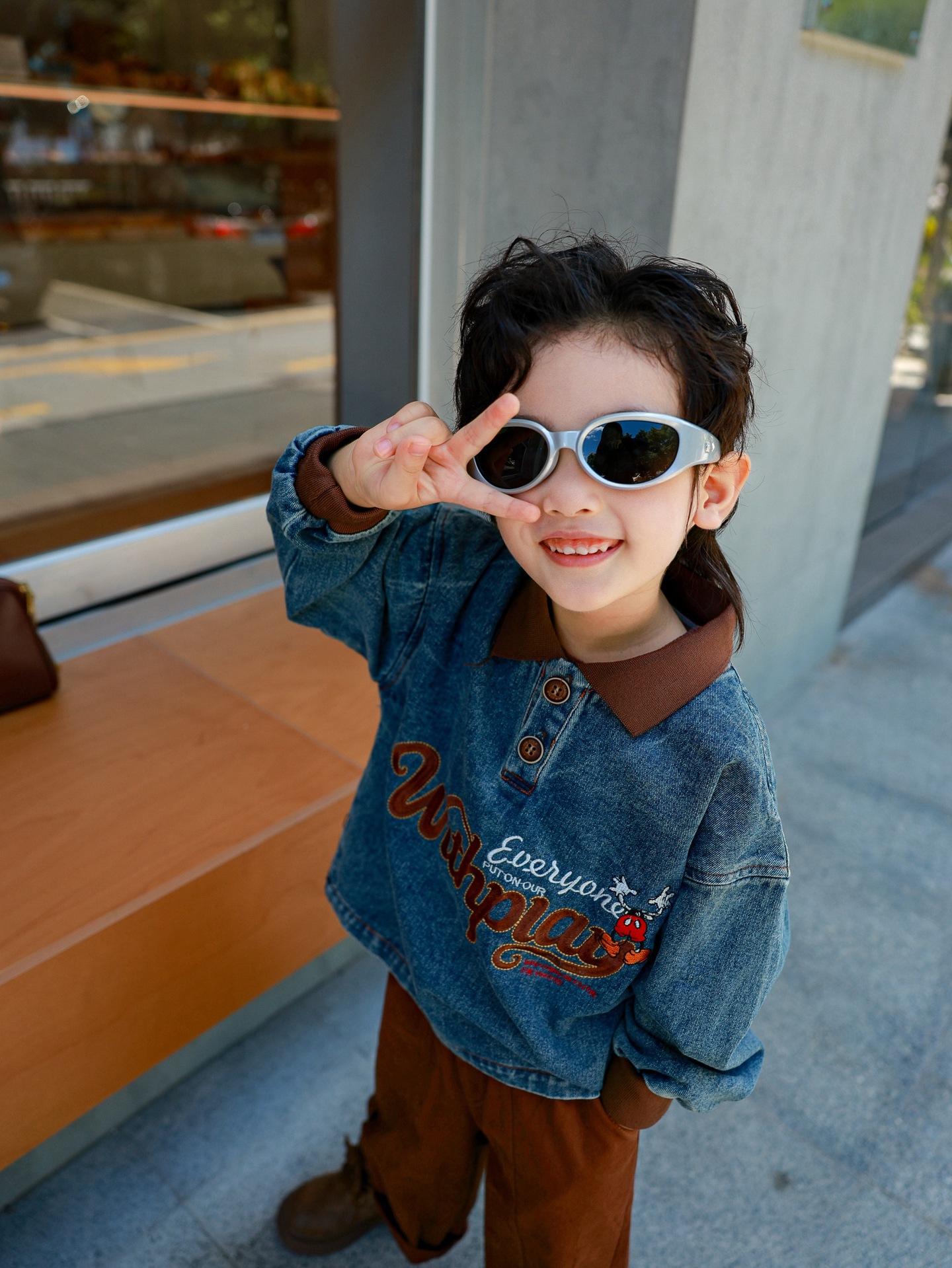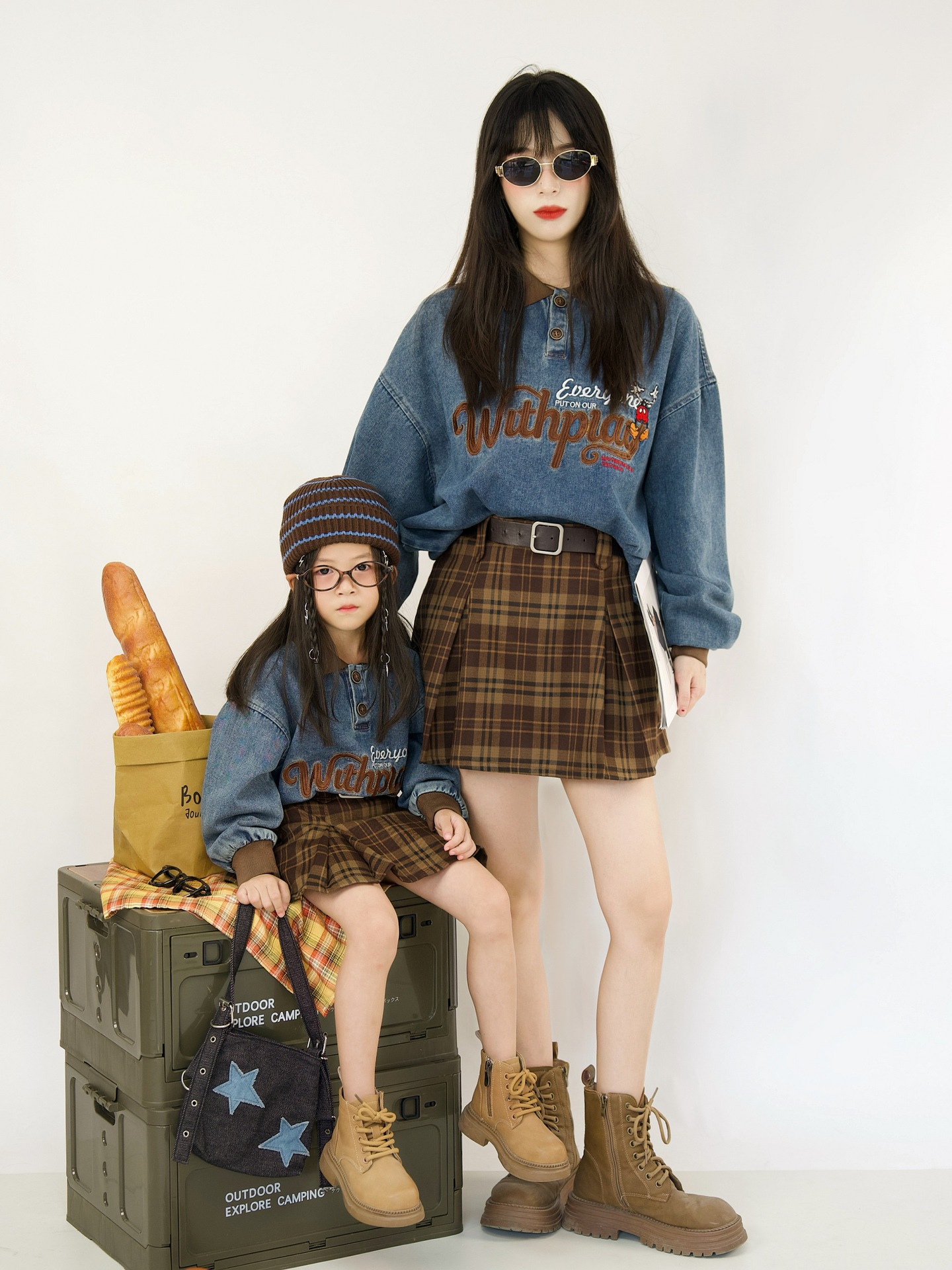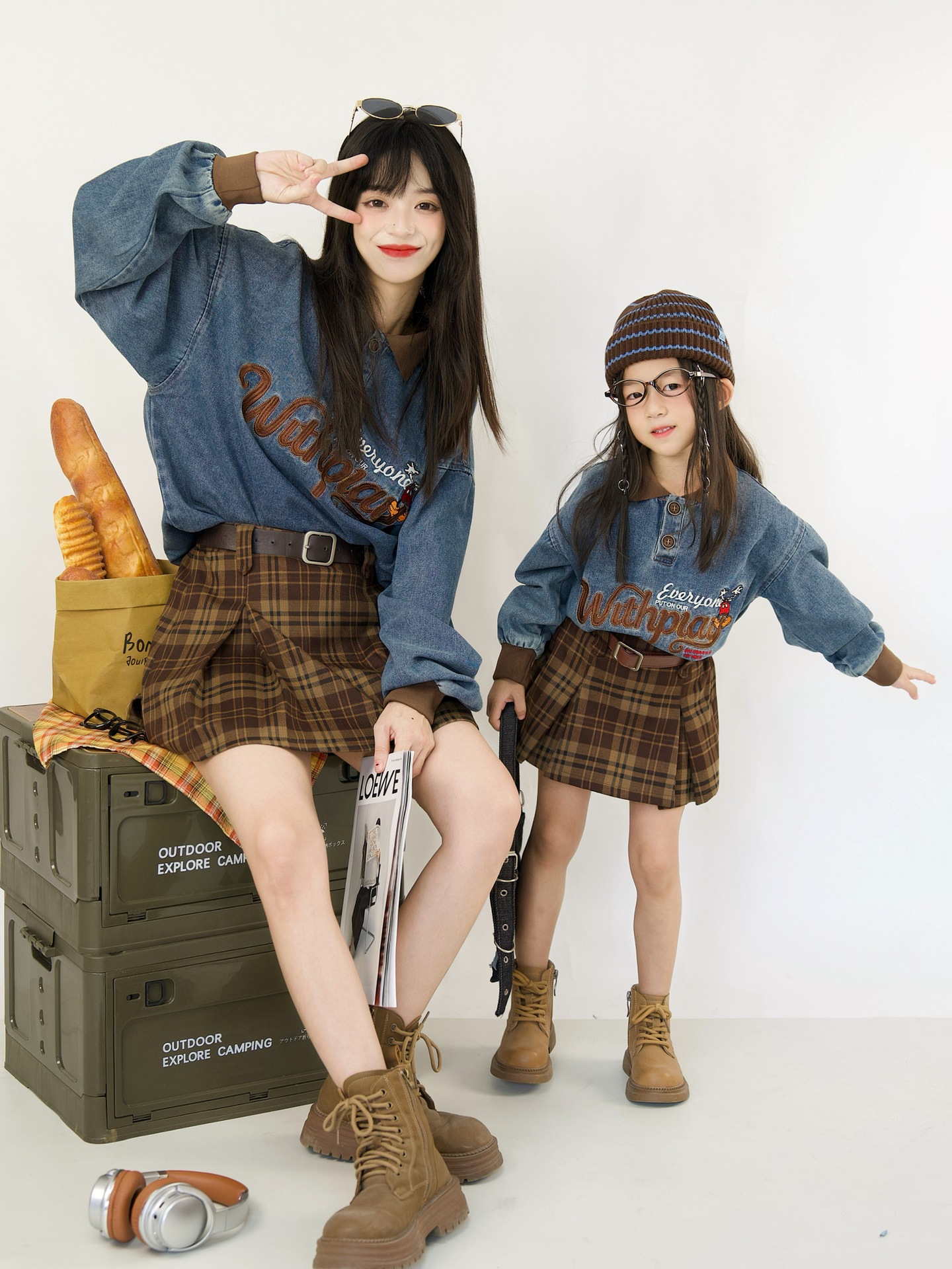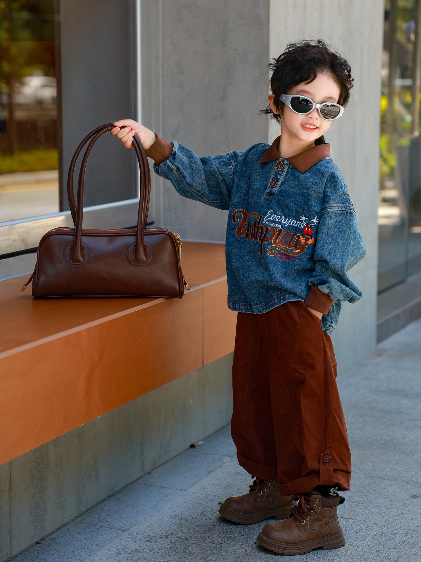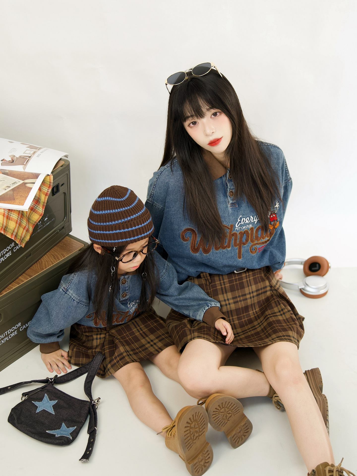又潮又酷親子裝母子美式復古襯衫秋季新款兒童翻領字母刺綉牛仔衣