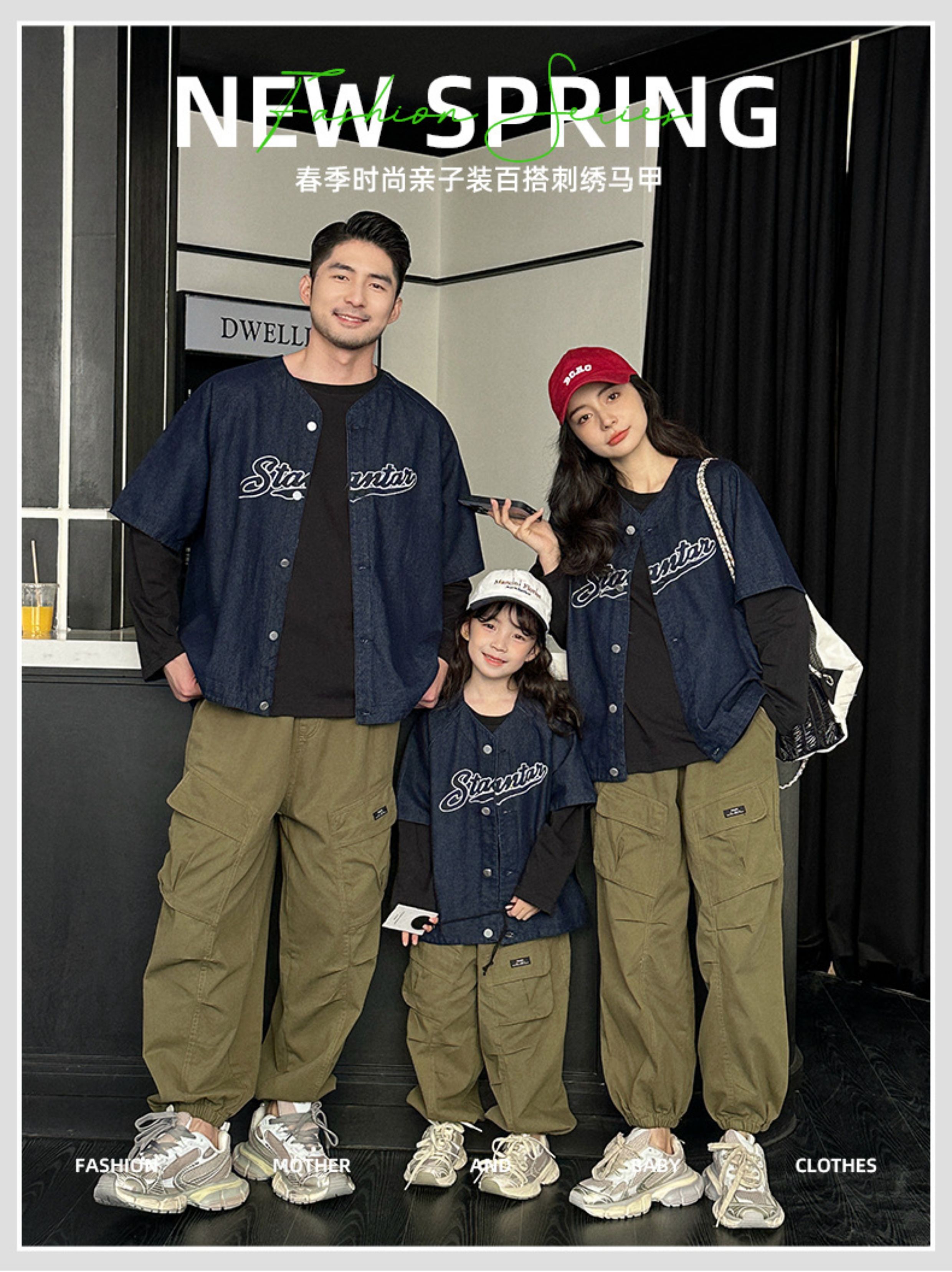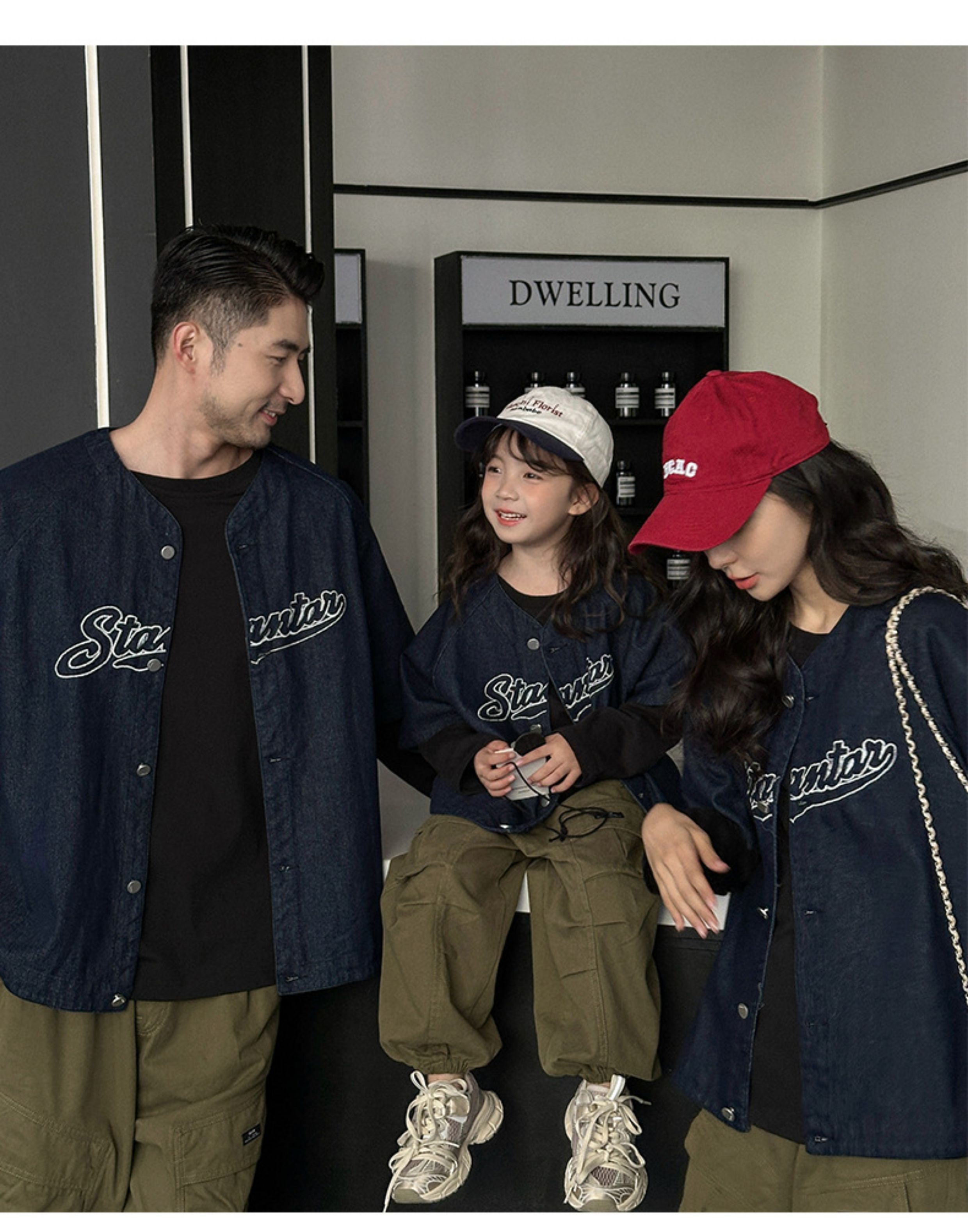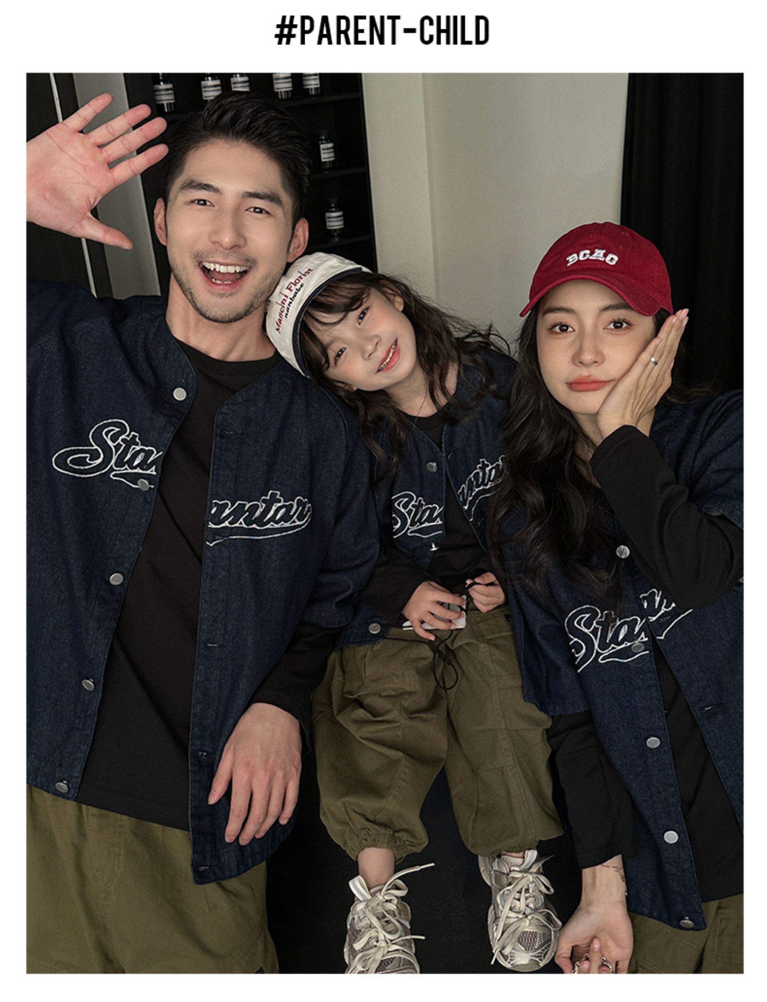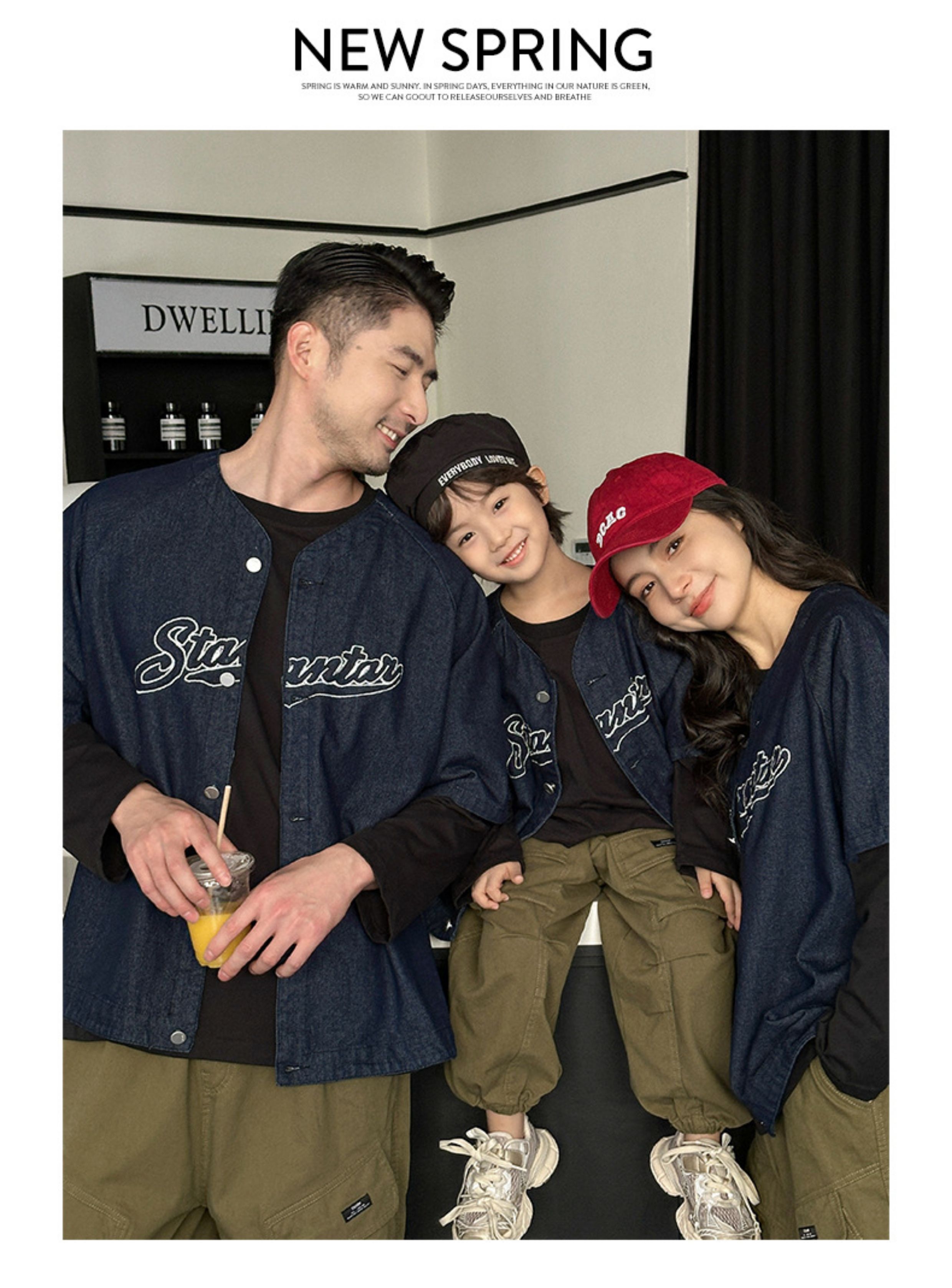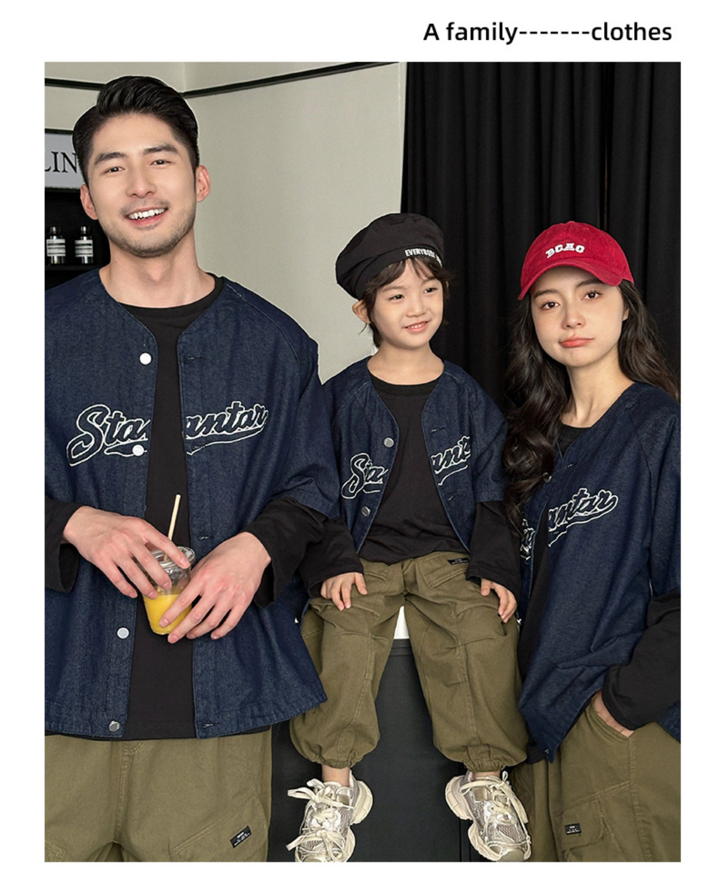 網紅親子裝秋裝一家三口長袖T恤美式復古牛仔男女童外套母子套裝