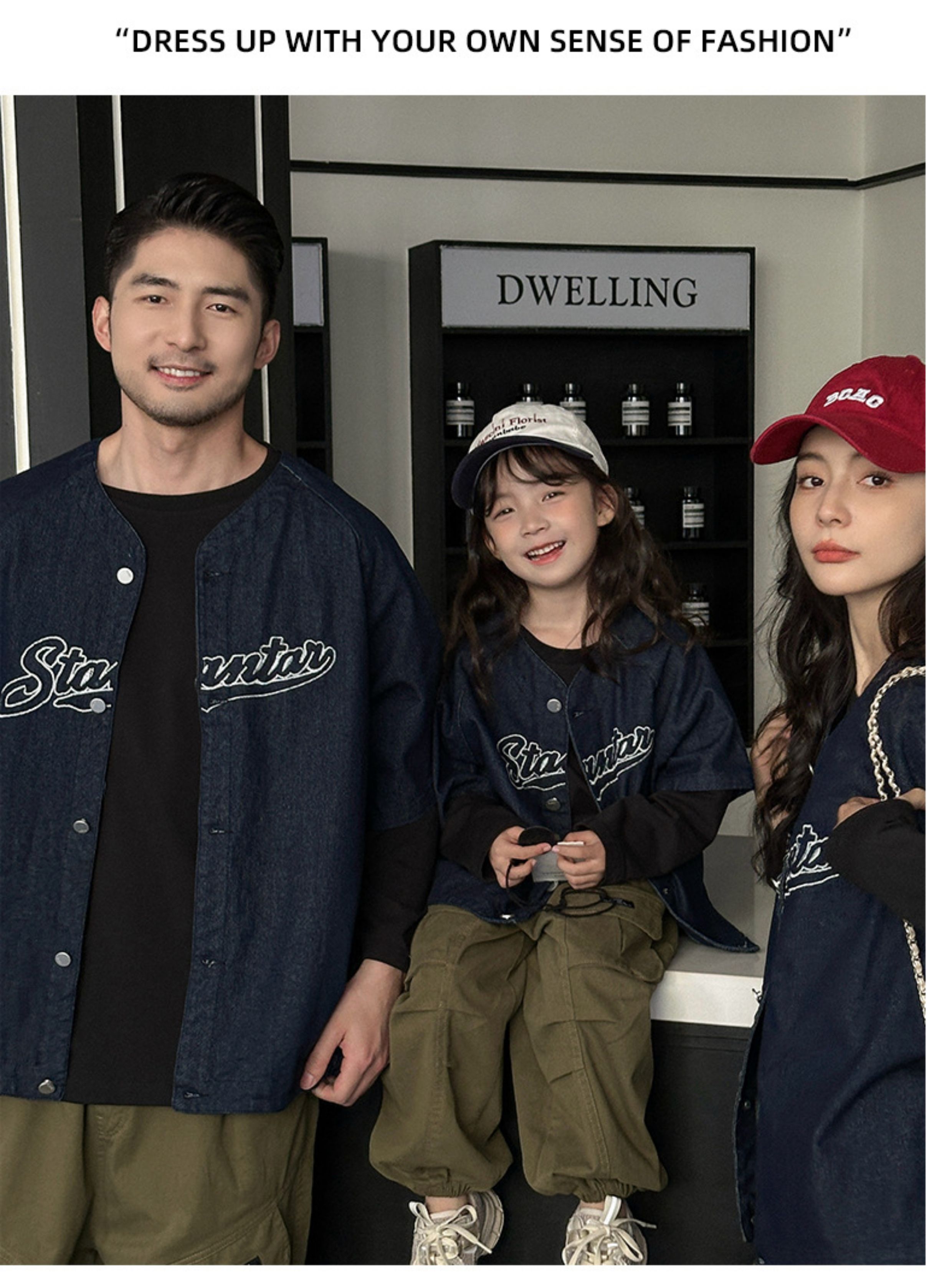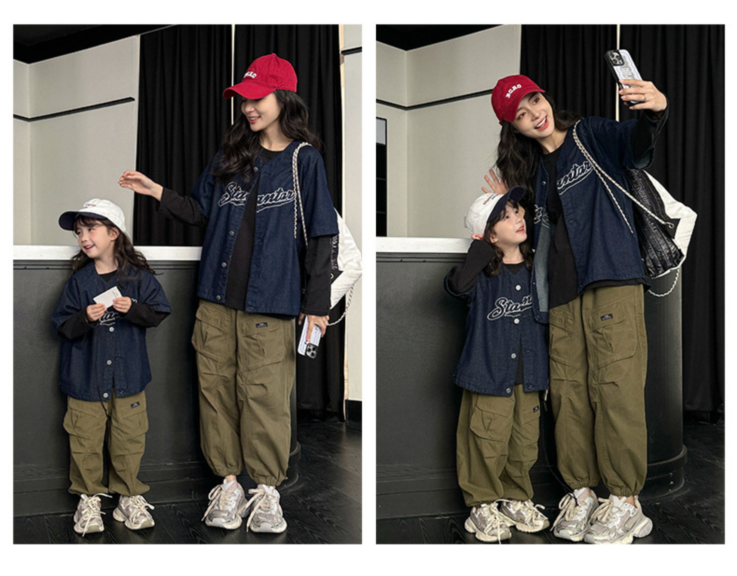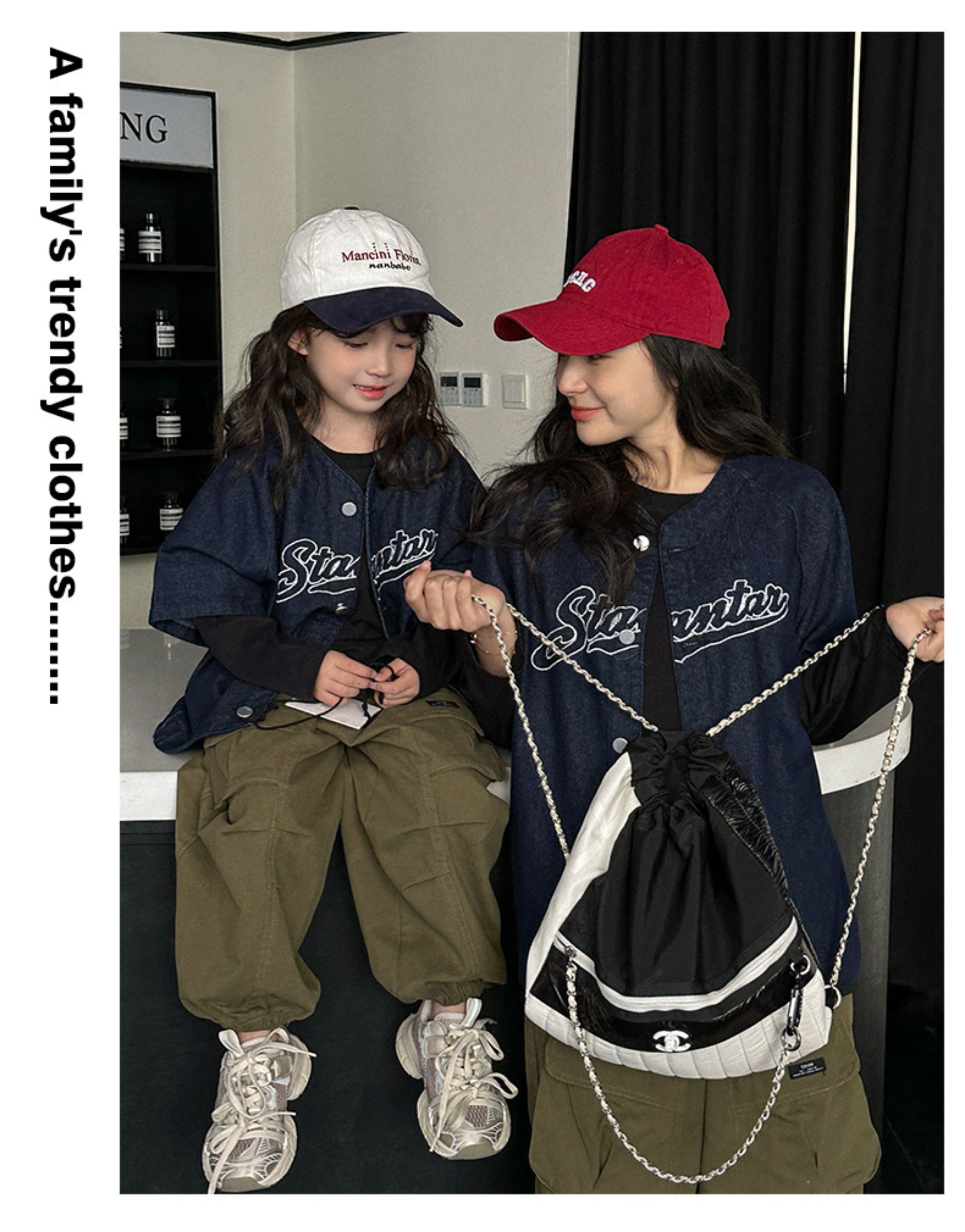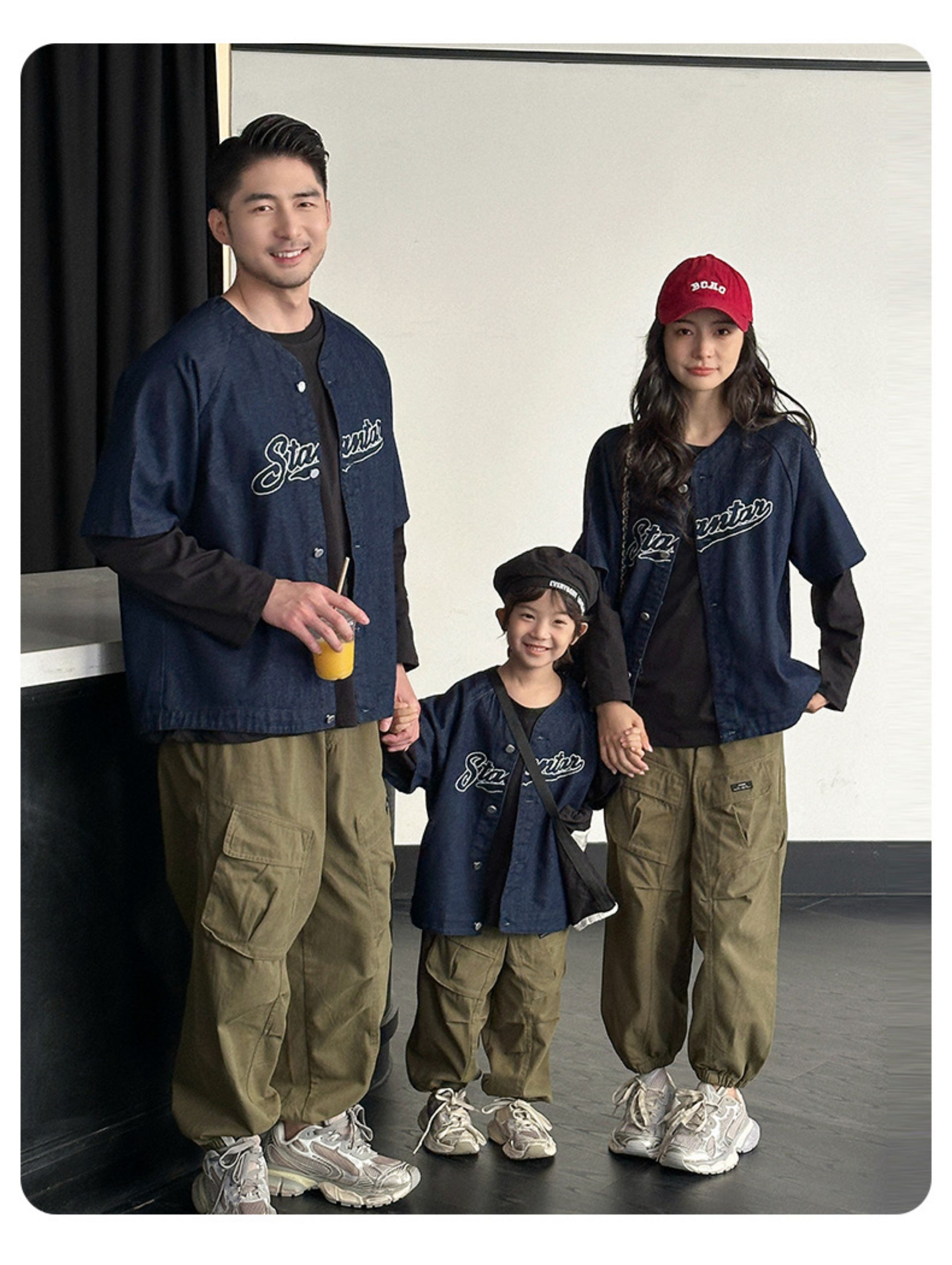 網紅親子裝秋裝一家三口長袖T恤美式復古牛仔男女童外套母子套裝