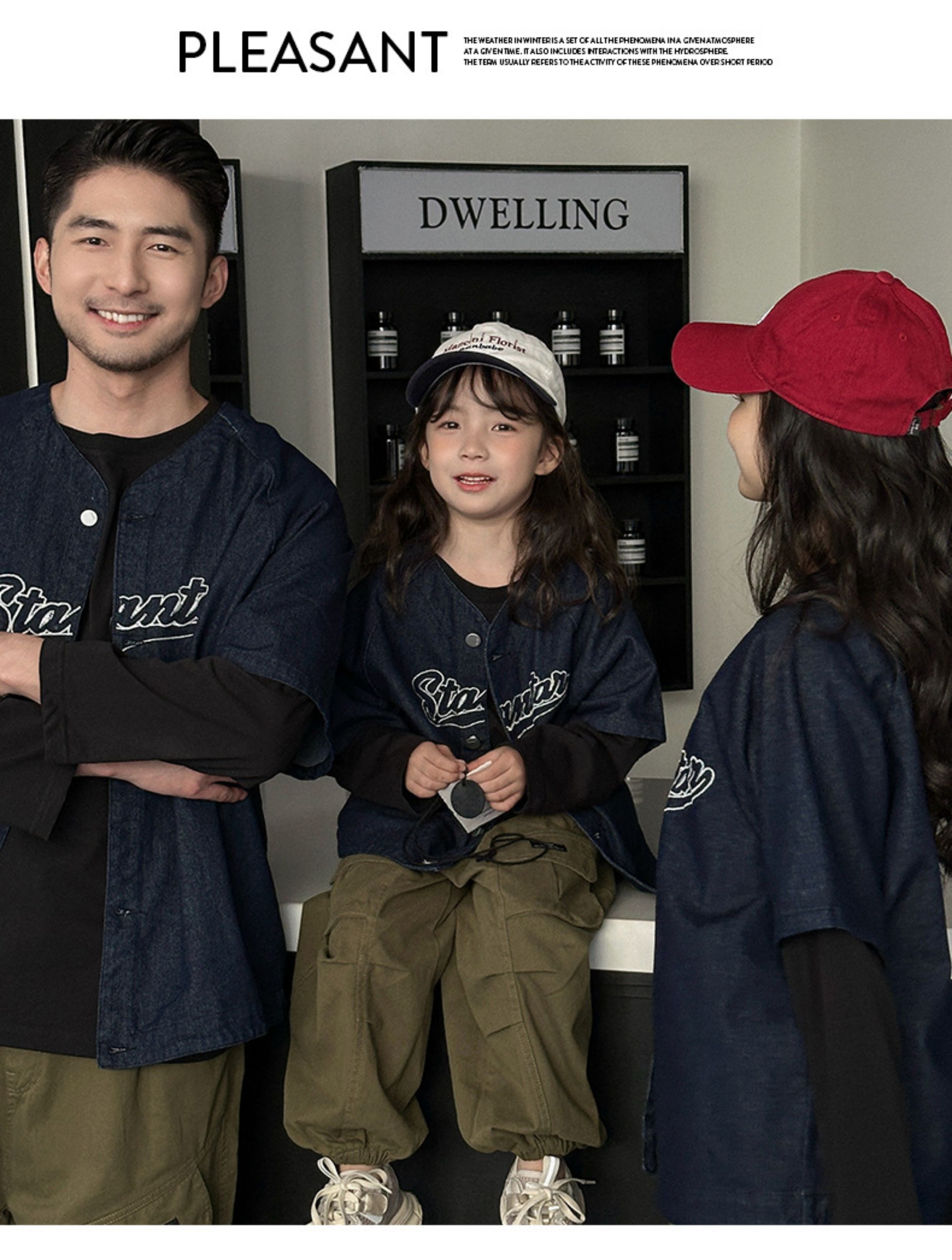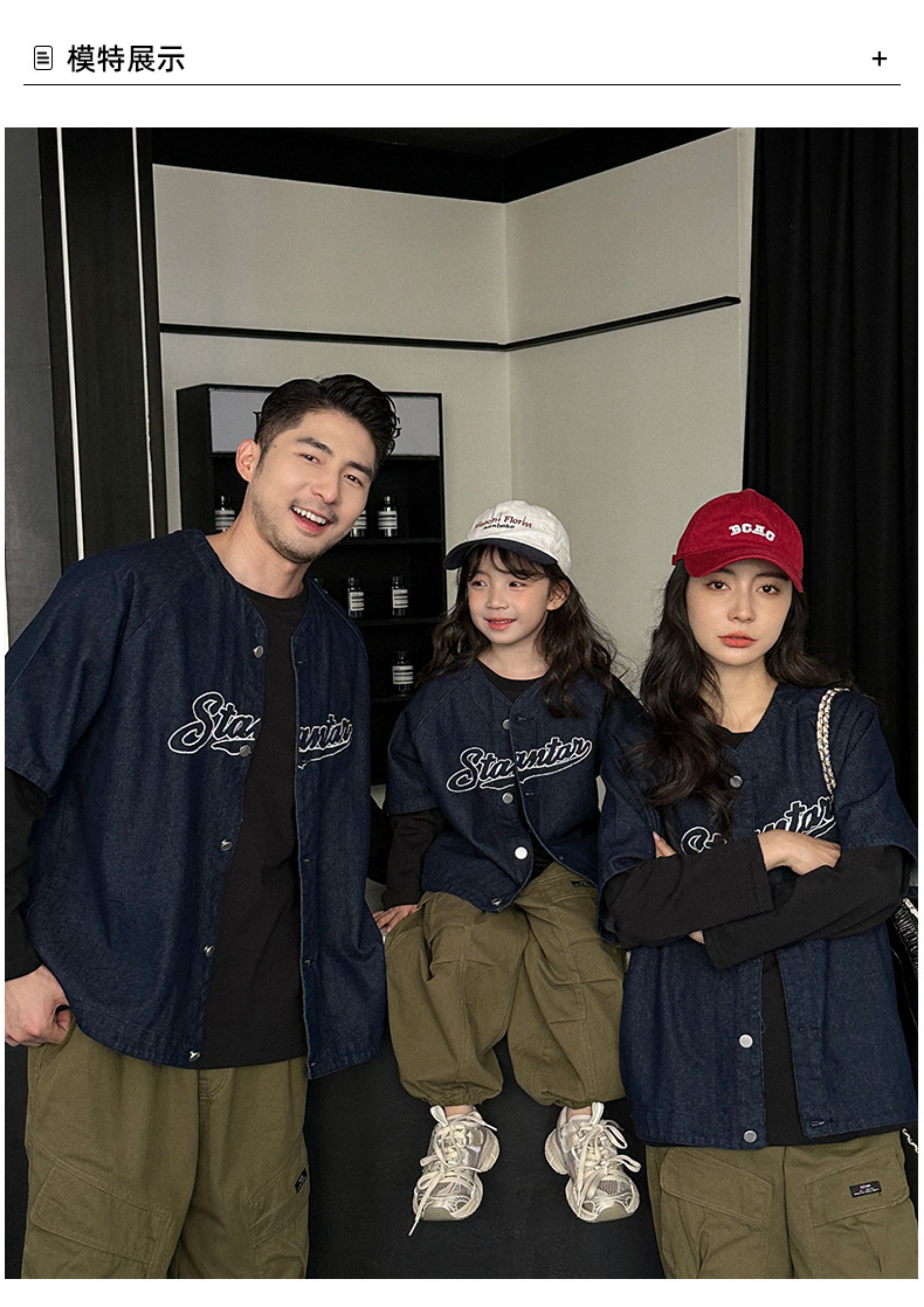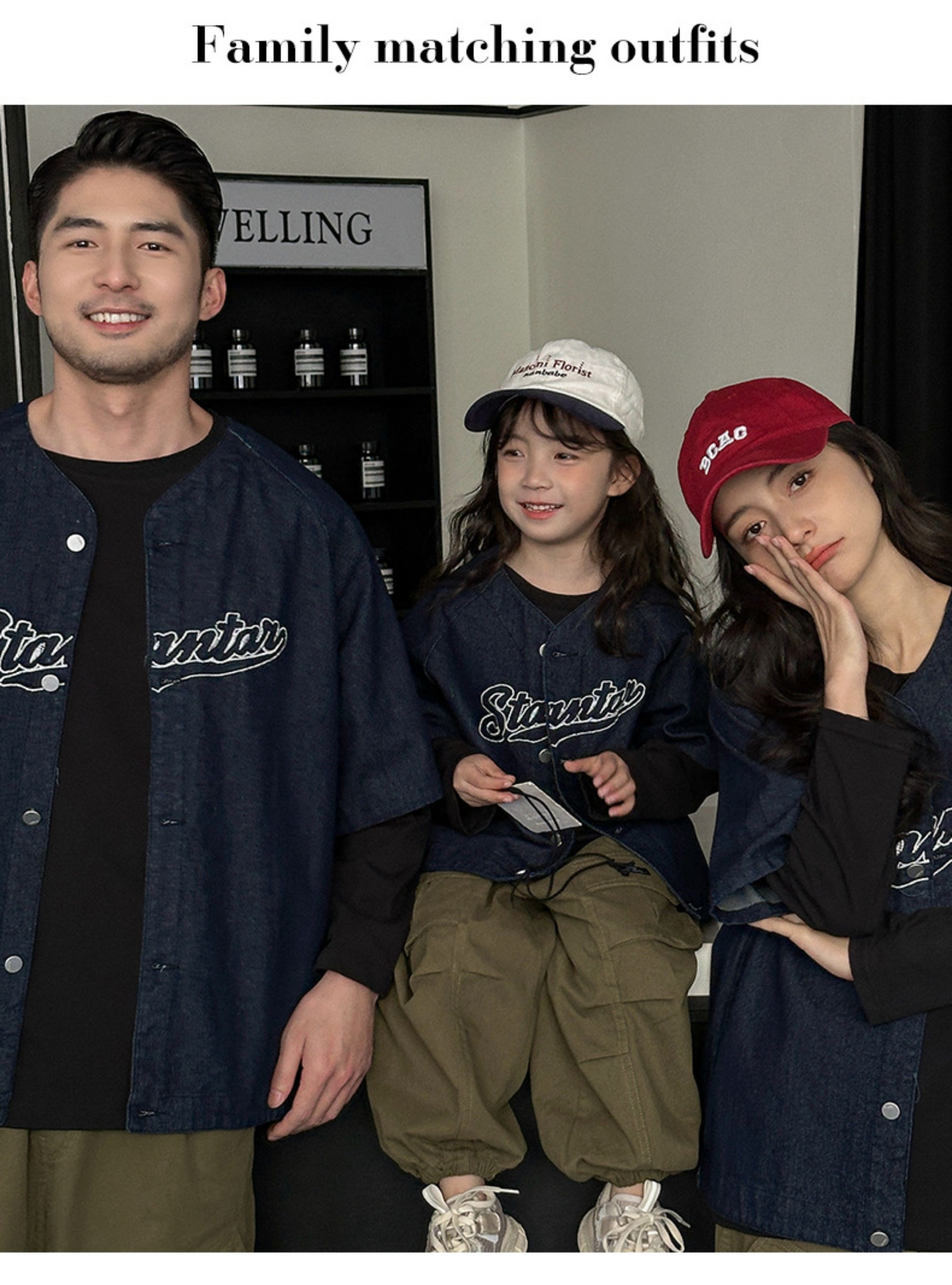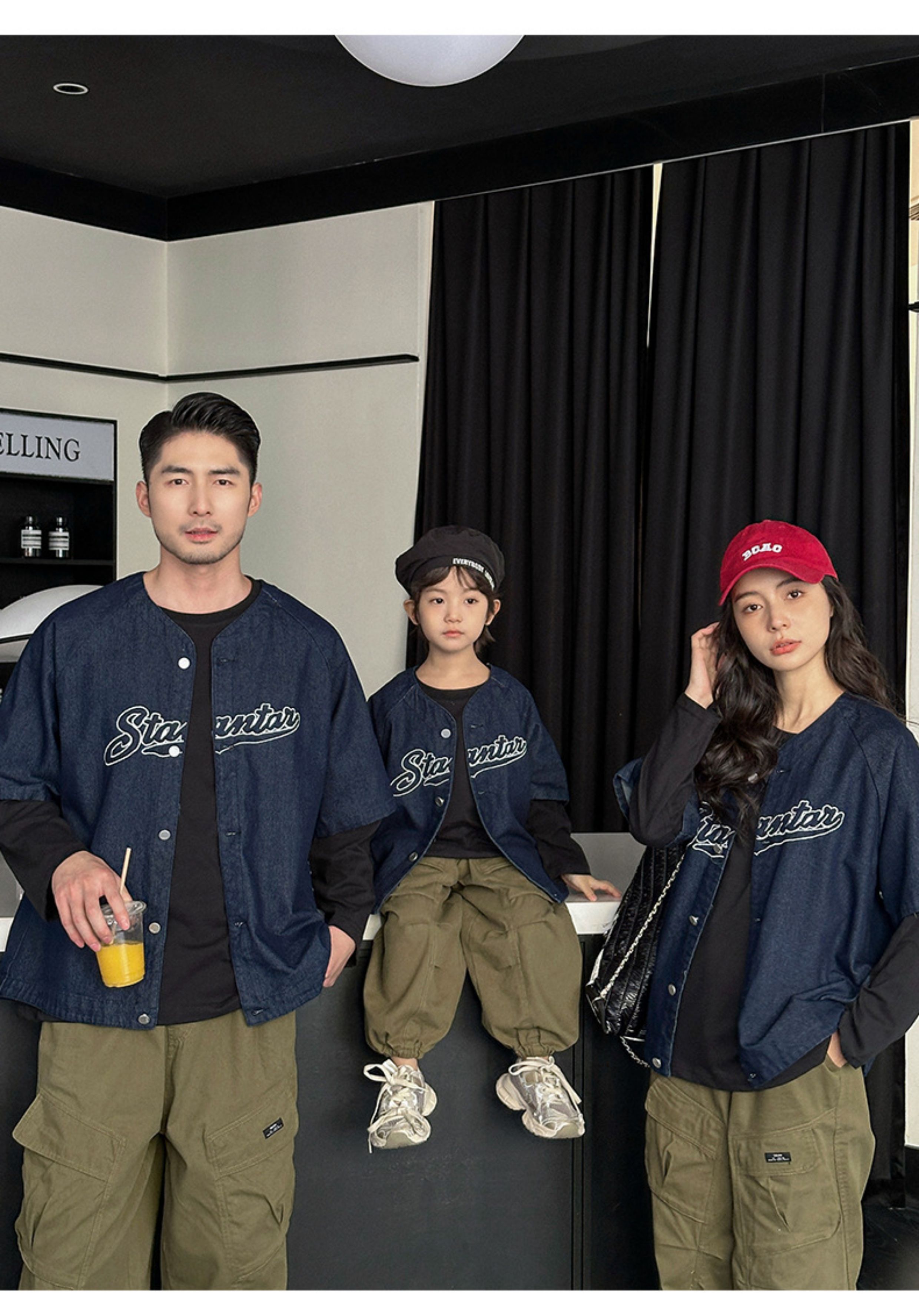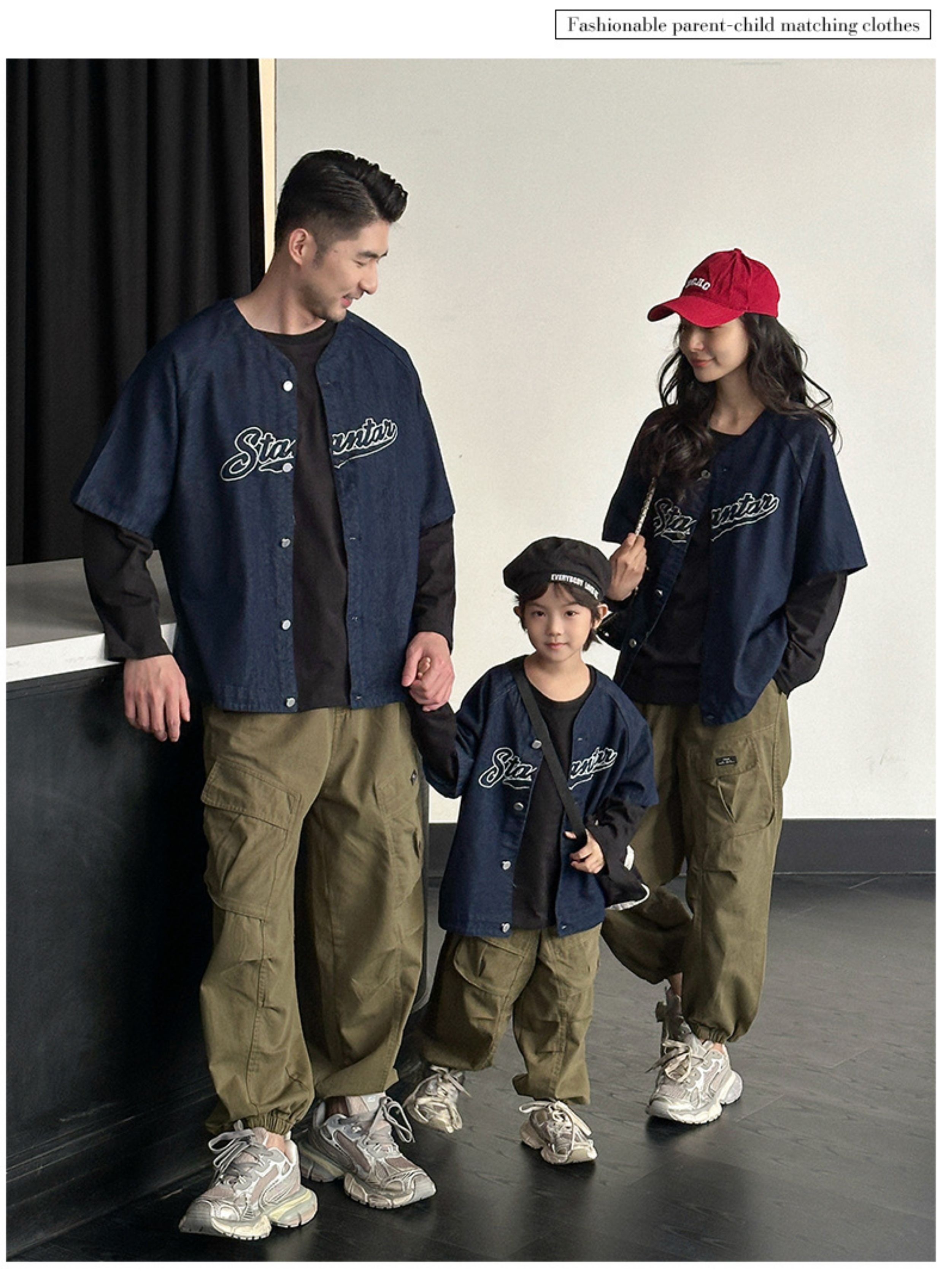 網紅親子裝秋裝一家三口長袖T恤美式復古牛仔男女童外套母子套裝