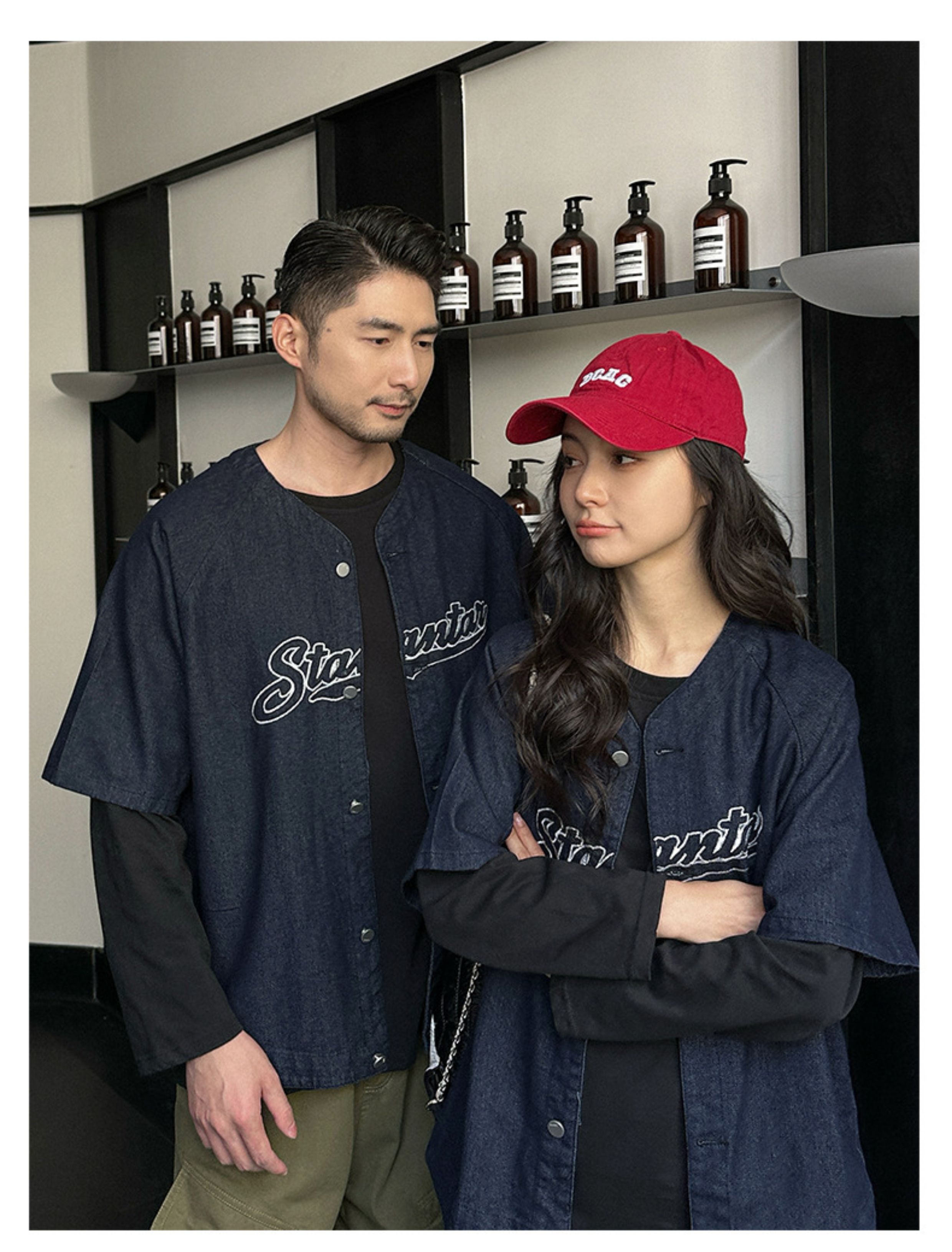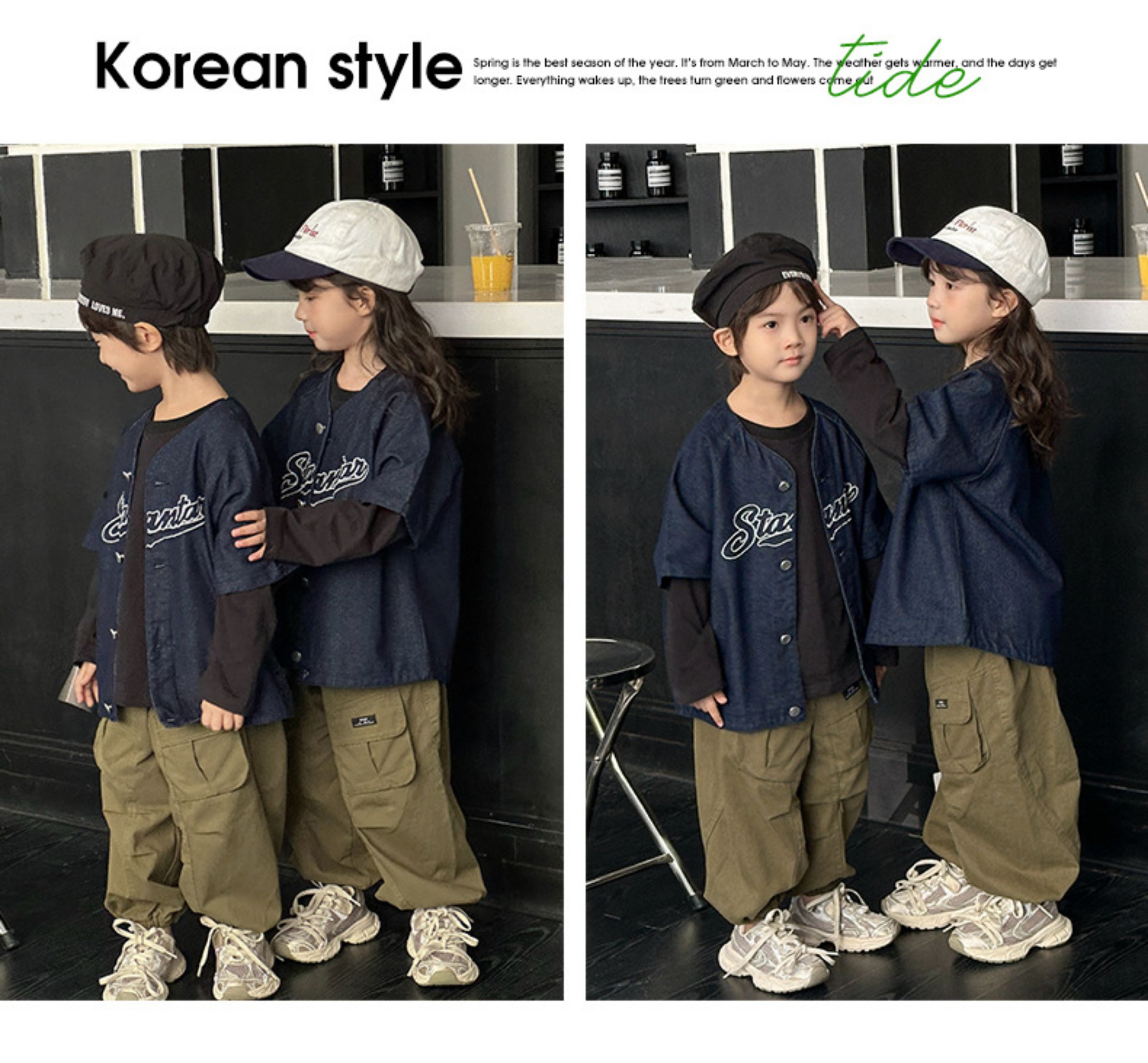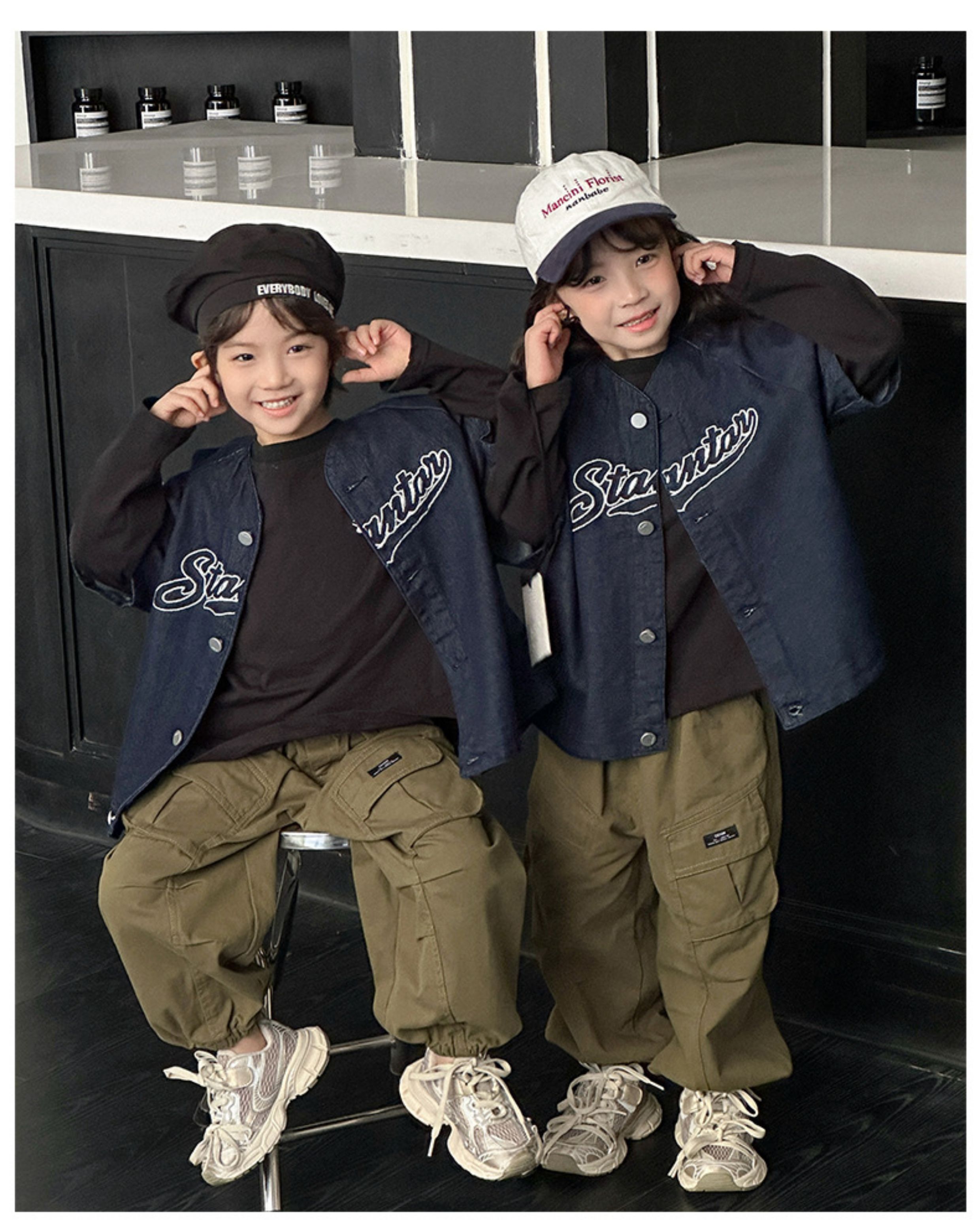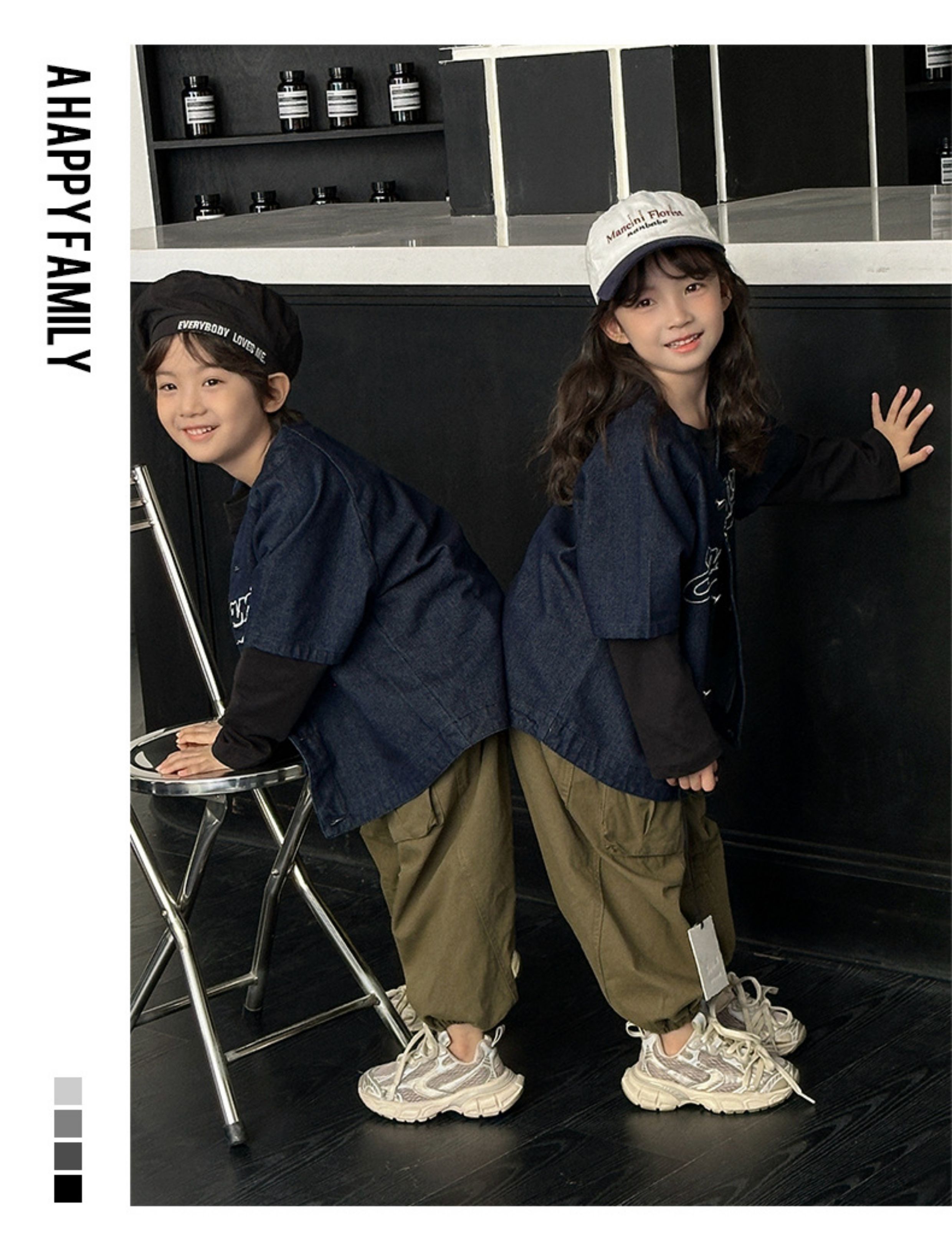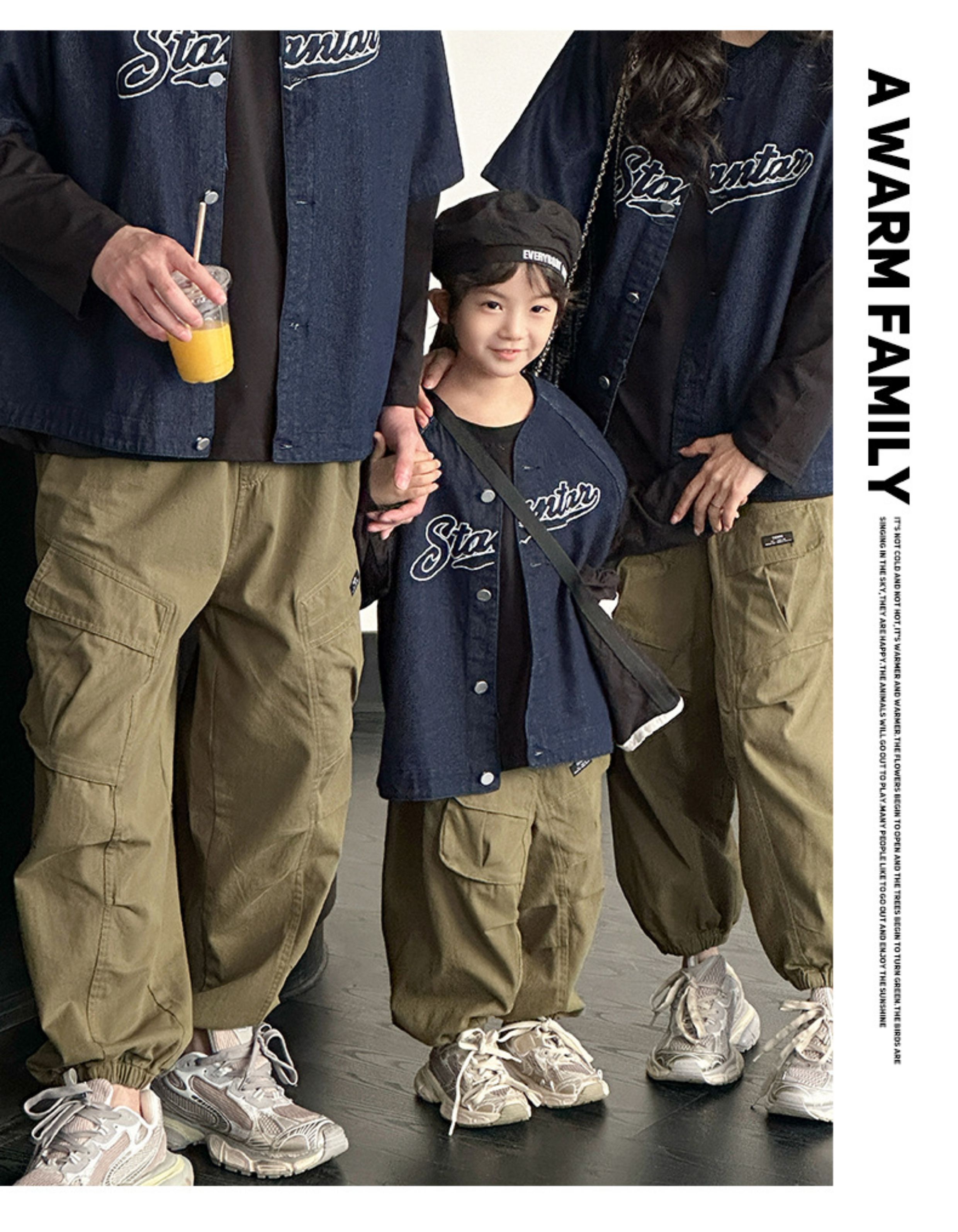 網紅親子裝秋裝一家三口長袖T恤美式復古牛仔男女童外套母子套裝