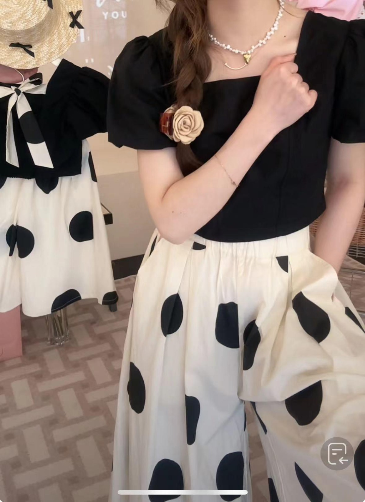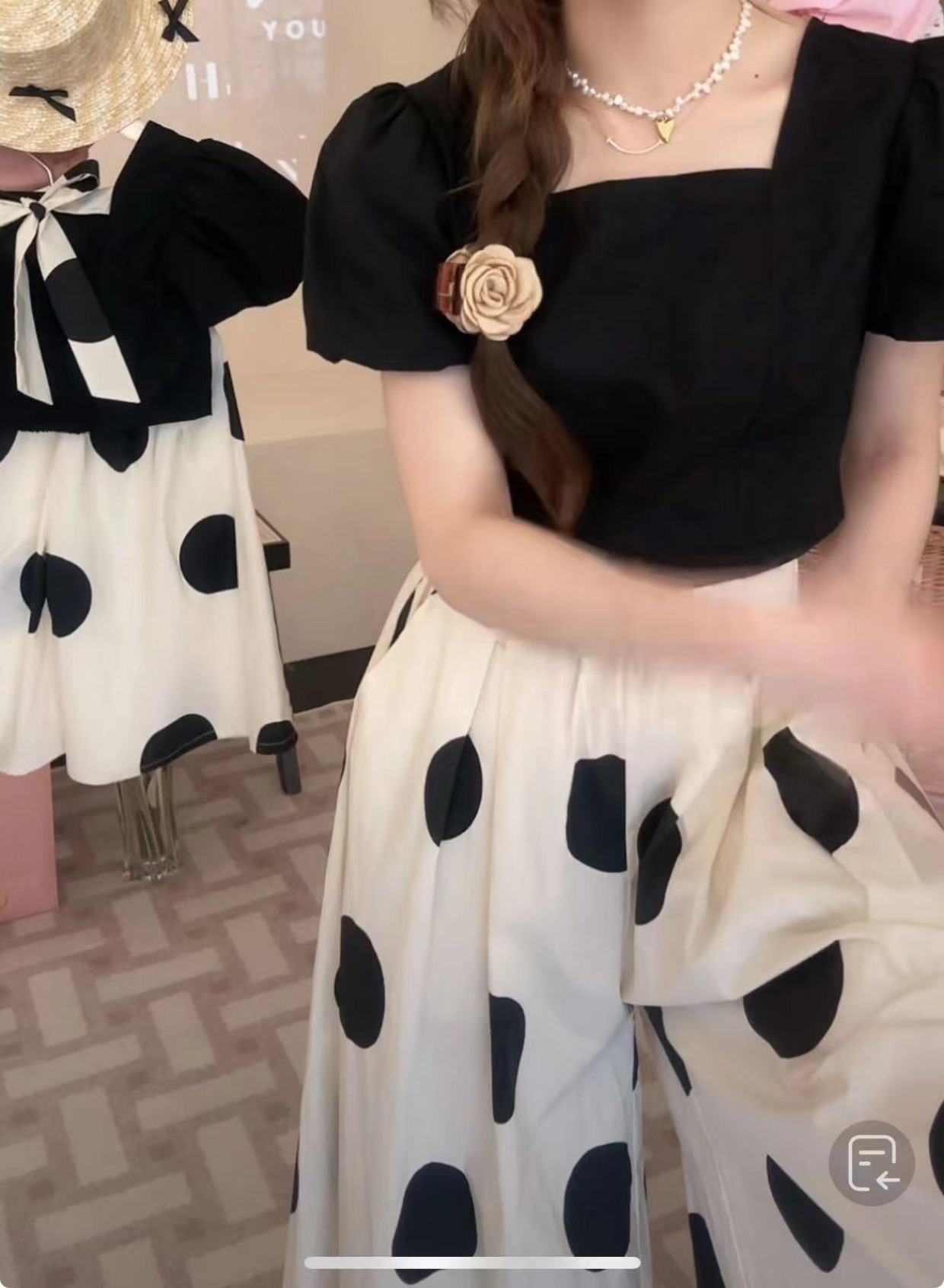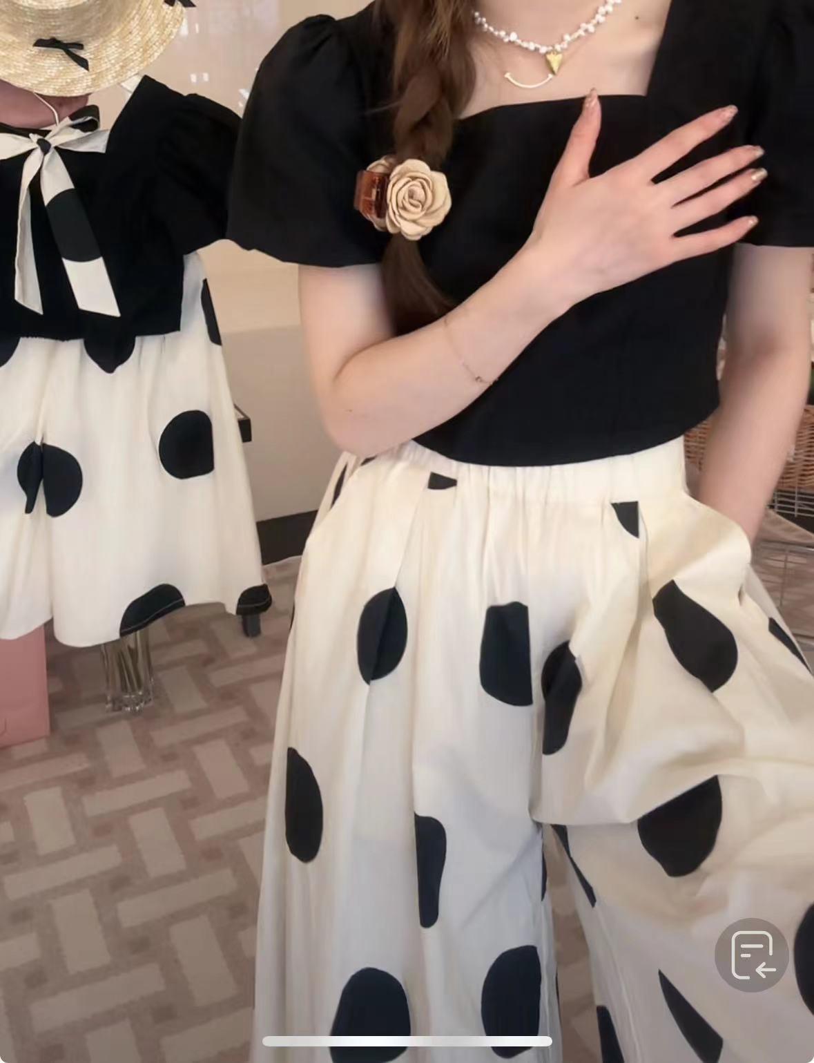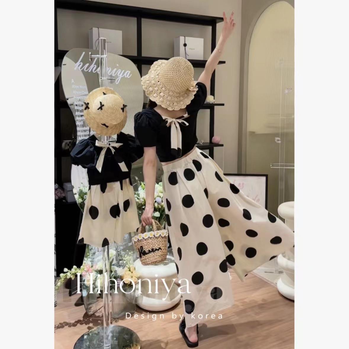 高級親子裝夏裝母女網紅2024夏季泡泡袖短袖炸街白色波點濶腿褲潮