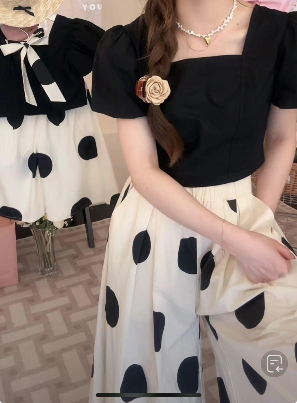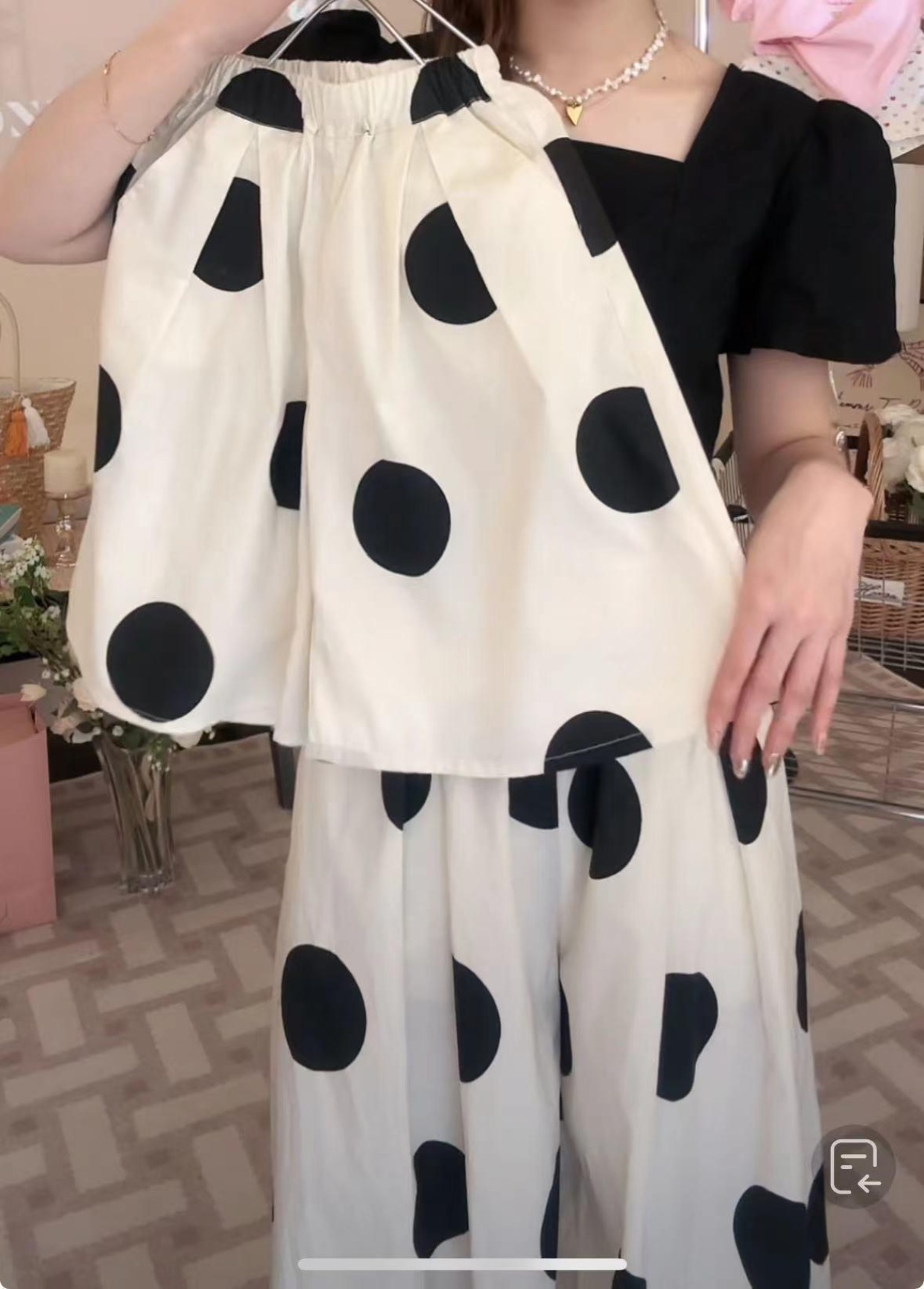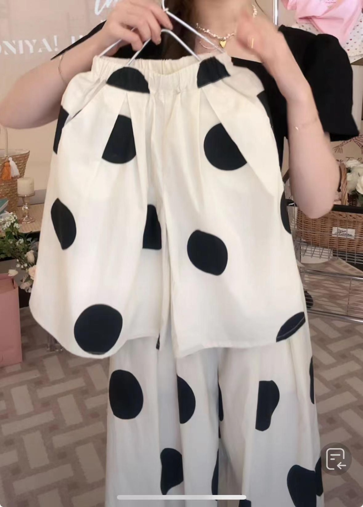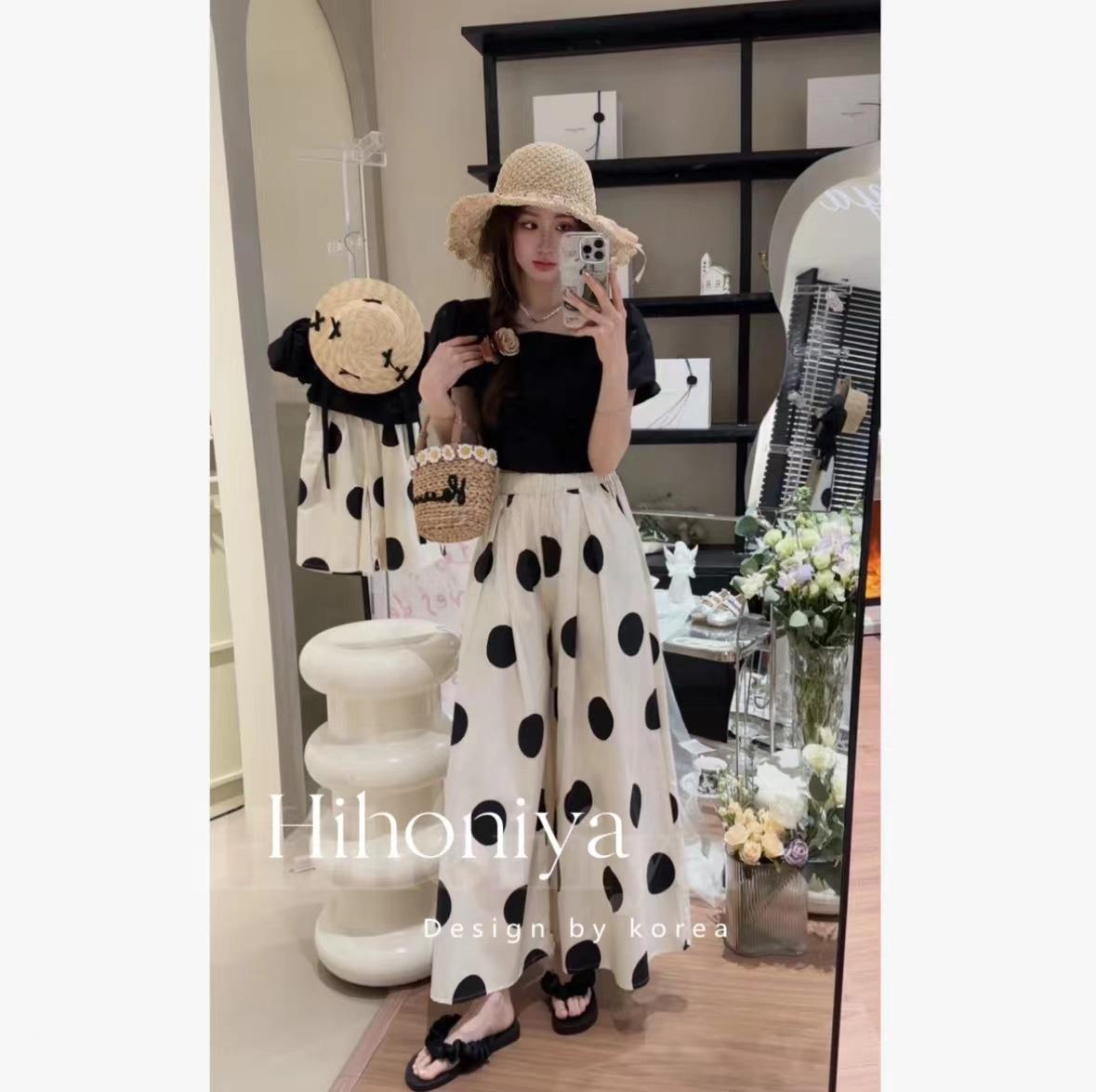 高級親子裝夏裝母女網紅2024夏季泡泡袖短袖炸街白色波點濶腿褲潮