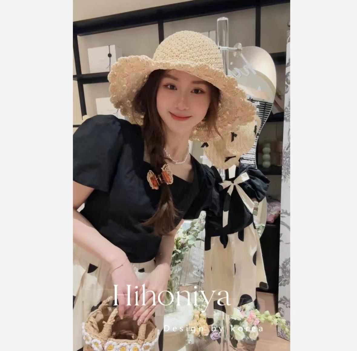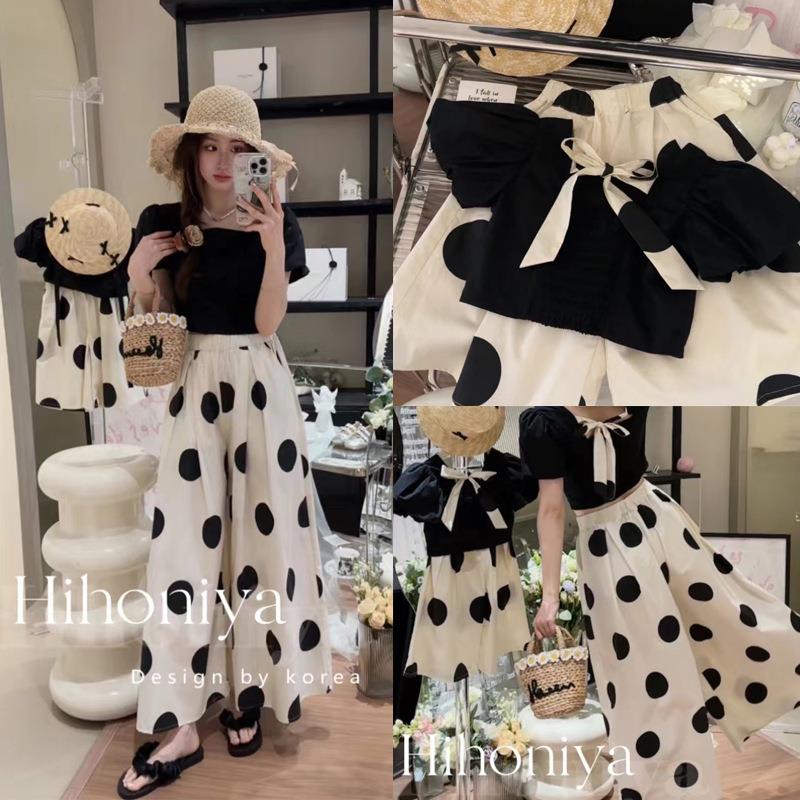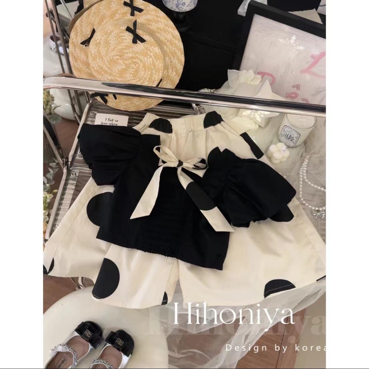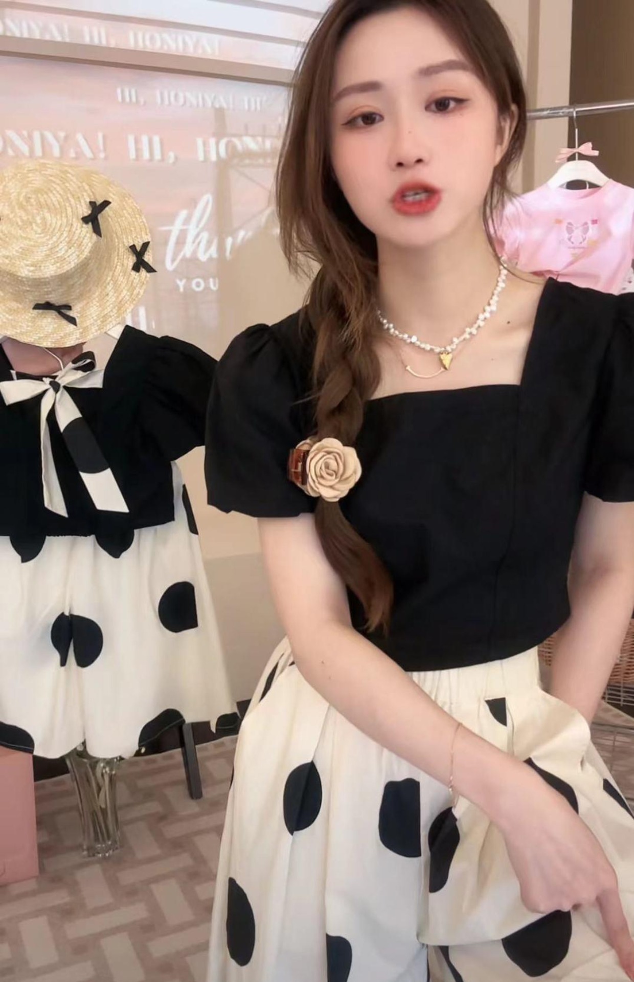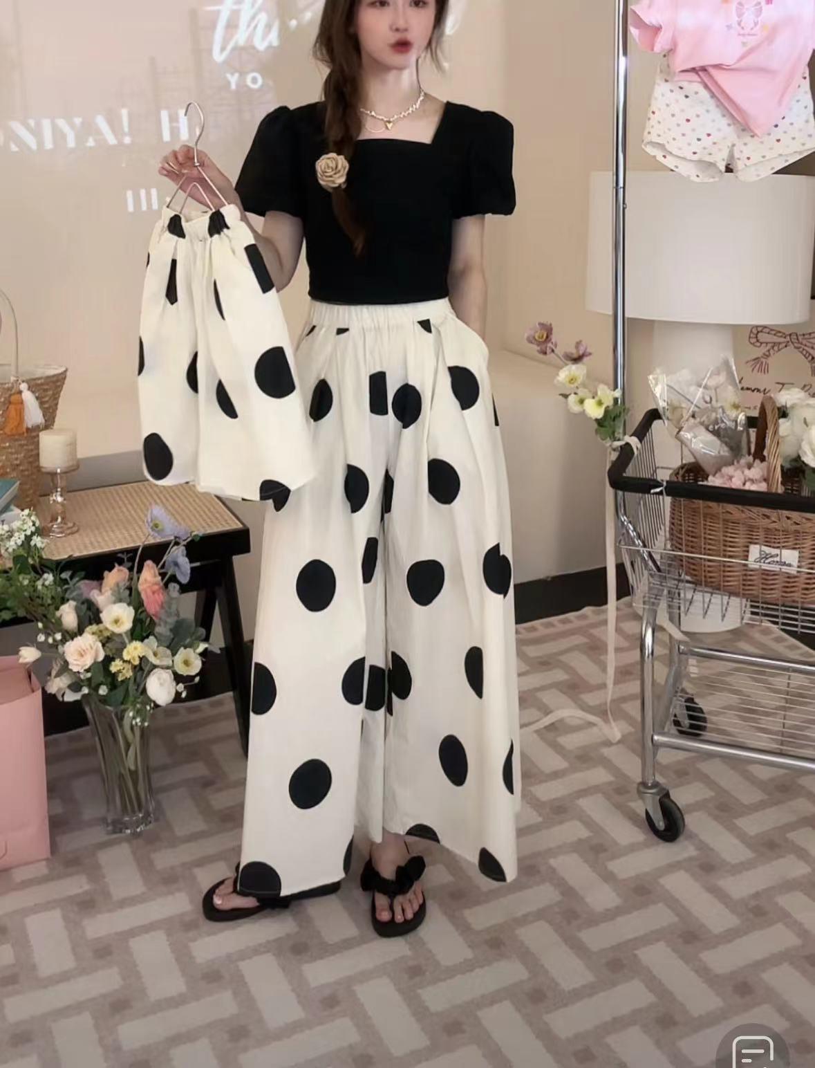 高級親子裝夏裝母女網紅2024夏季泡泡袖短袖炸街白色波點濶腿褲潮