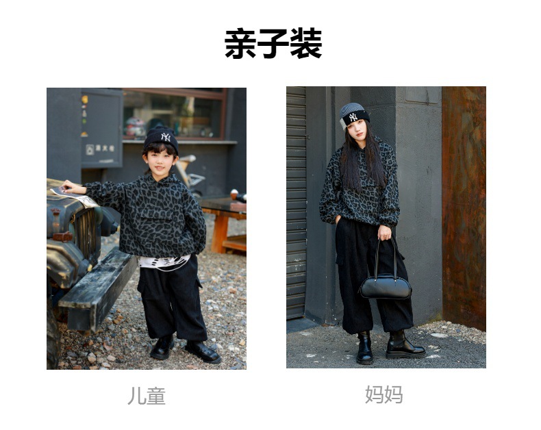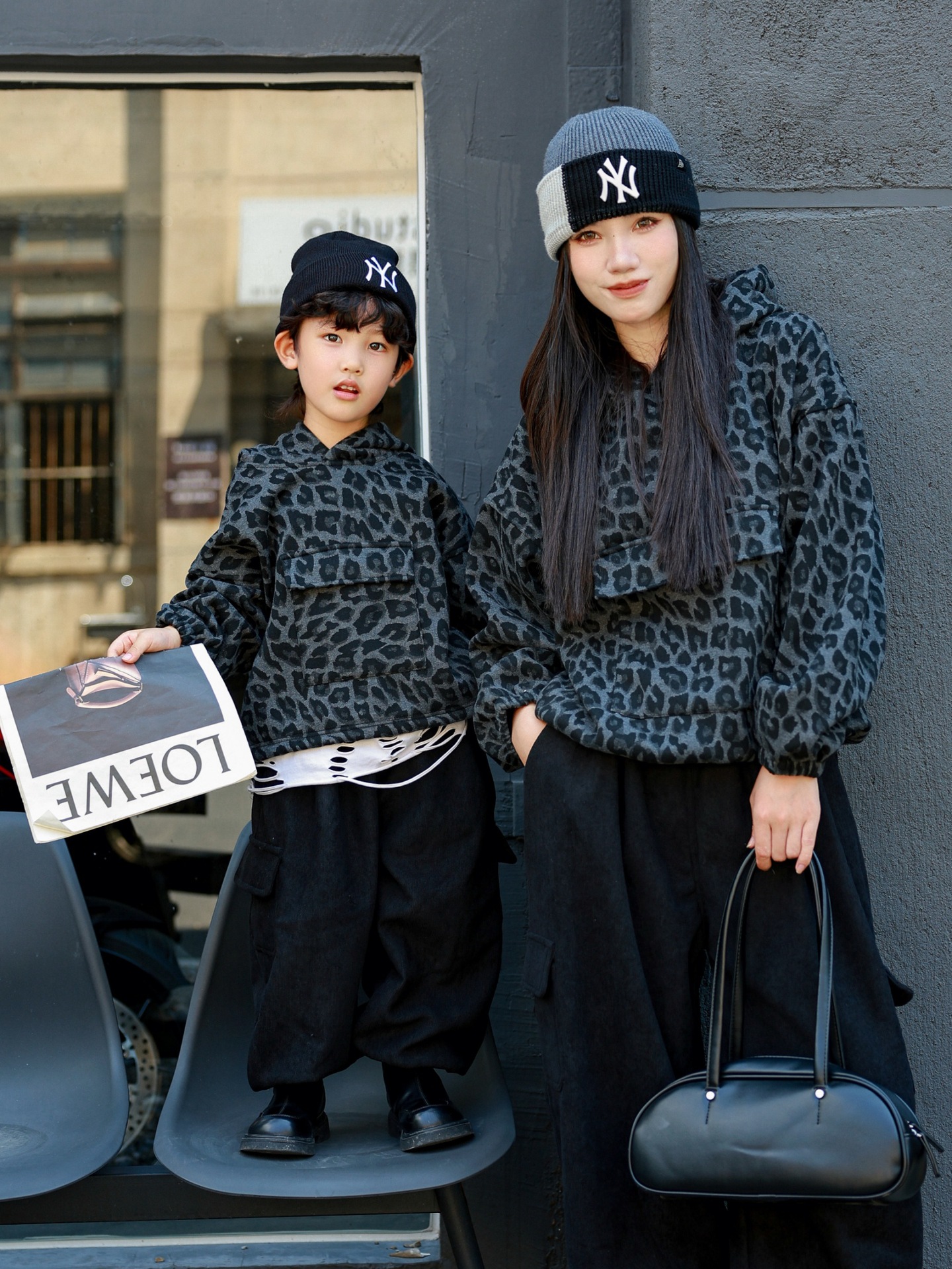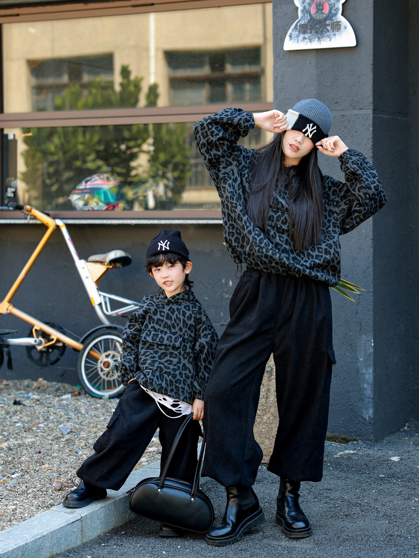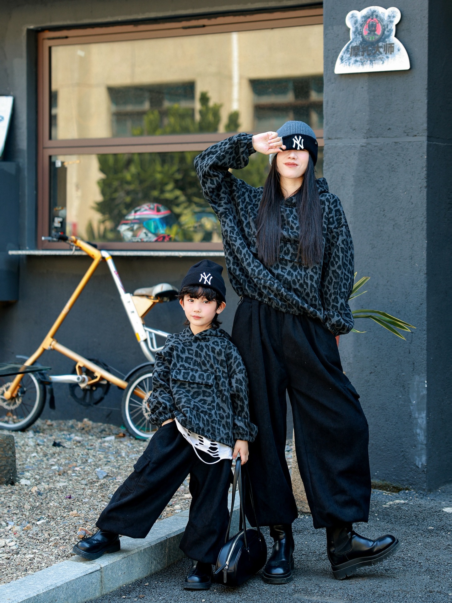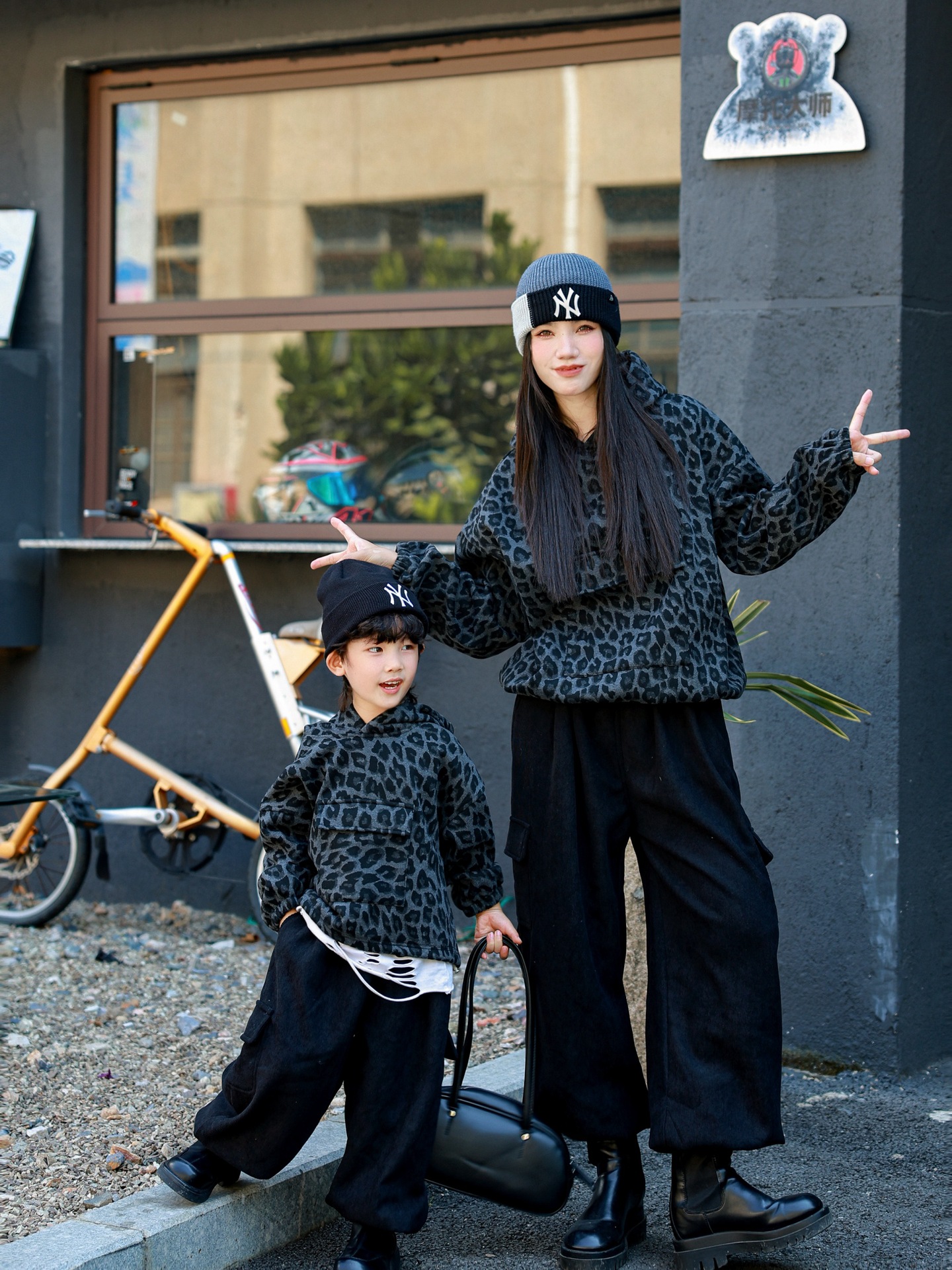又酷又颯親子裝母子港風復古豹紋衛衣冬季兒童洋氣時髦連帽外套潮