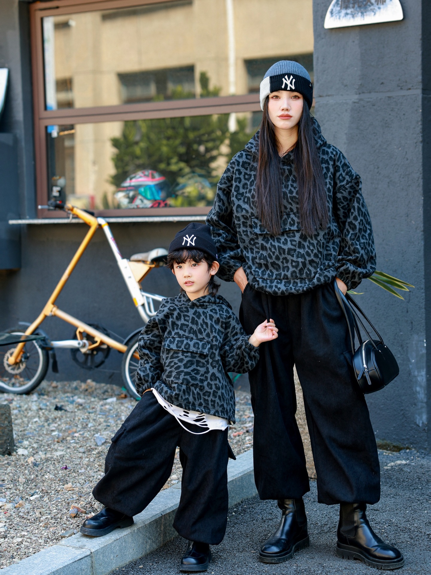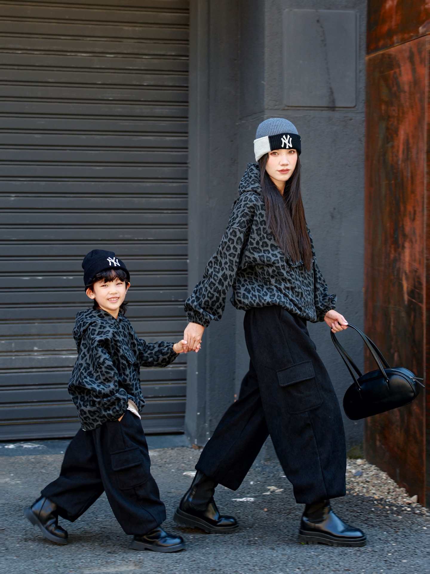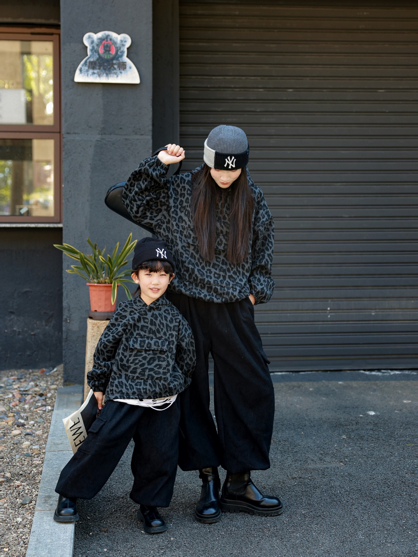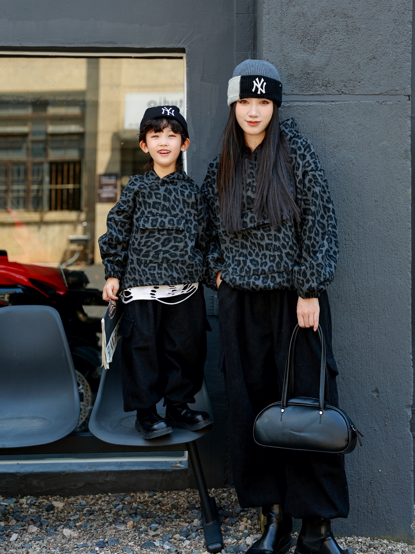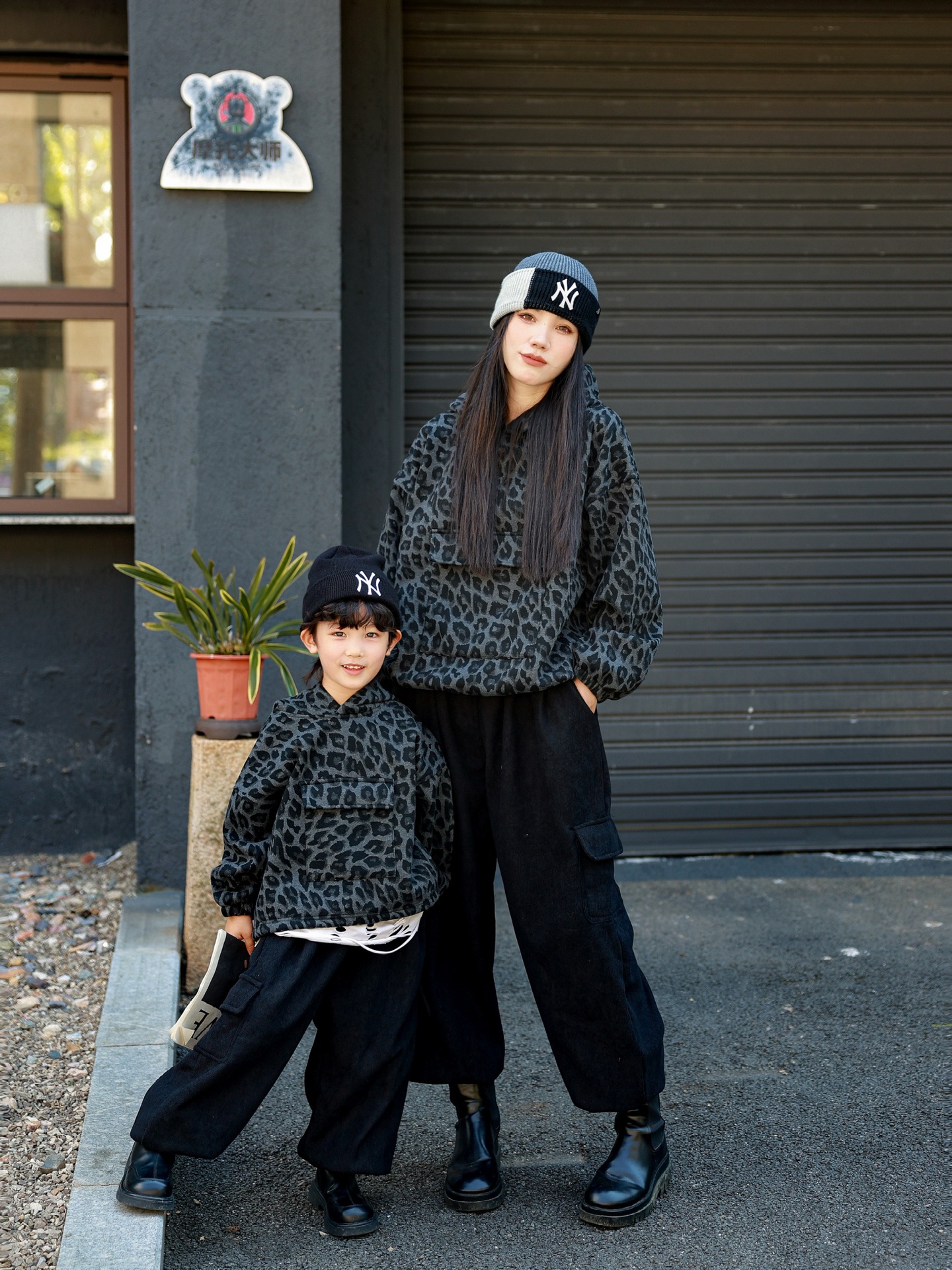 又酷又颯親子裝母子港風復古豹紋衛衣冬季兒童洋氣時髦連帽外套潮