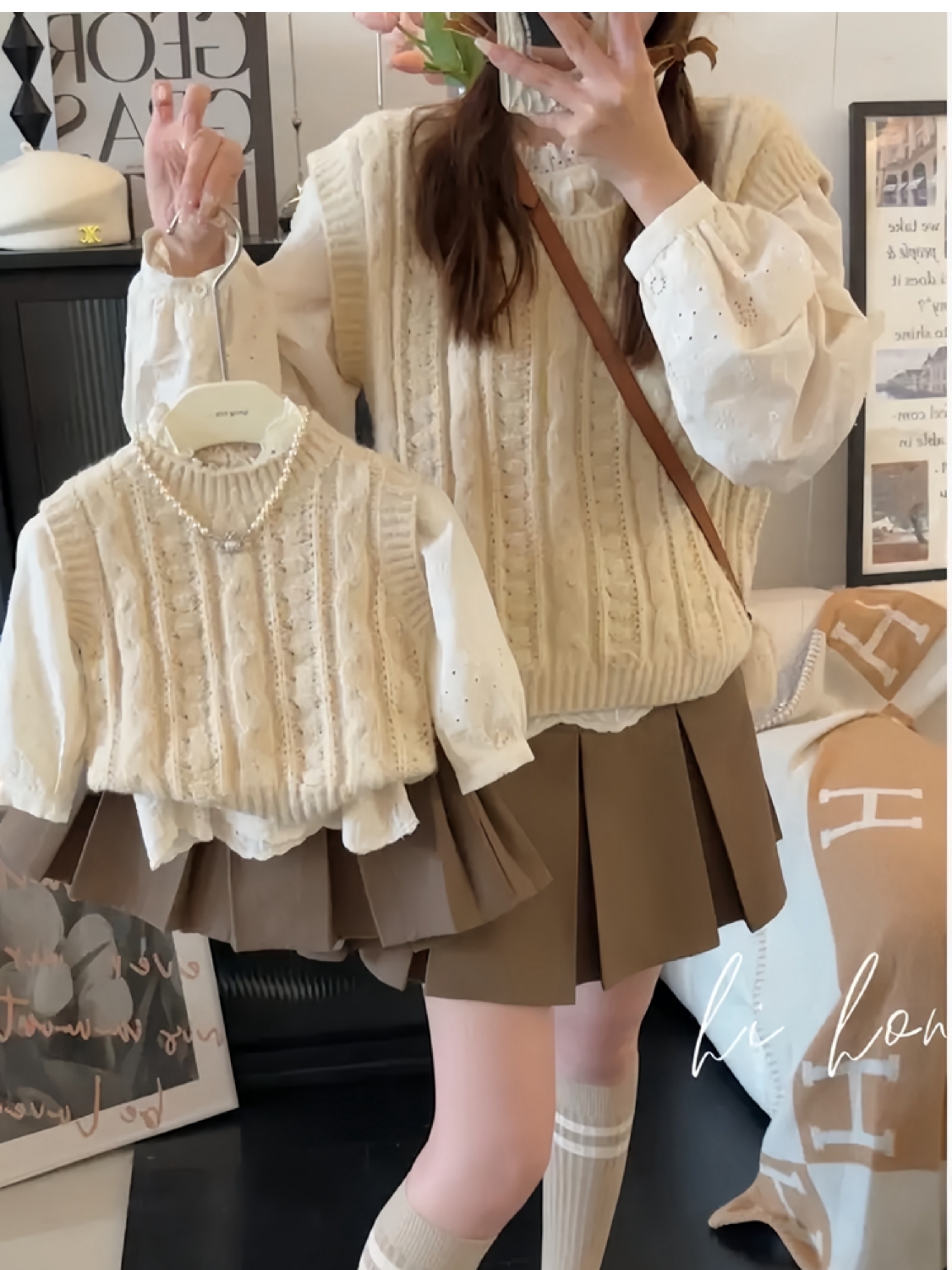 炸街親子裝2024春季新款一家三口毛衣馬甲洋氣韓版母女母子裝針織