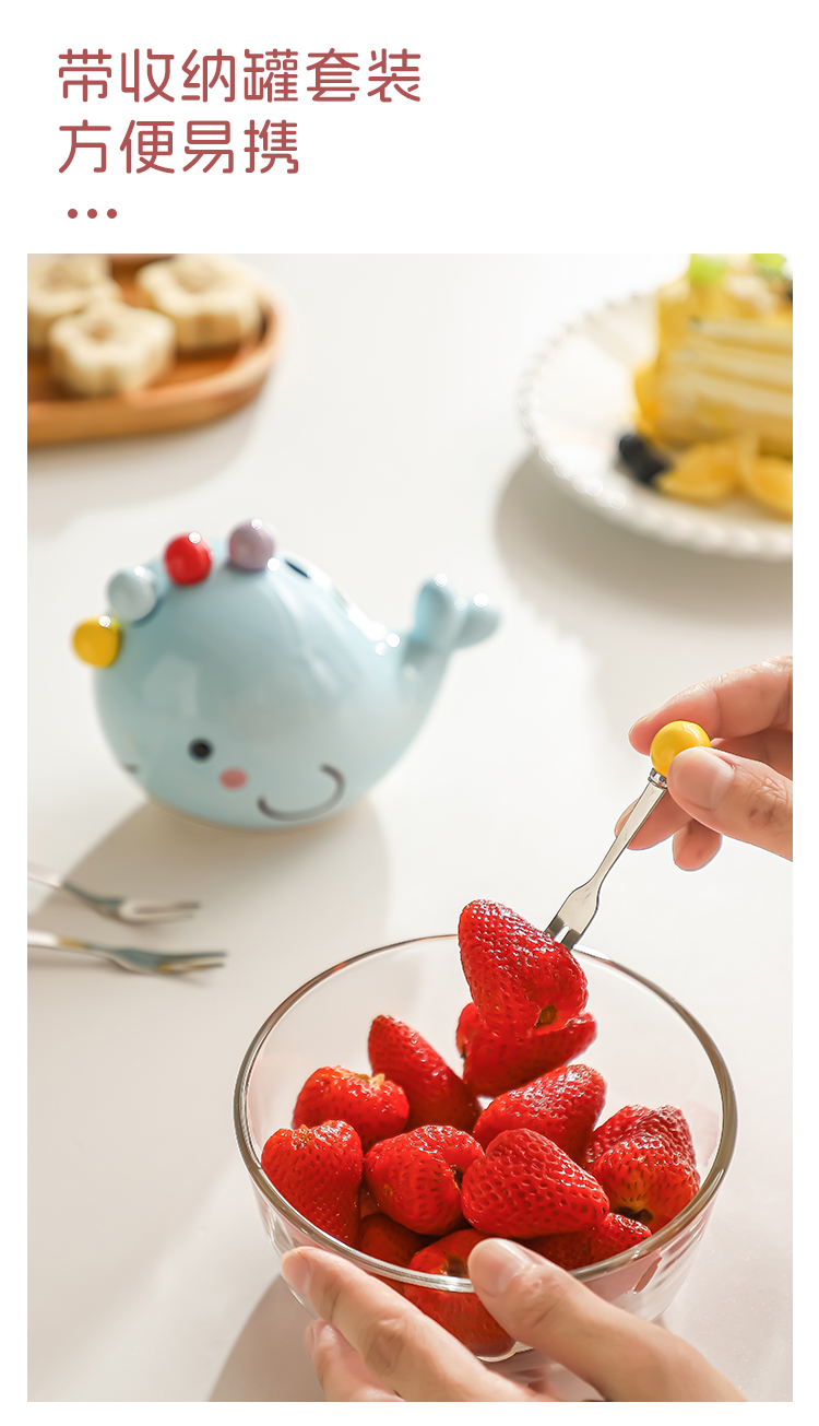 ✞高顔值水果叉家用不鏽鋼兒童甜品可愛小叉子收納罐套裝