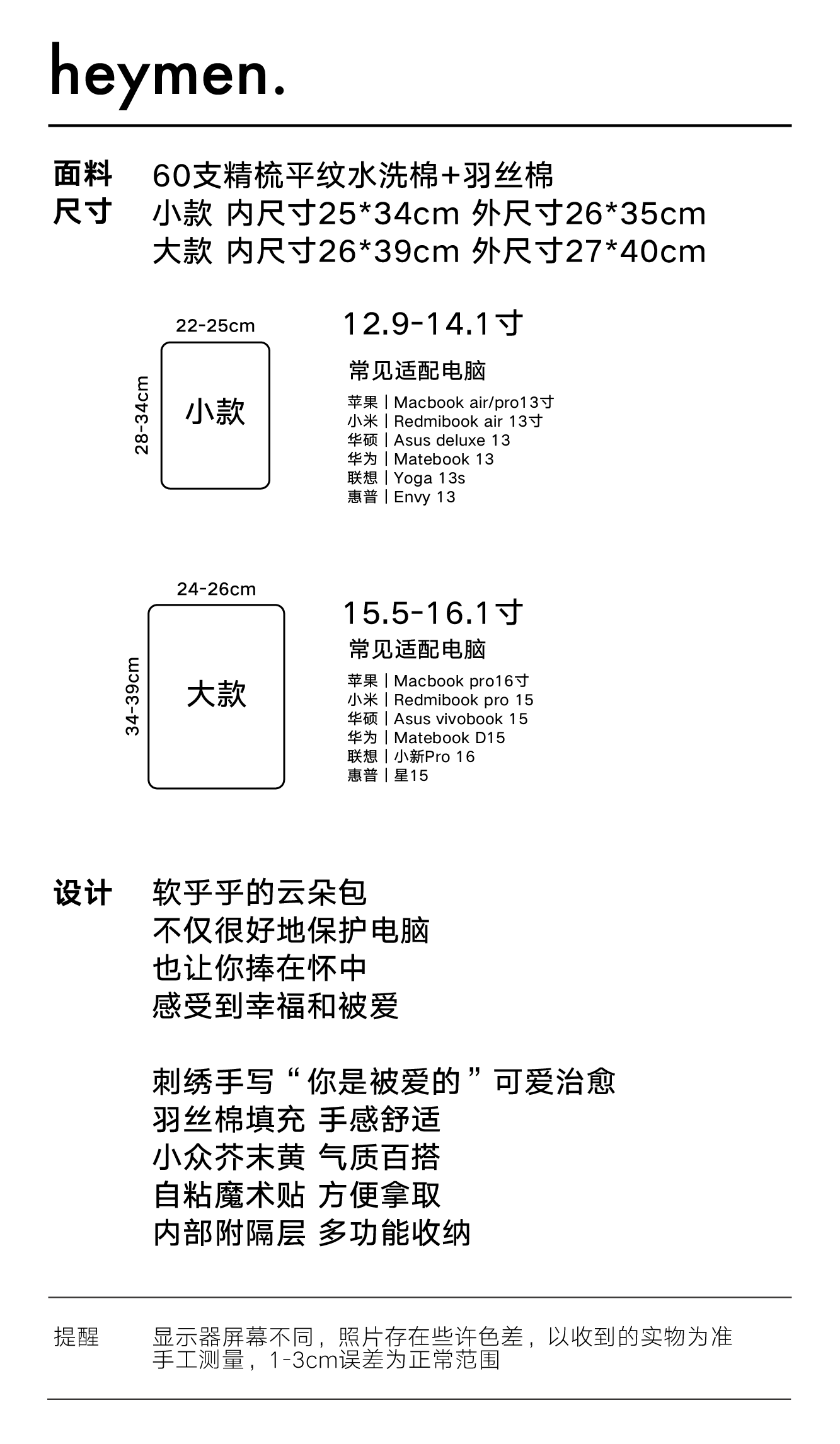 Heymen黑門 軟乎乎 原創設計小雲朵充棉筆記型電腦內膽包13寸15寸