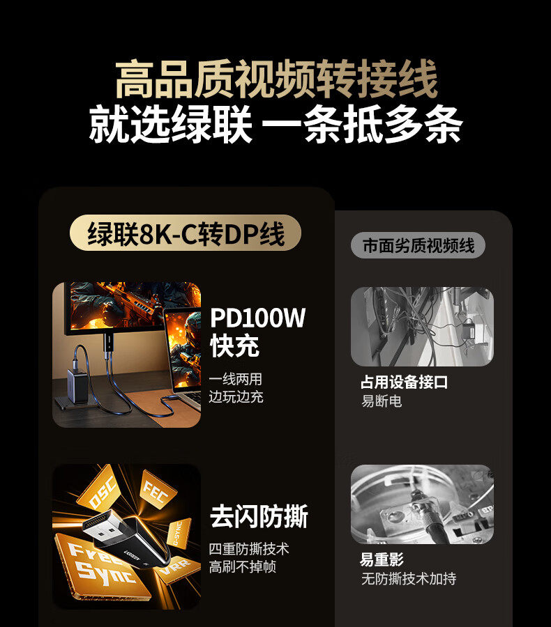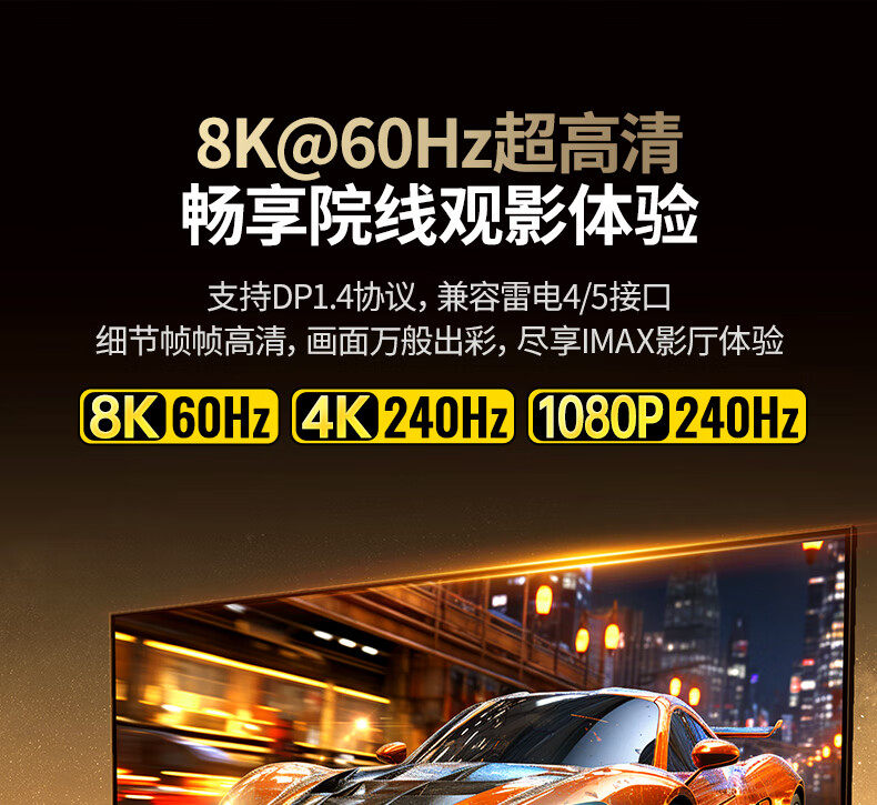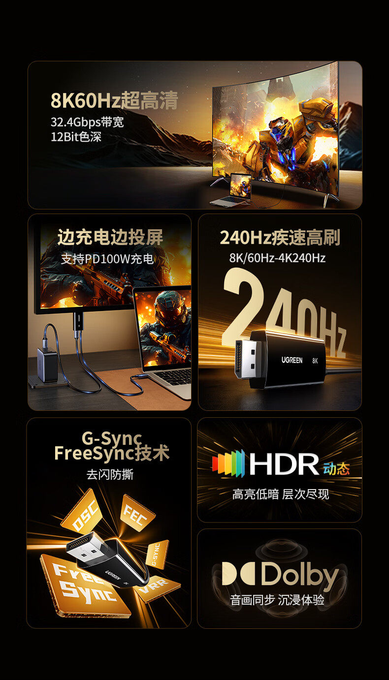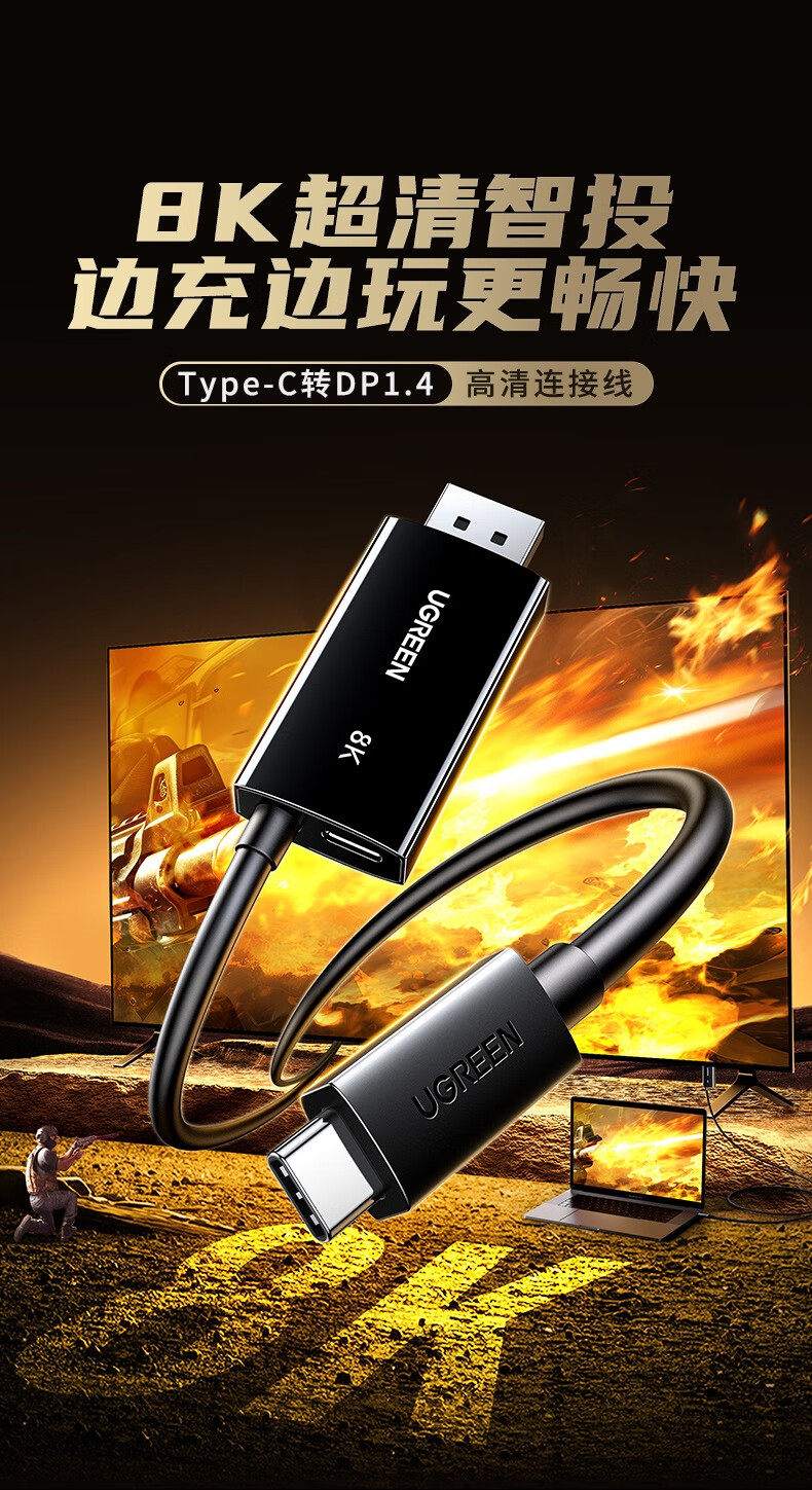 綠聯Type-C轉DP1.4線帶PD100W充電雷電4/5轉換器USB-C轉接8K60Hz