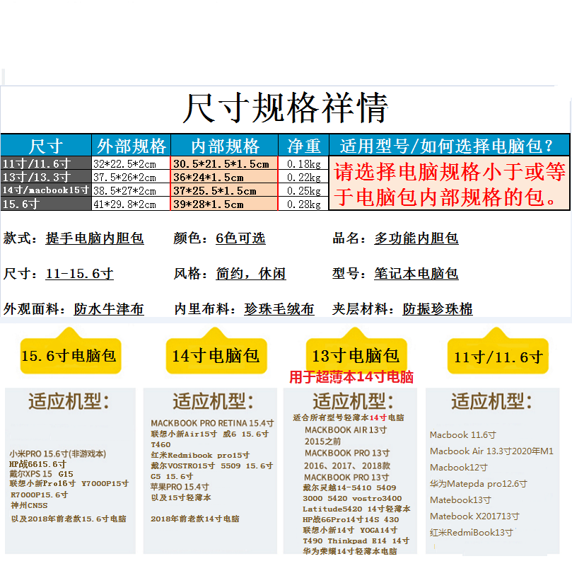 由於電腦有厚有薄,請不要按螢幕尺寸選擇電腦包,要按電腦的長和寬匹配電腦包的內部規格,電腦包的尺寸在下面