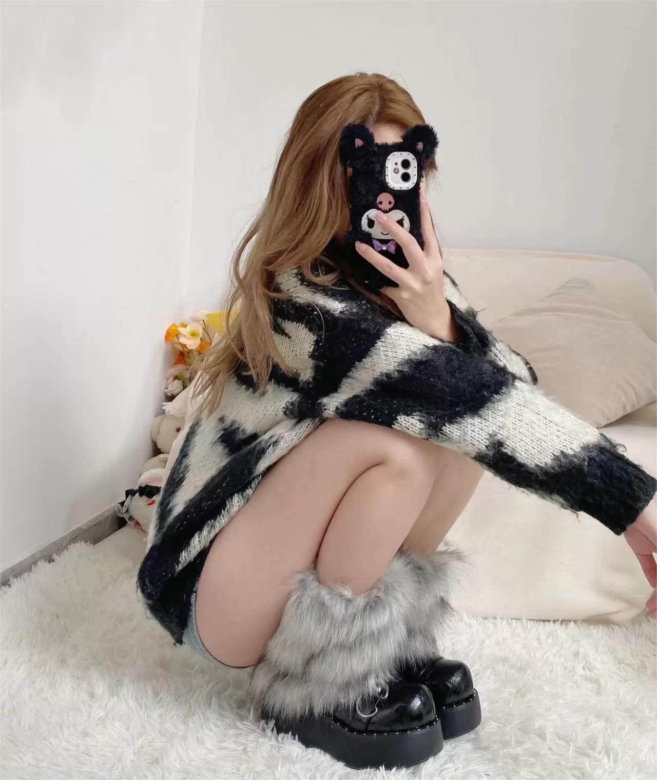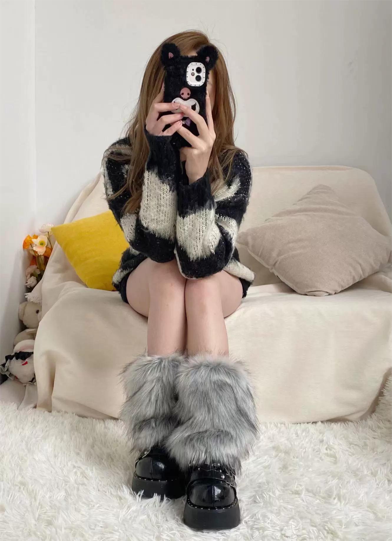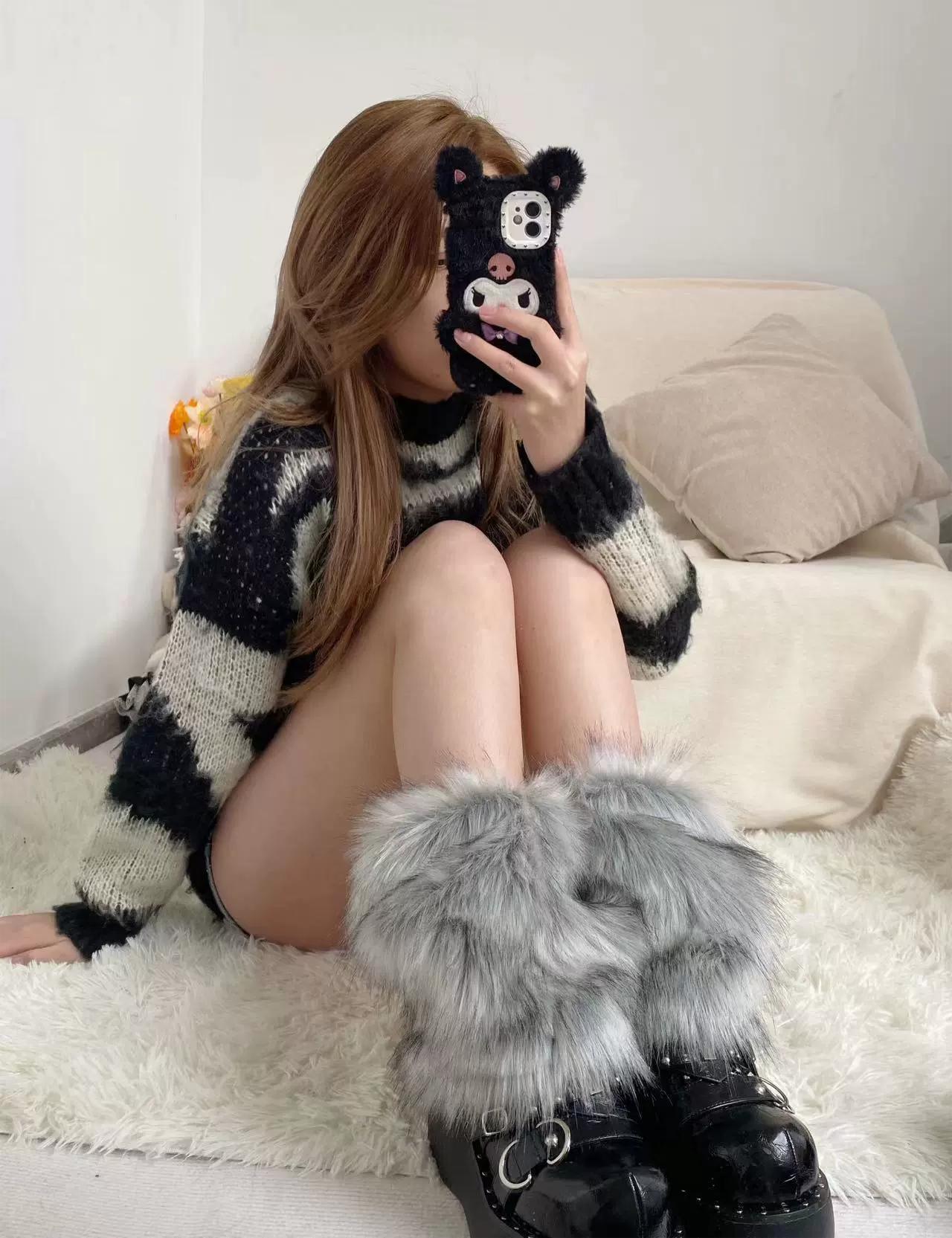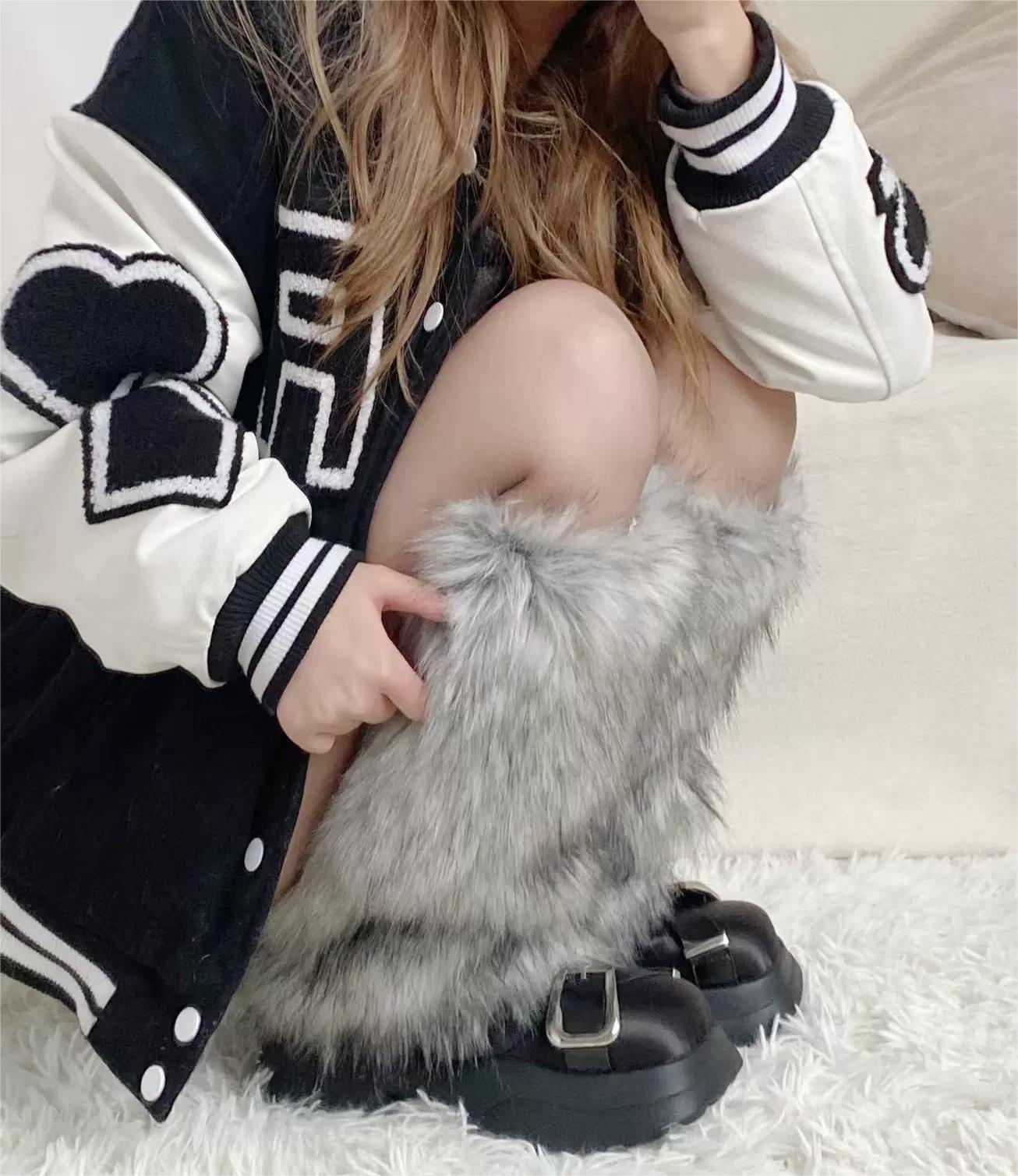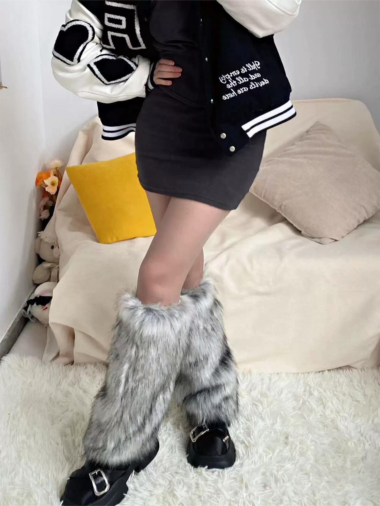 Y2K澁穀辣妹灰黑色漸變毛絨襪套甜酷少女仿狐狸毛秋冬加厚護腿套