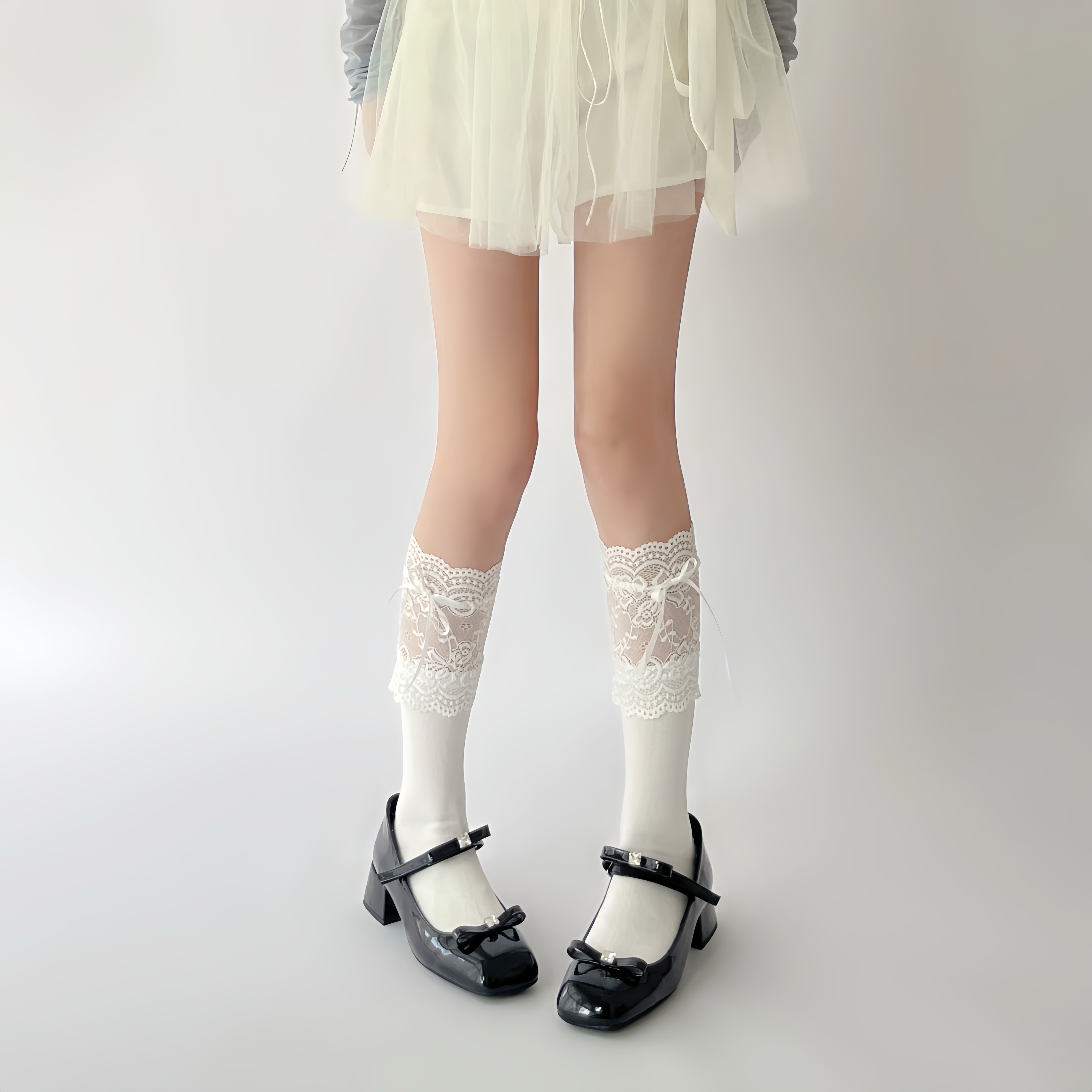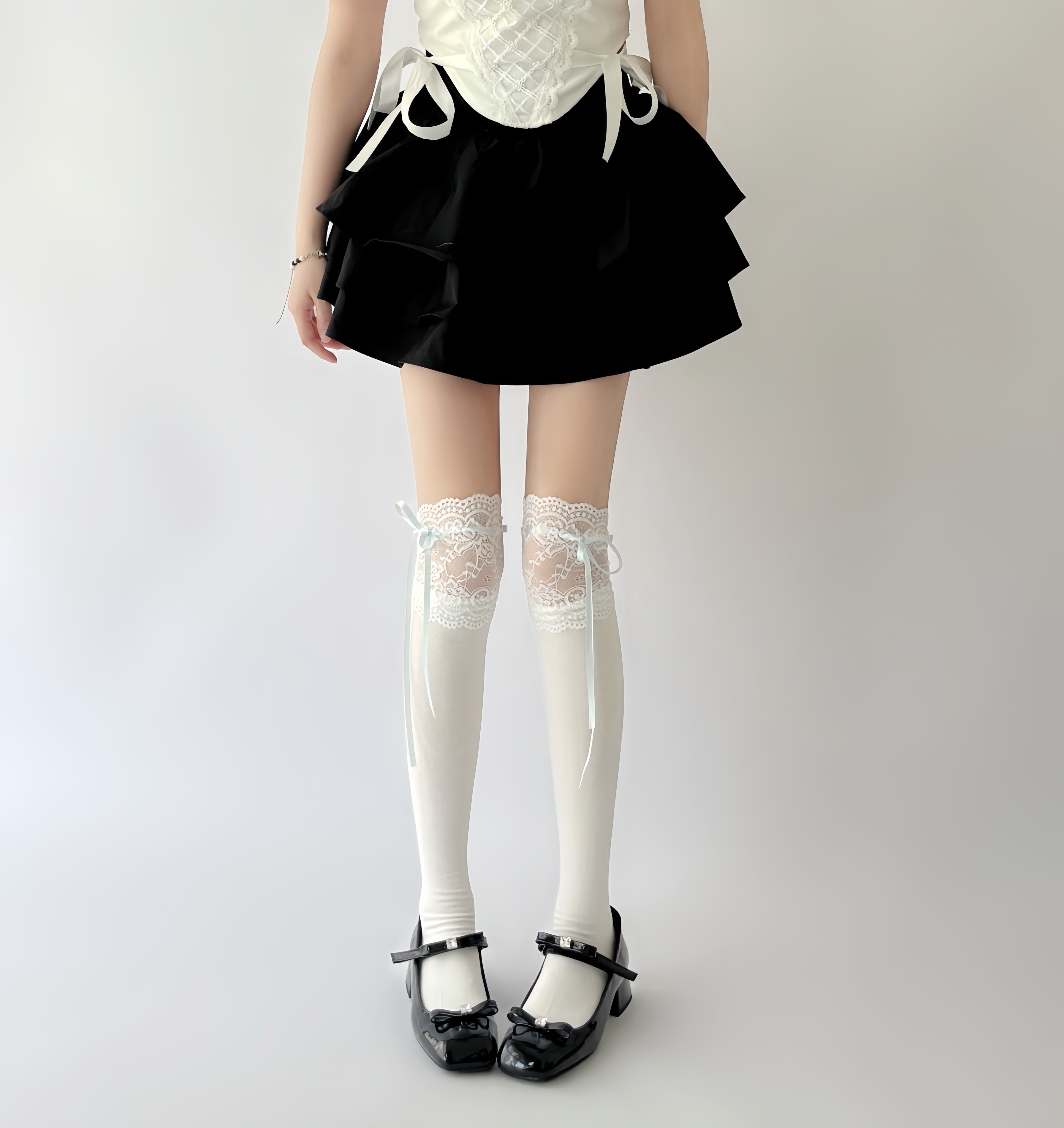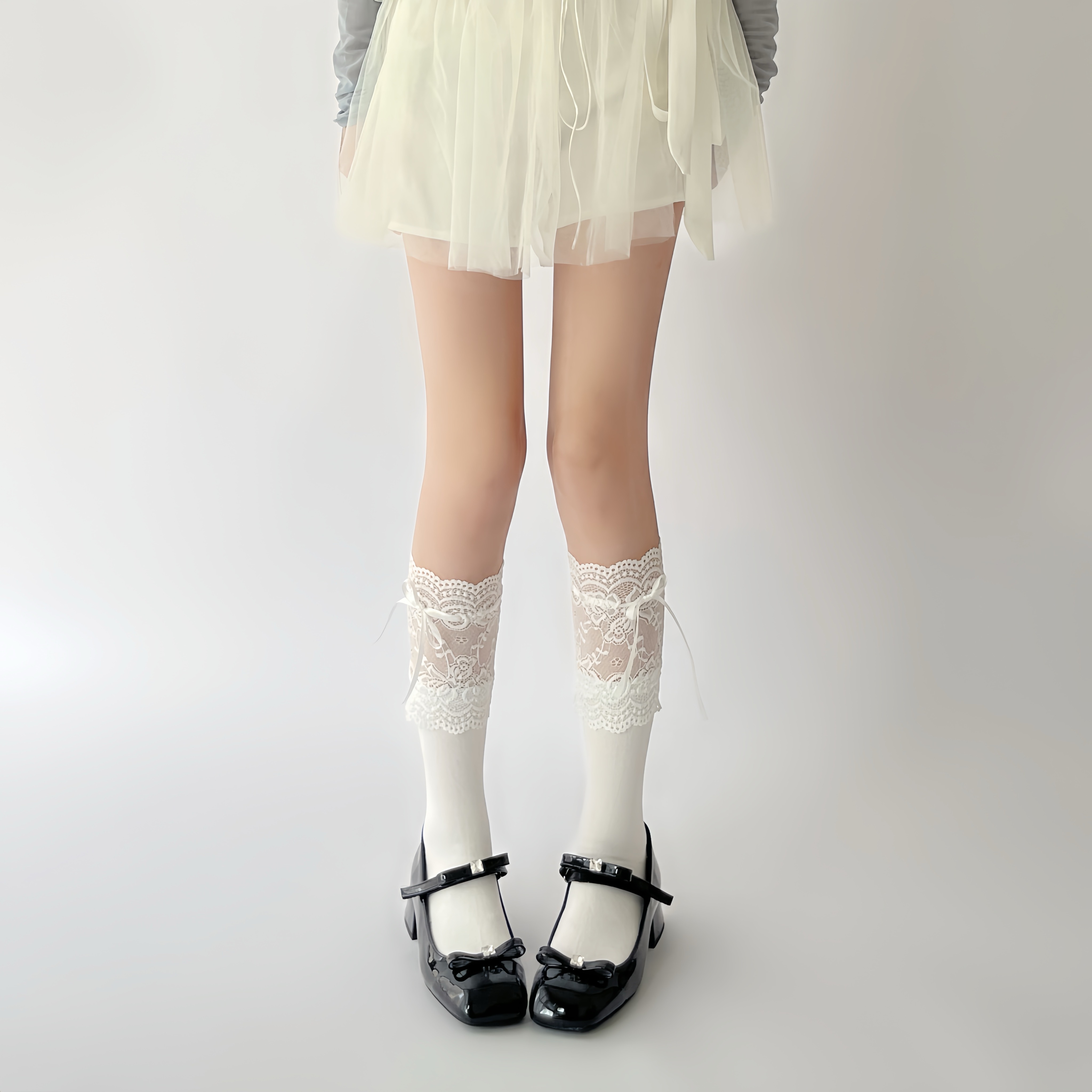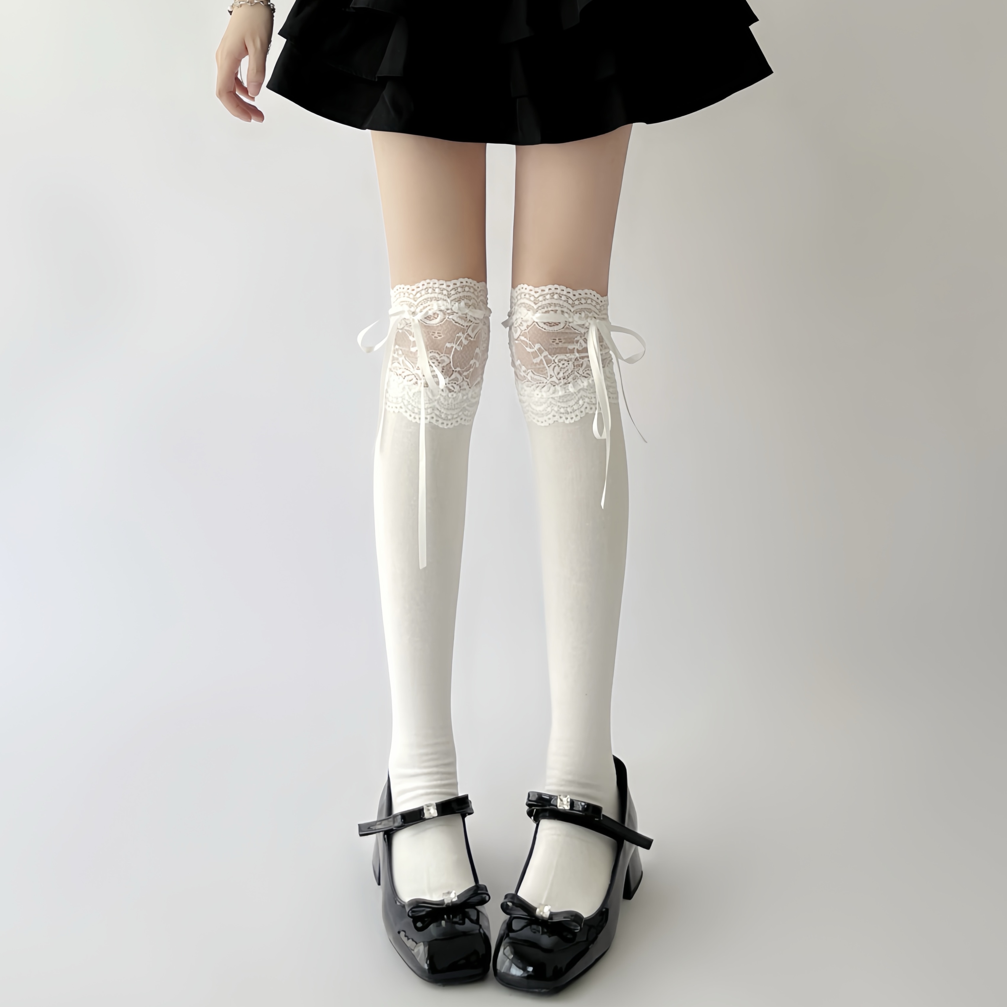 Wuuuus 白色長筒過膝襪夏季薄款蕾絲飄帶蝴蝶結jk日系小腿襪子女