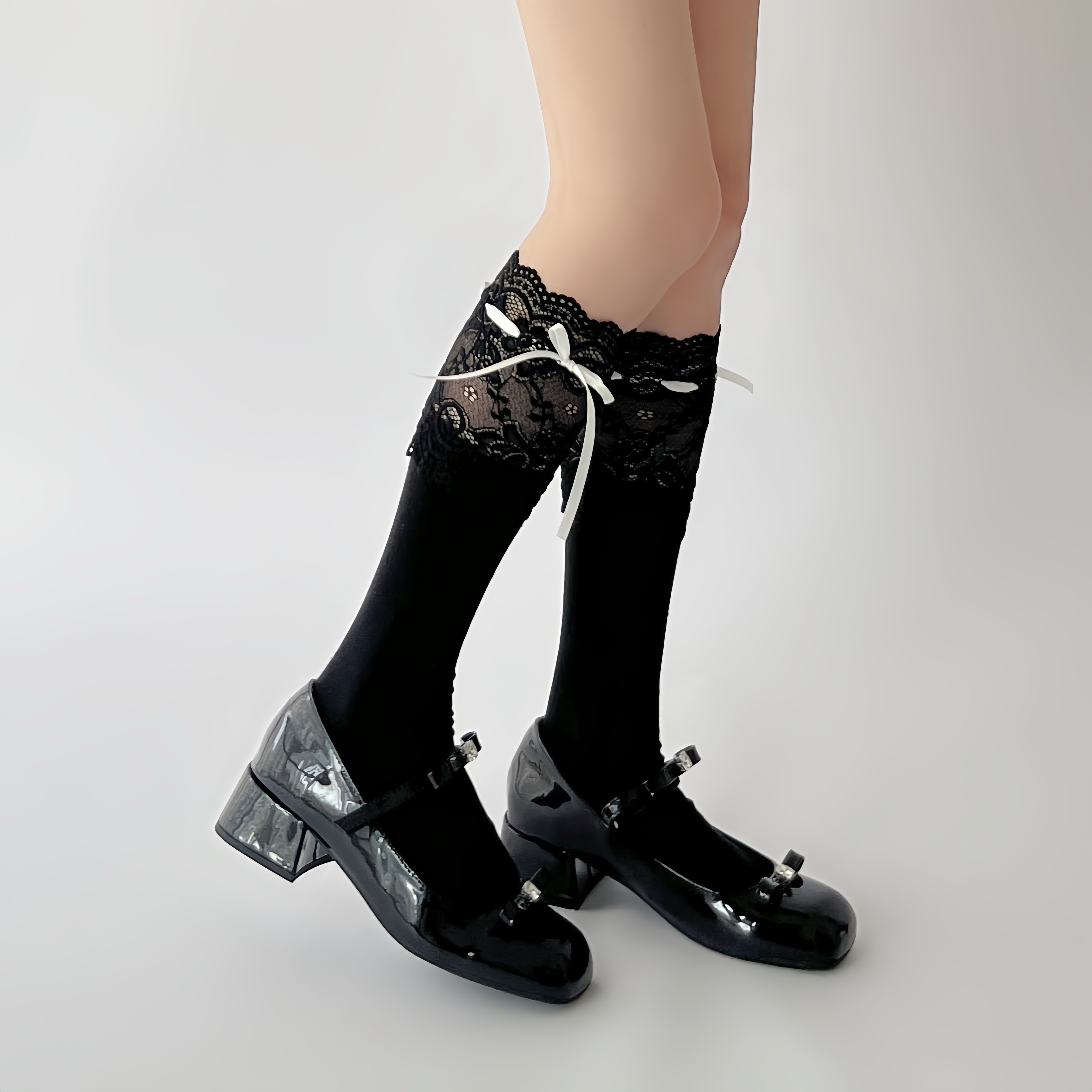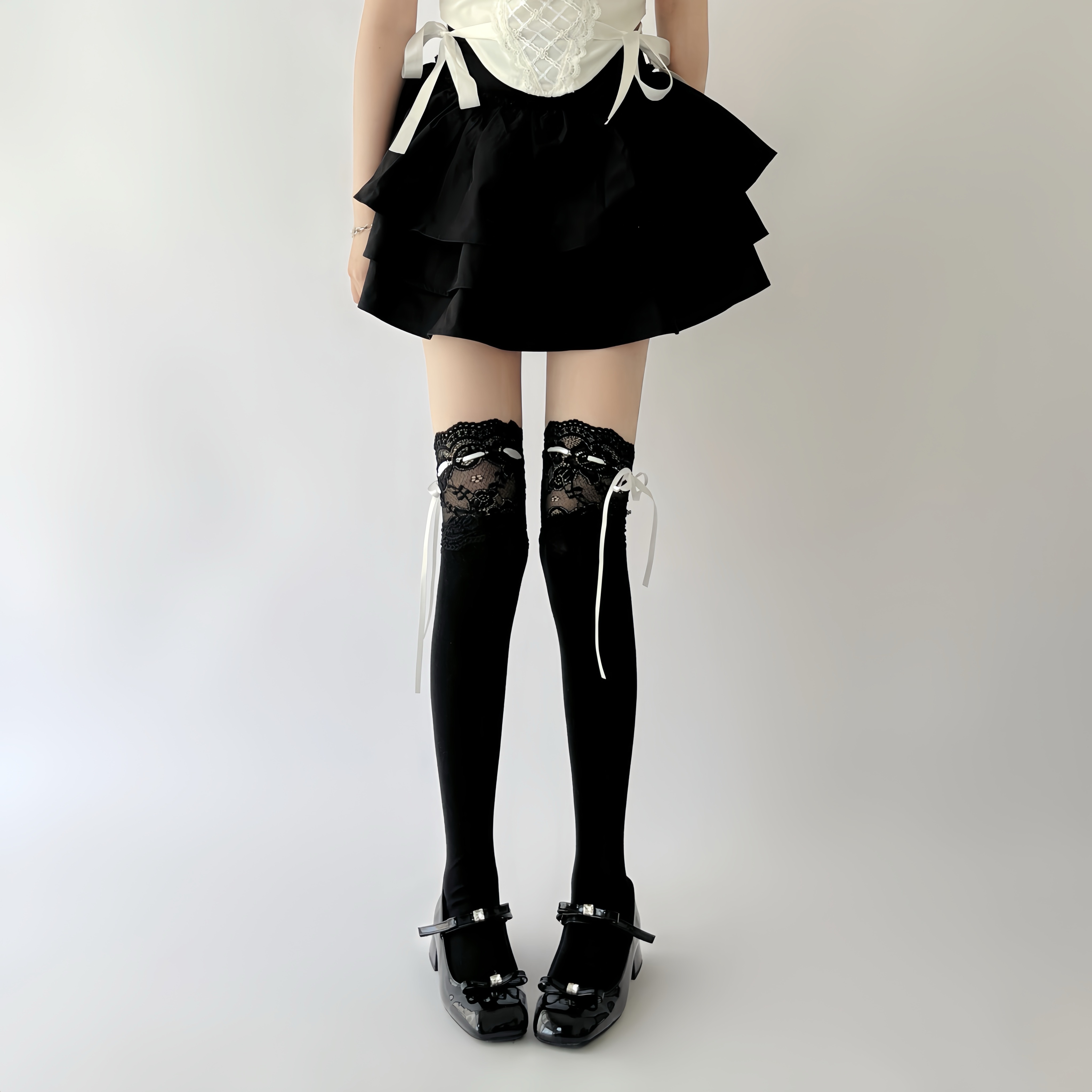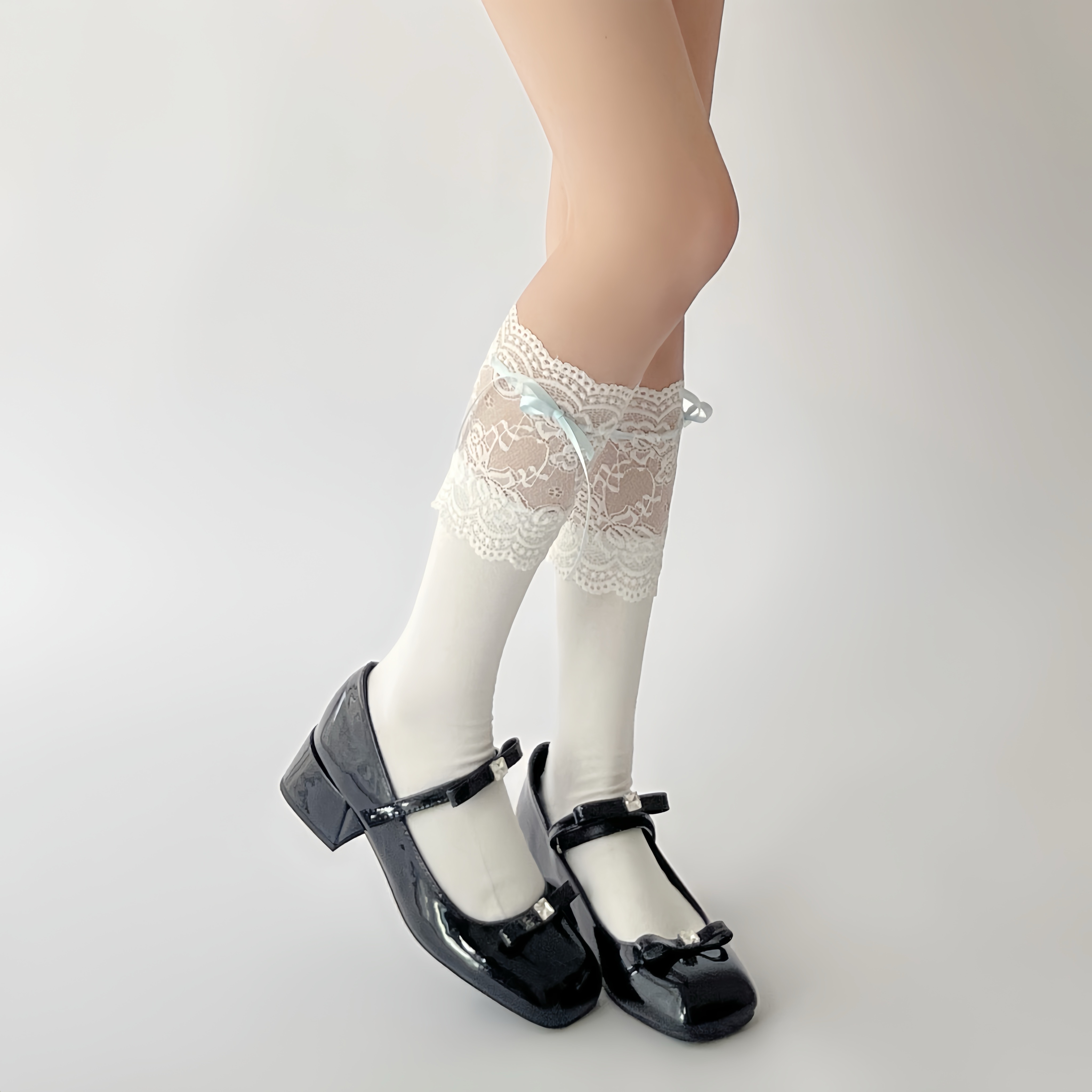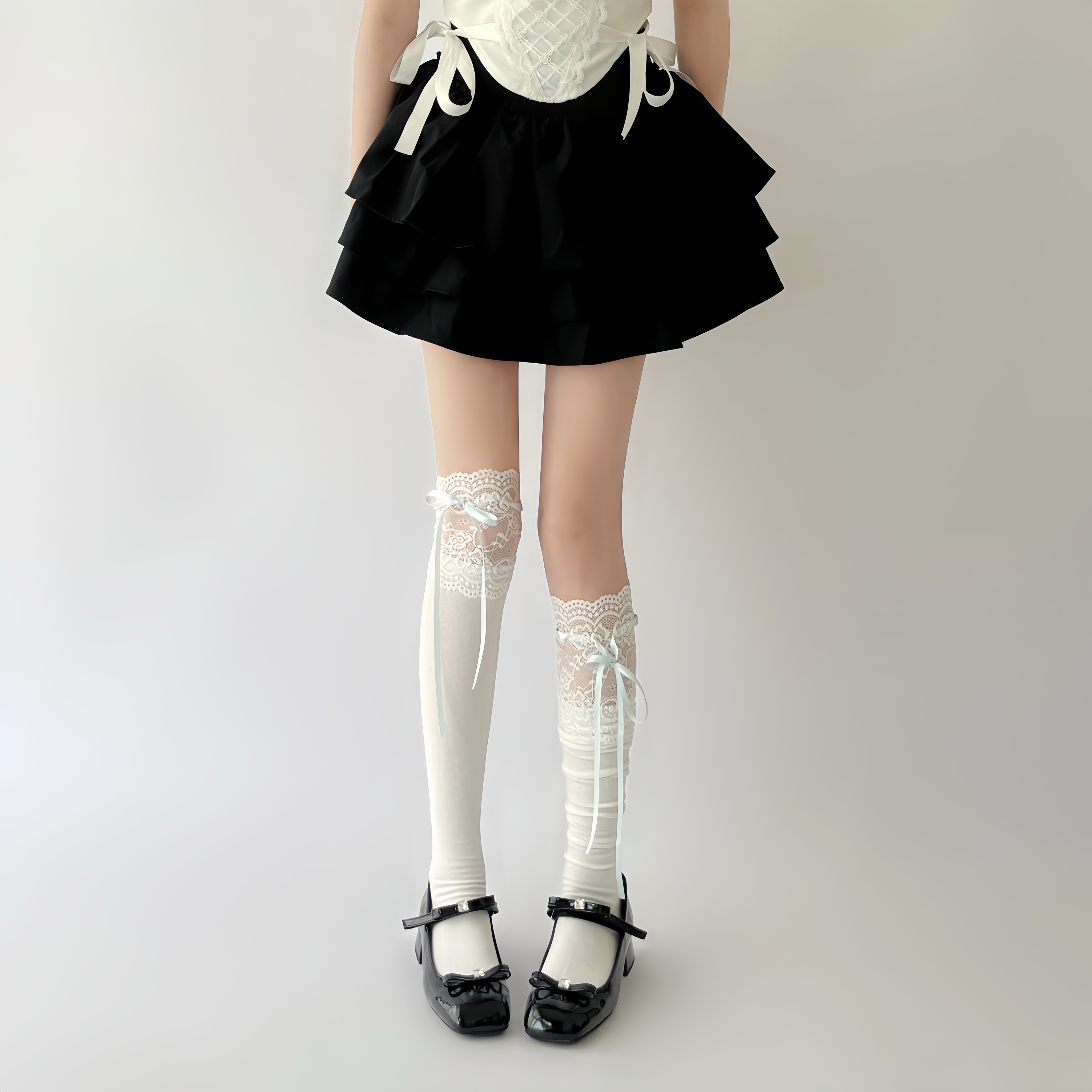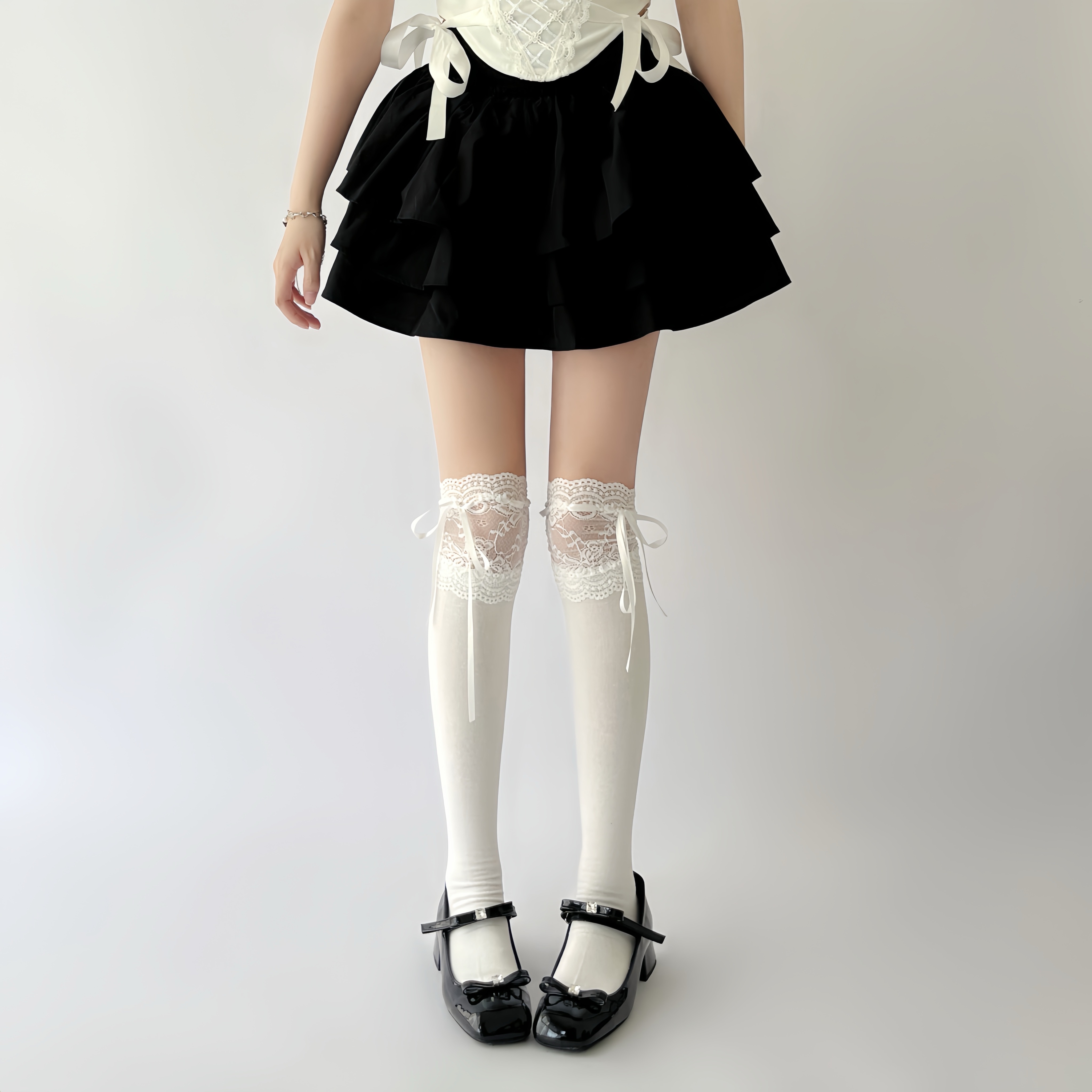Wuuuus 白色長筒過膝襪夏季薄款蕾絲飄帶蝴蝶結jk日系小腿襪子女
