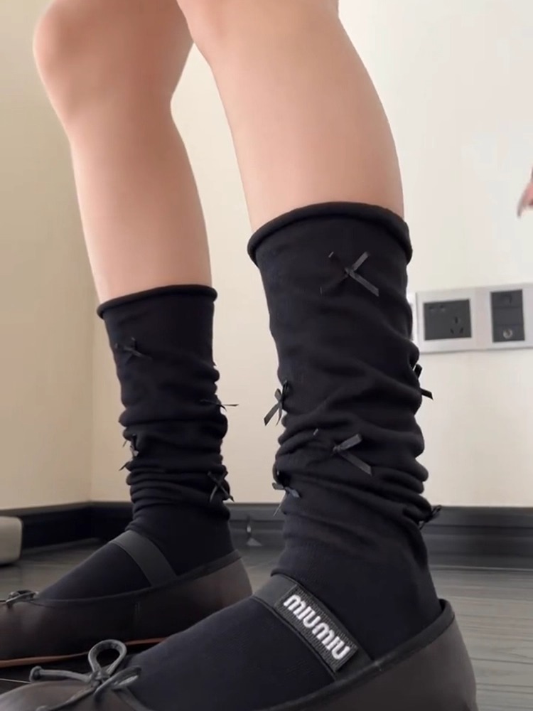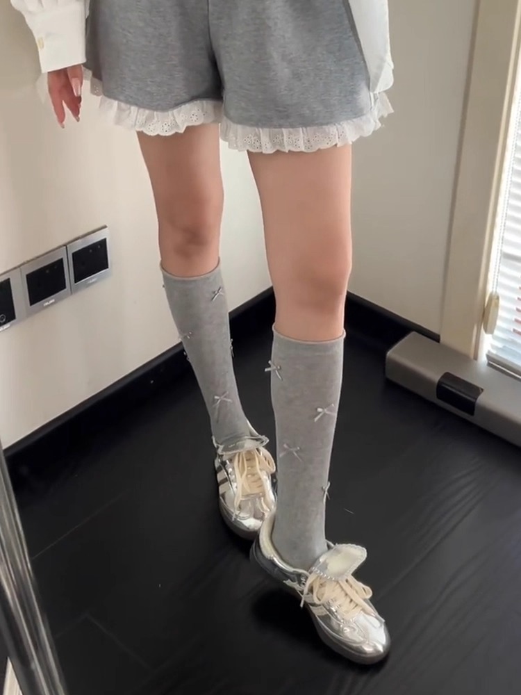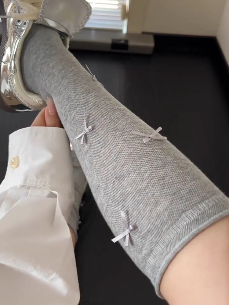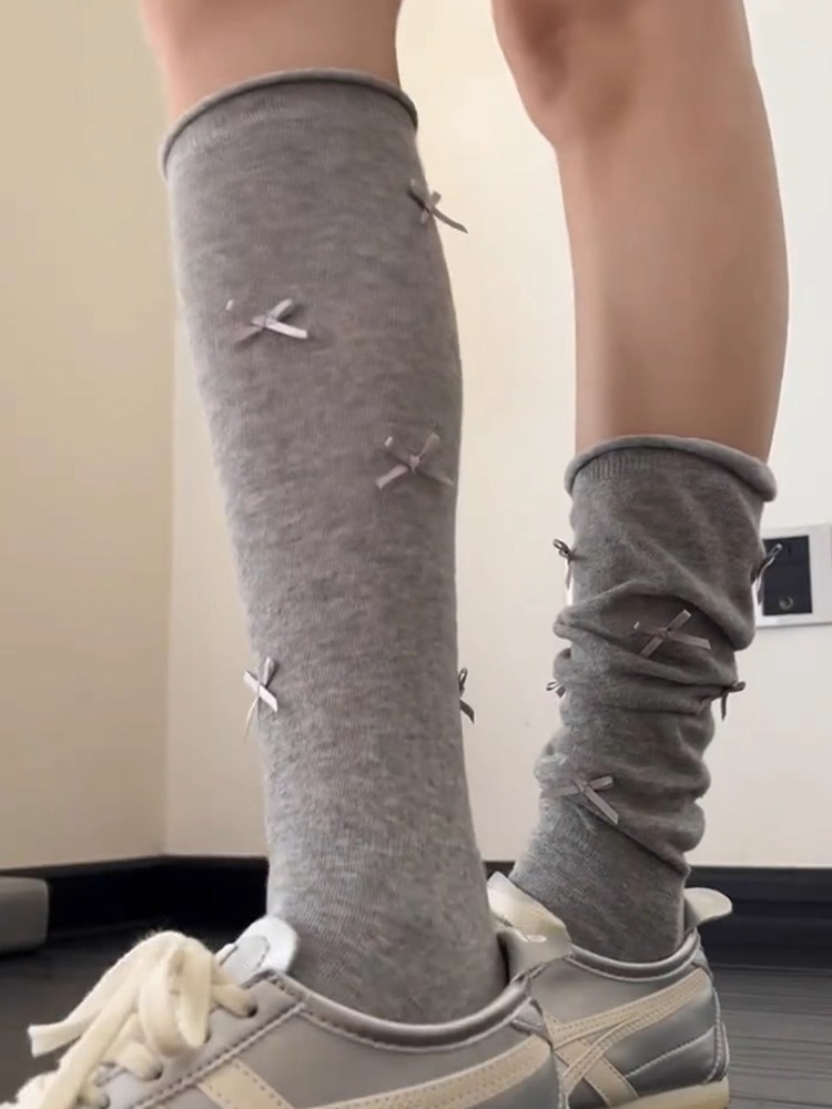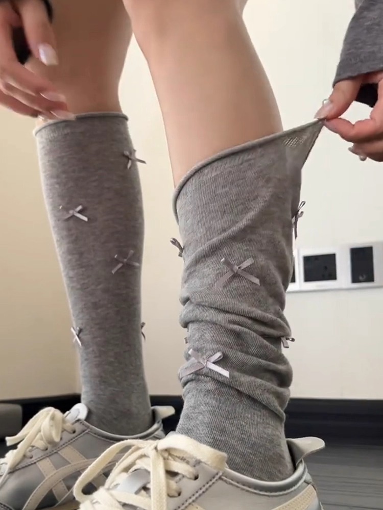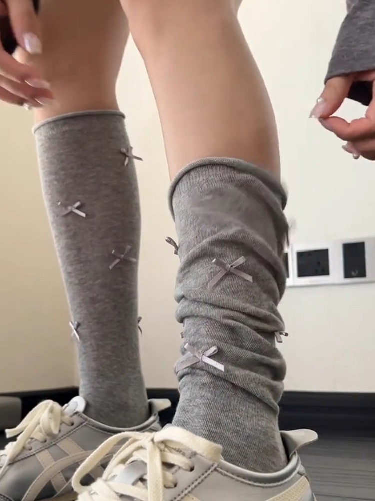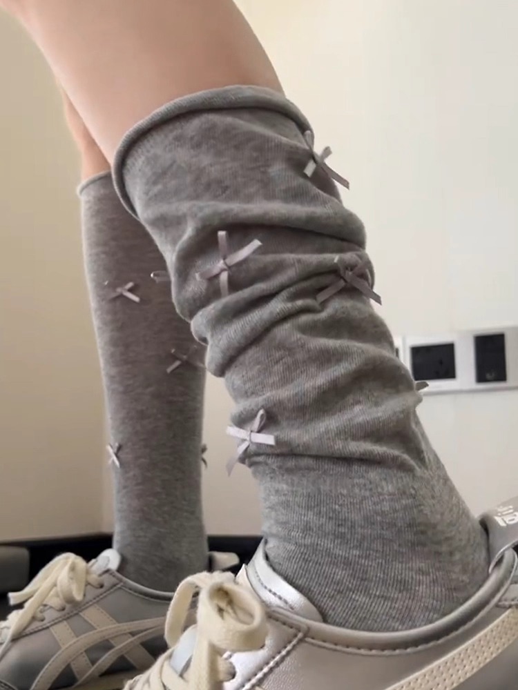 miu裡miu氣的襪子好好看啊~灰色襪子女蝴蝶結堆堆襪高筒春夏棉