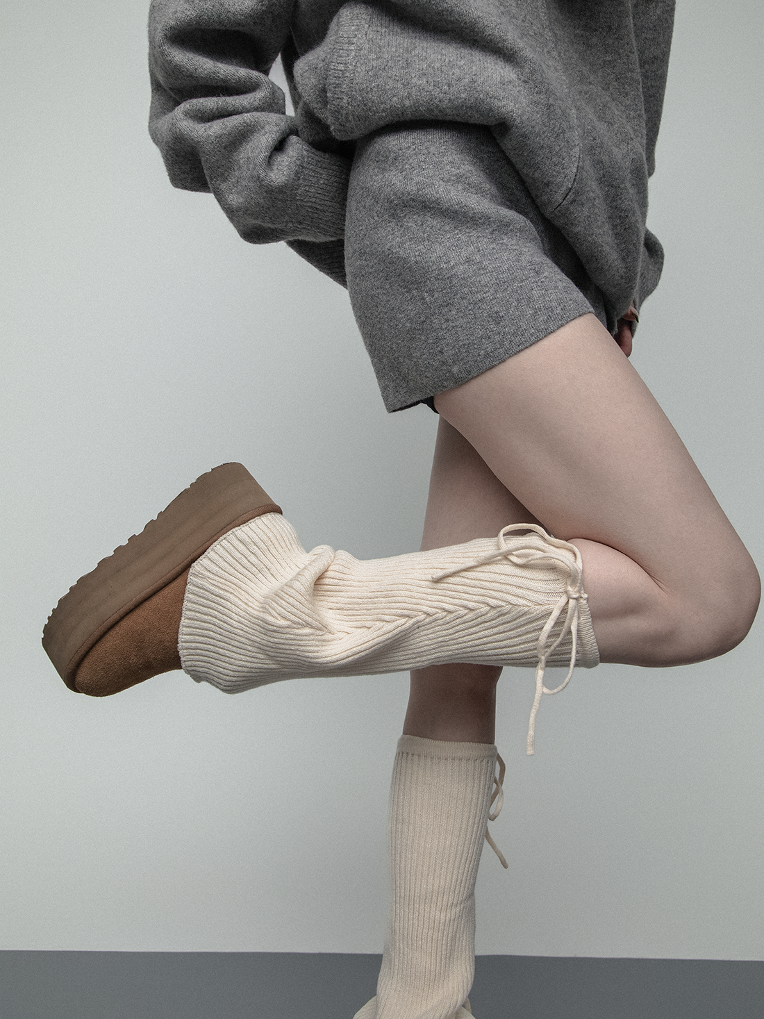 SS2L秋冬純色綁帶蝴蝶結微喇叭針織堆堆襪套雪地靴腿套曡穿小腿襪
