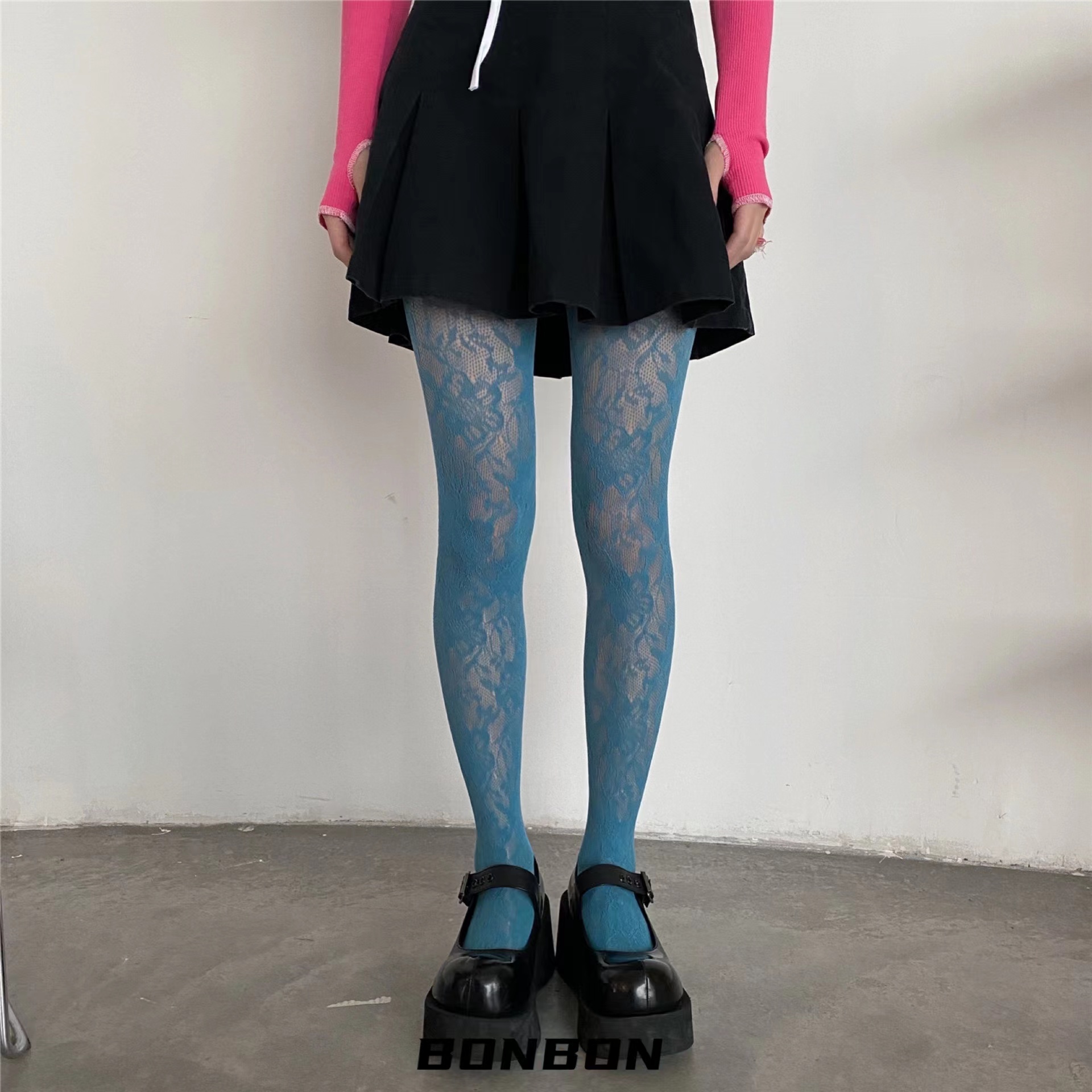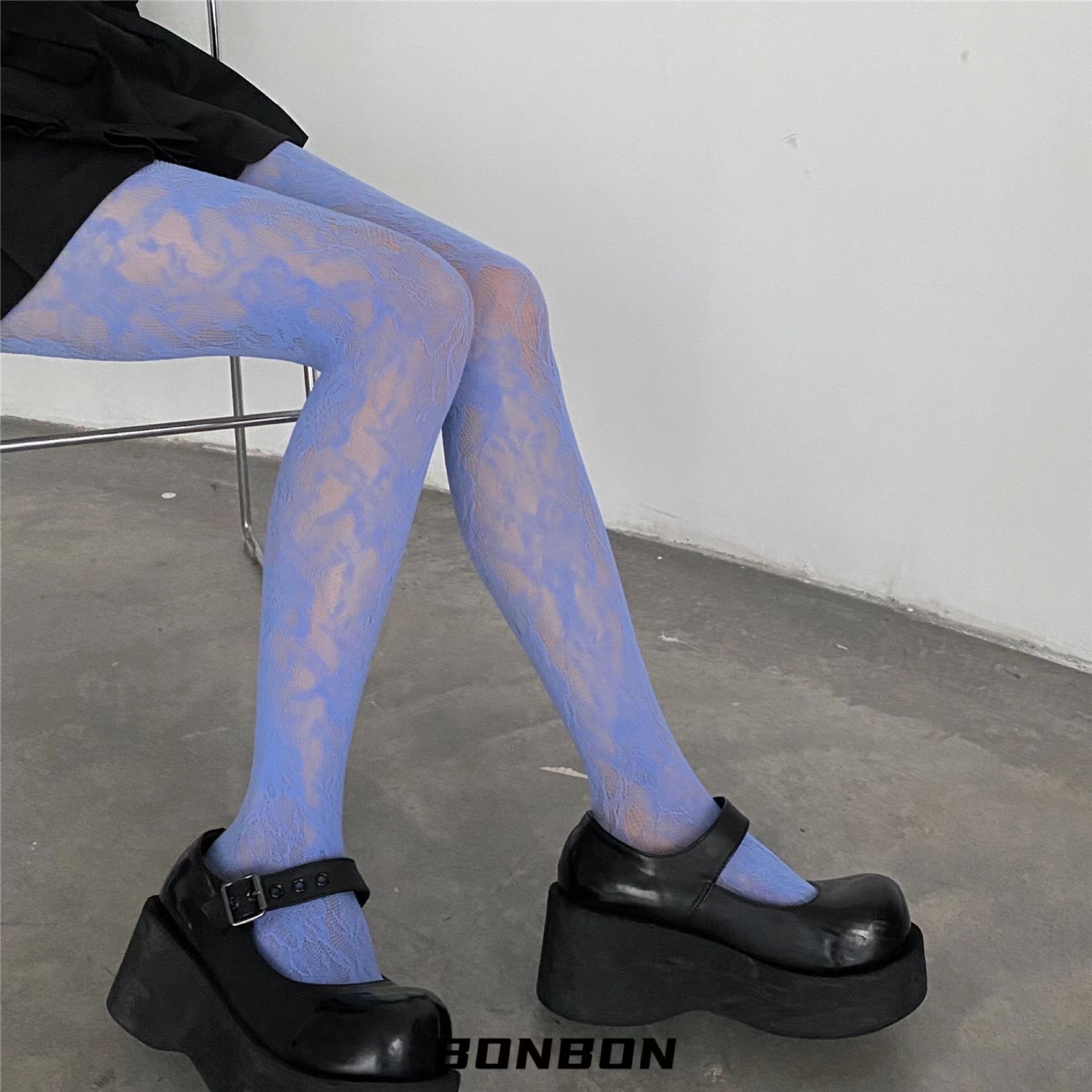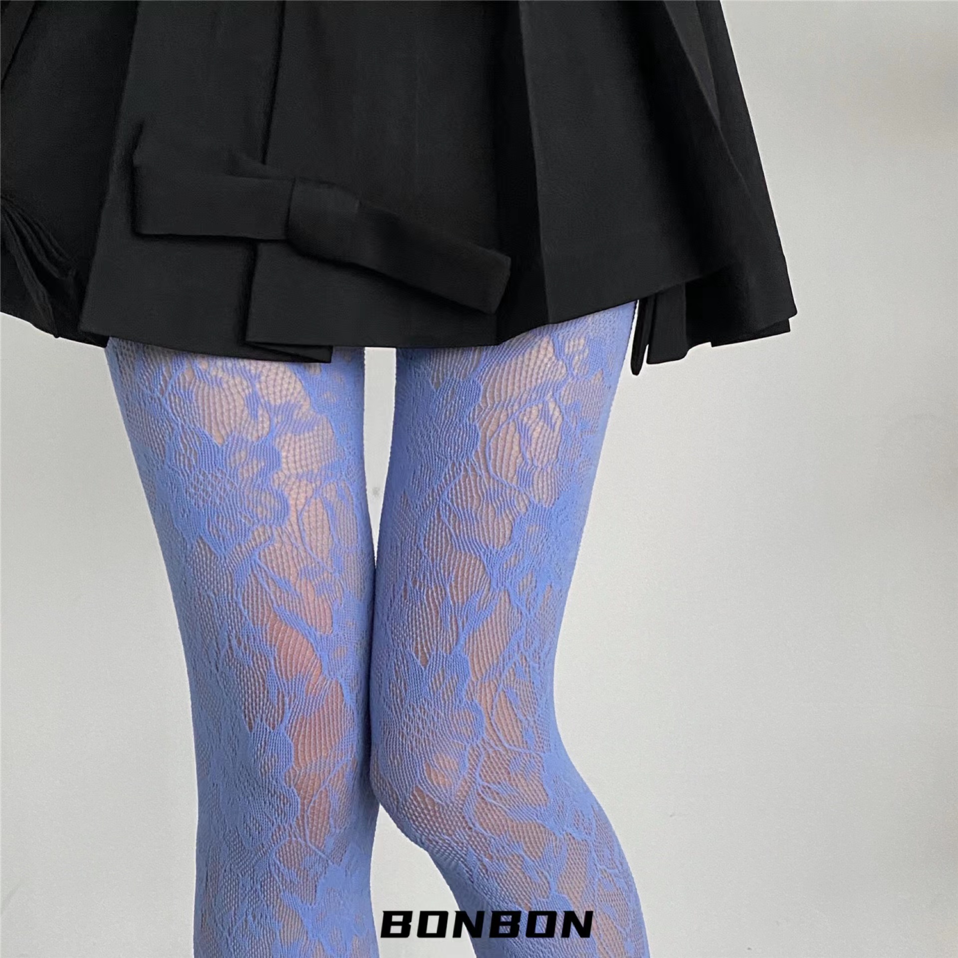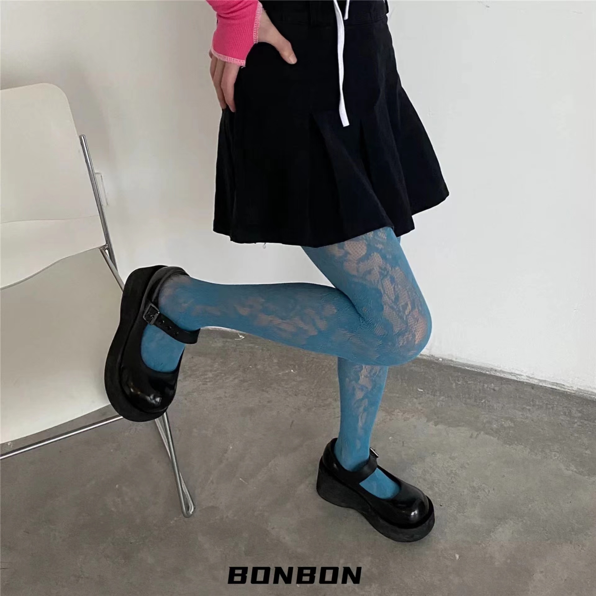 BON 春夏小衆彩色連褲襪盛開的鮮花純色蕾絲網襪甜酷辣妹絲襪