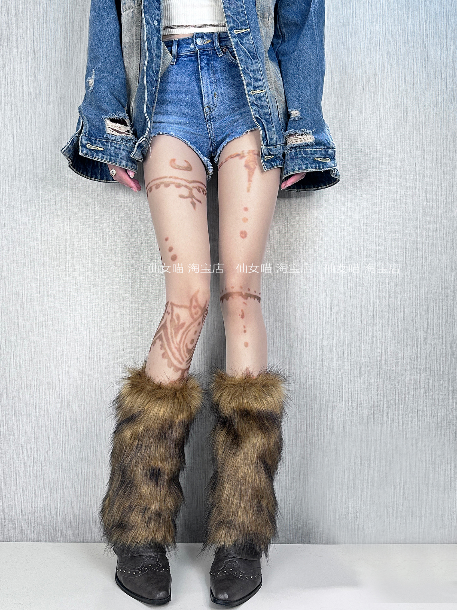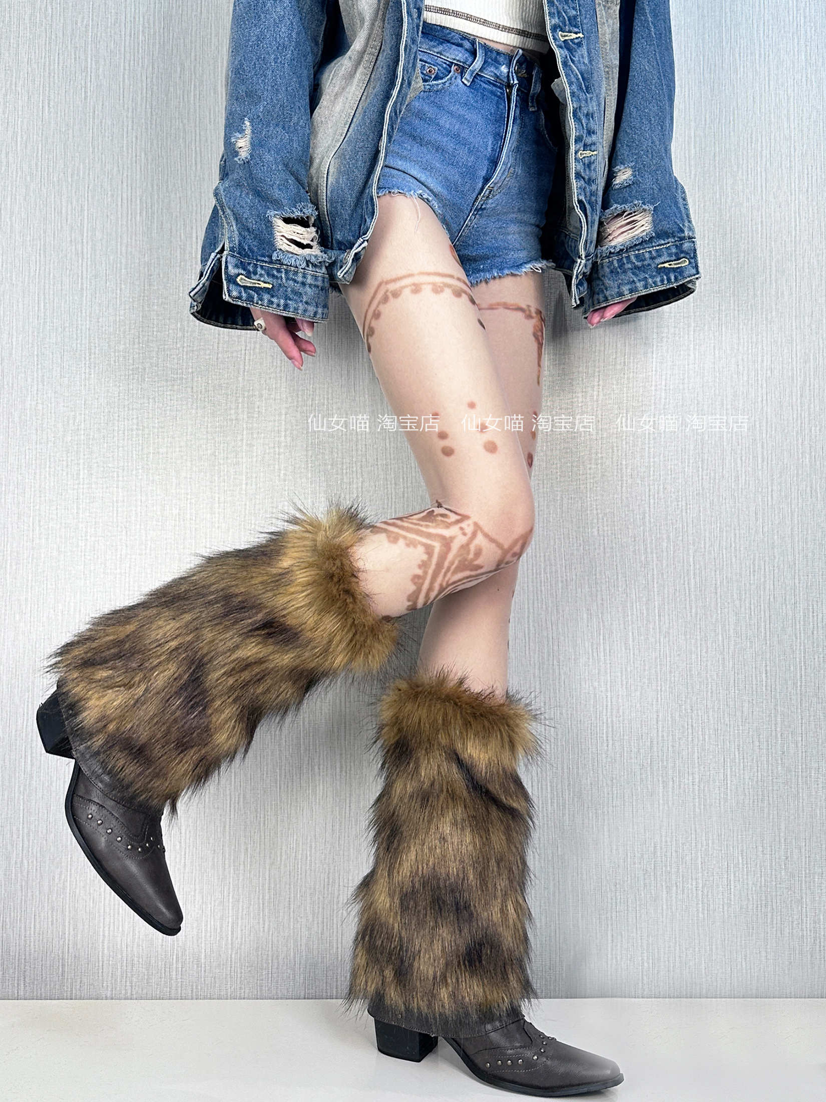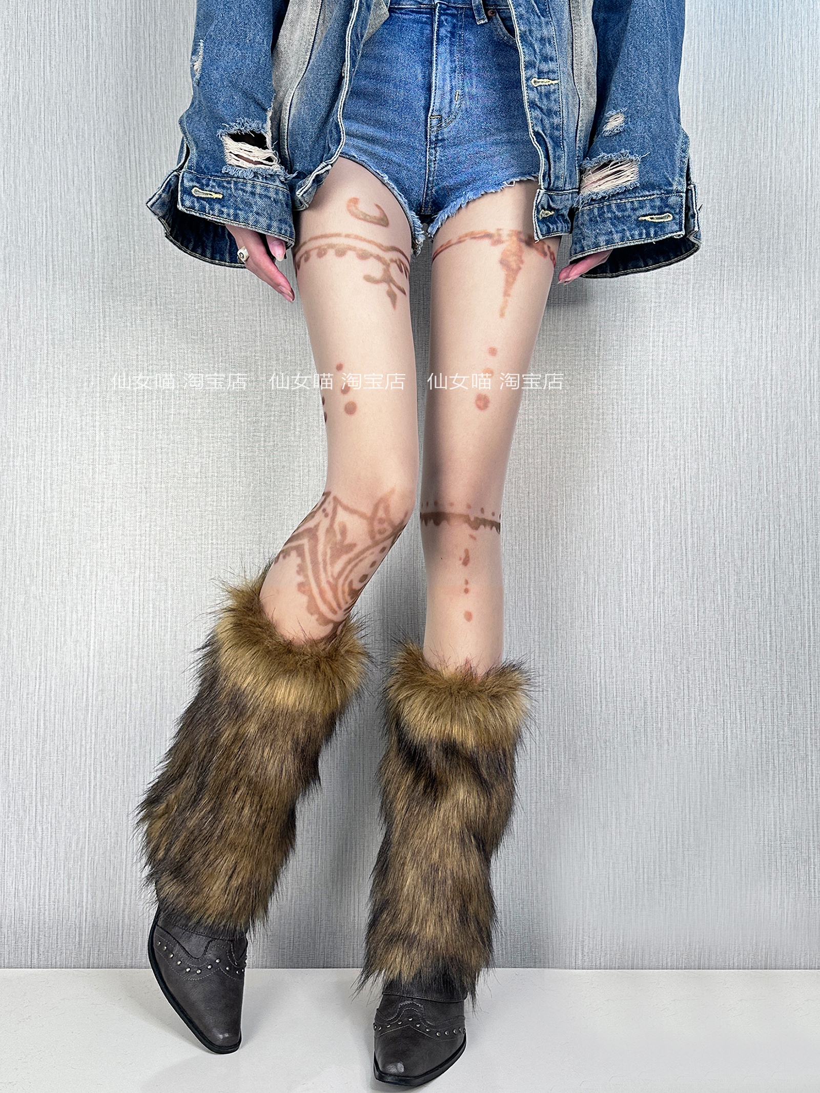 Y2K黃棕色漸變毛毛襪套女秋冬美拉德復古保暖仿狐狸皮草毛絨腿套